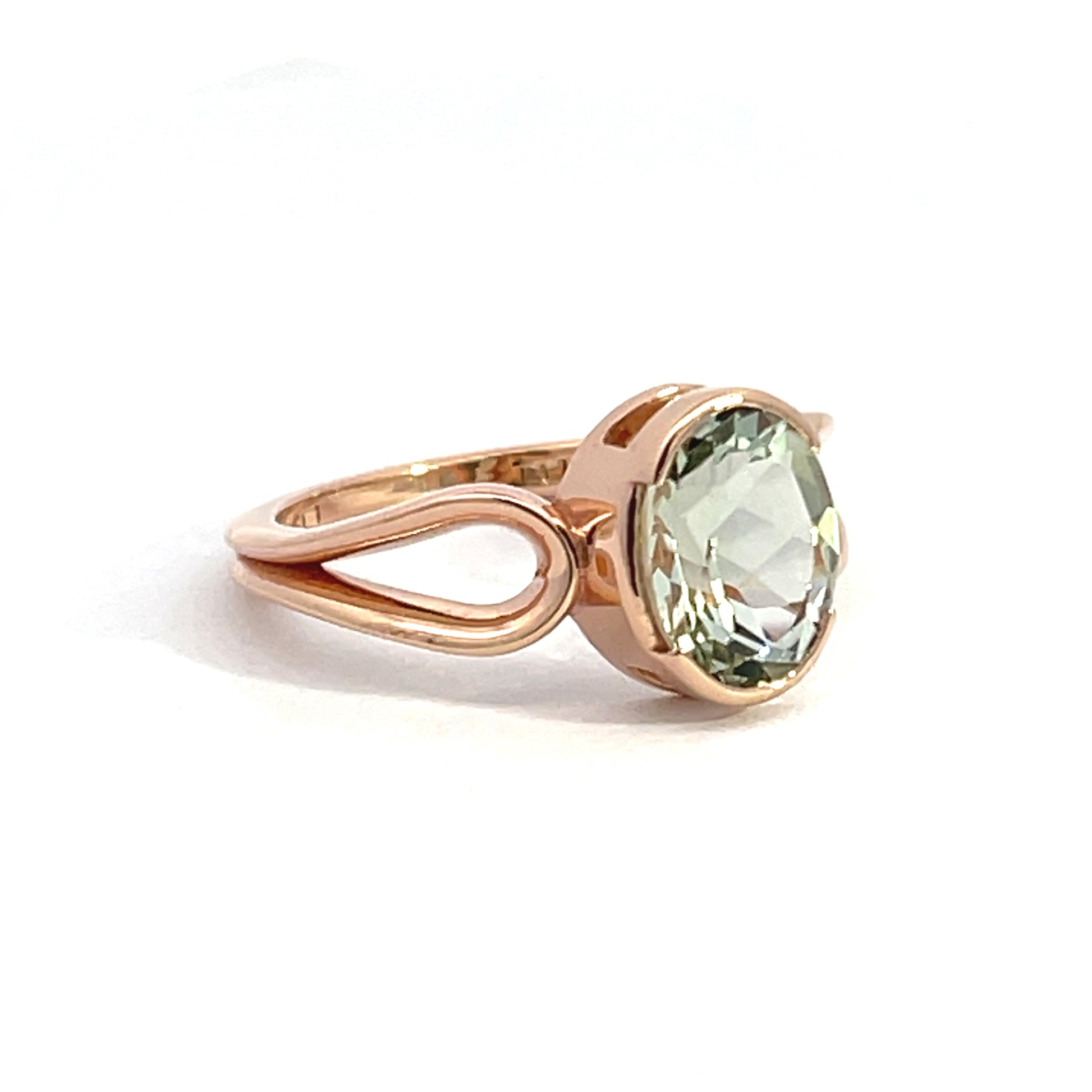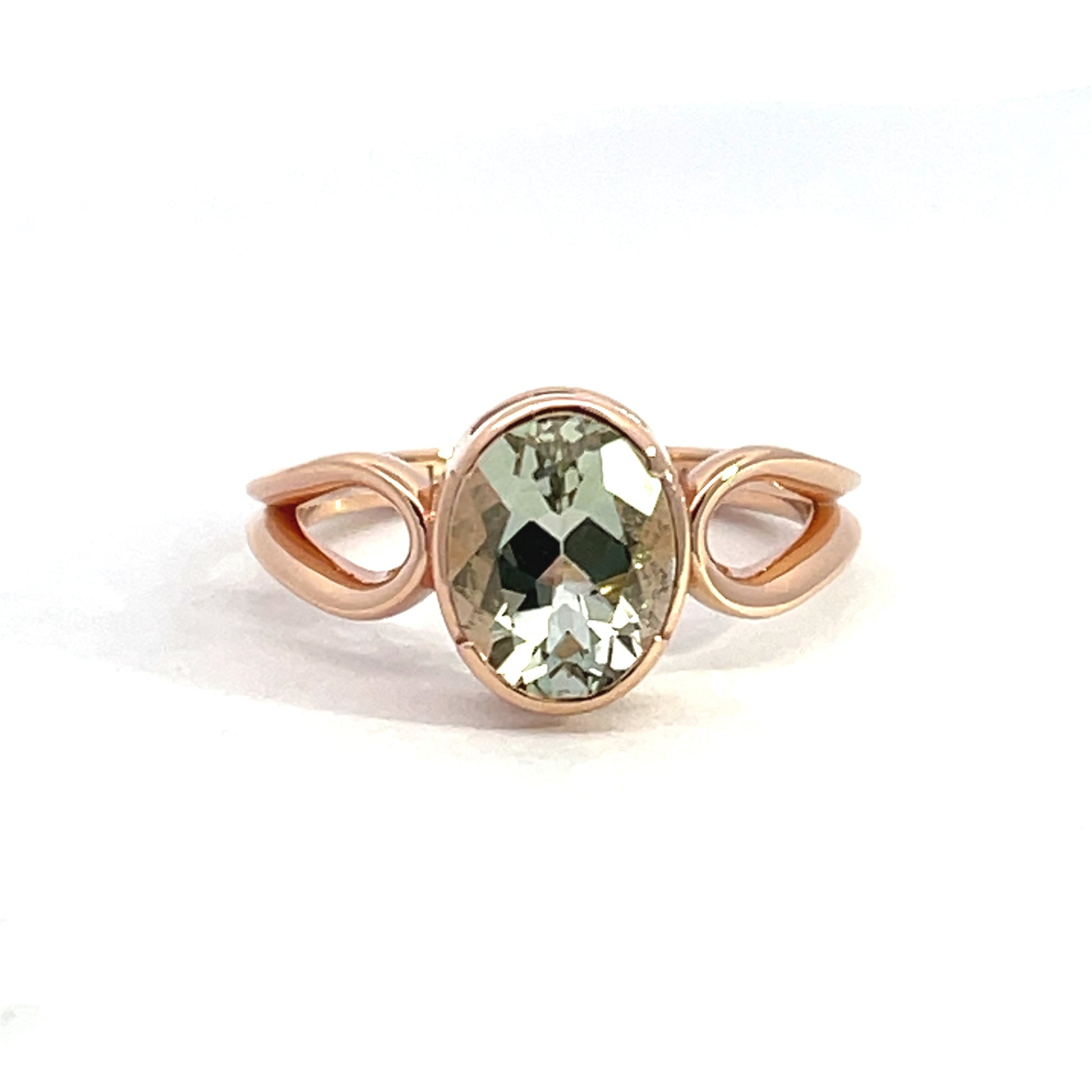 A 14k Rose gold ring set with a 1.65carat oval green quartz. Ring size 7. This ring was designed and made by Faron Justice.