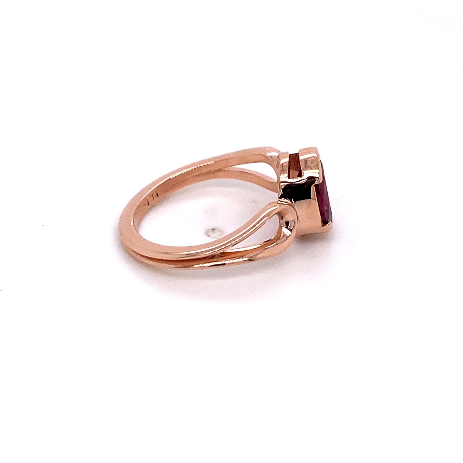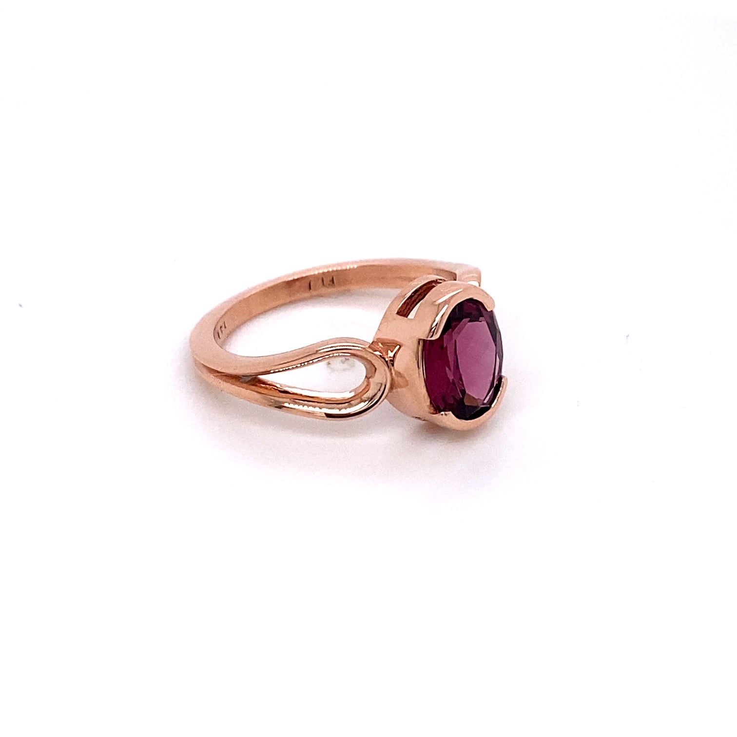 At the center is a vivid 9mm x 7mm oval rhodolite garnet, weighing 2.3 carats. Its hue leans into deep magenta with undertones of plum—richer than traditional red garnet and more dynamic under changing light. Set in warm 14k rose gold, the garnet's bold brilliance is elevated by the metal’s soft, glowing tone. The pairing of these two elements—garnet and rose gold—strikes a visual balance that is at once feminine and powerful, vintage and contemporary.