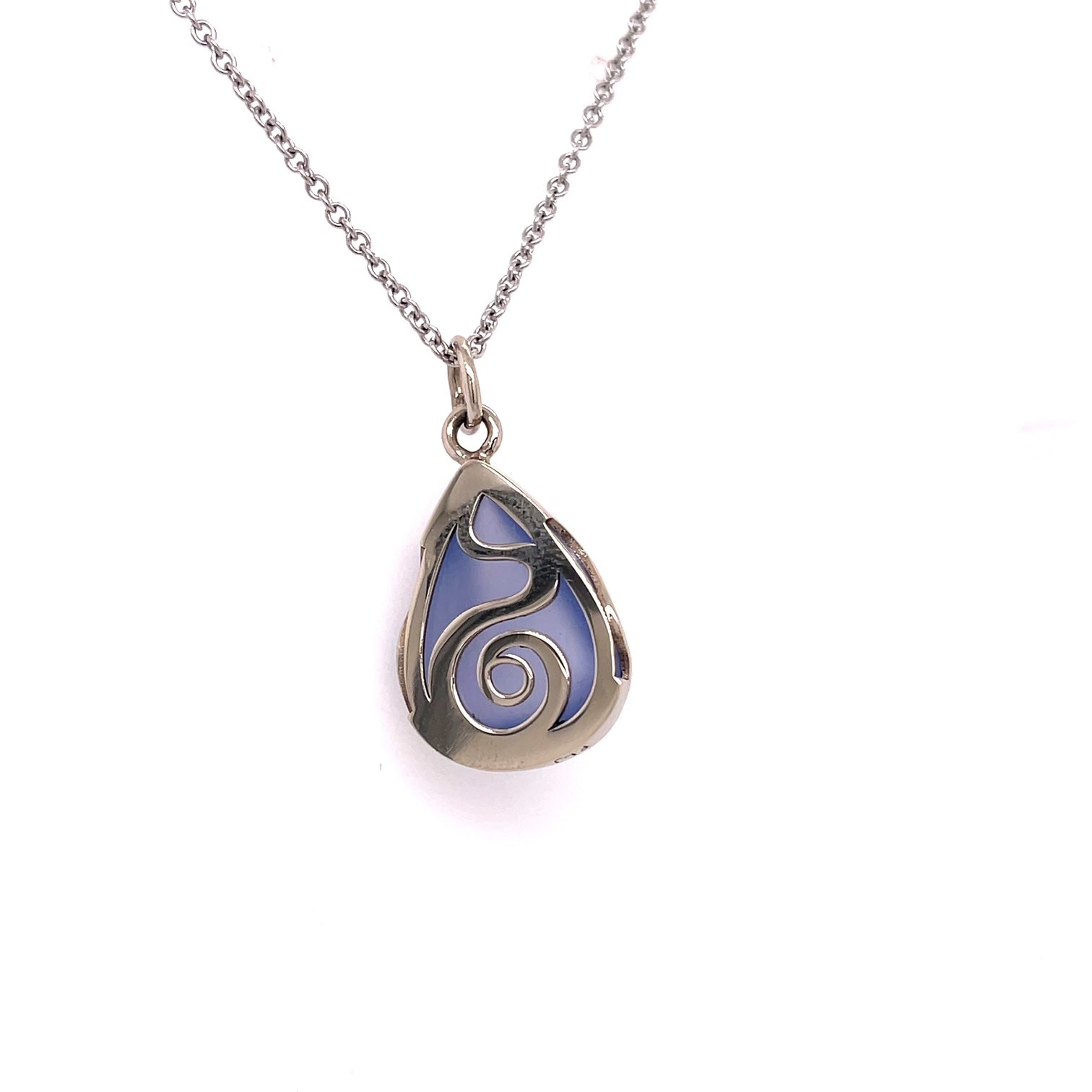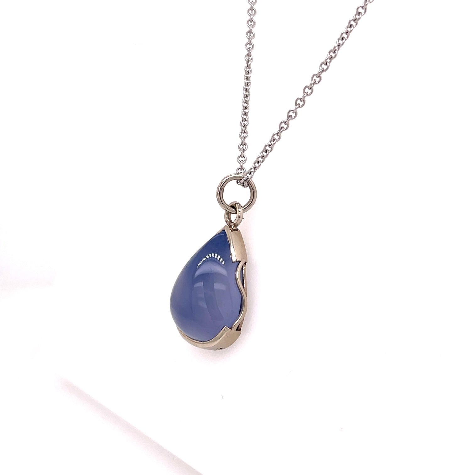 A 14k white gold pendant set with one 10.49 carat pearshape blue chalcedony, untreated from Nambia. On a 14k 16" white gold chain, this necklace was made and designed by Faron Justice.