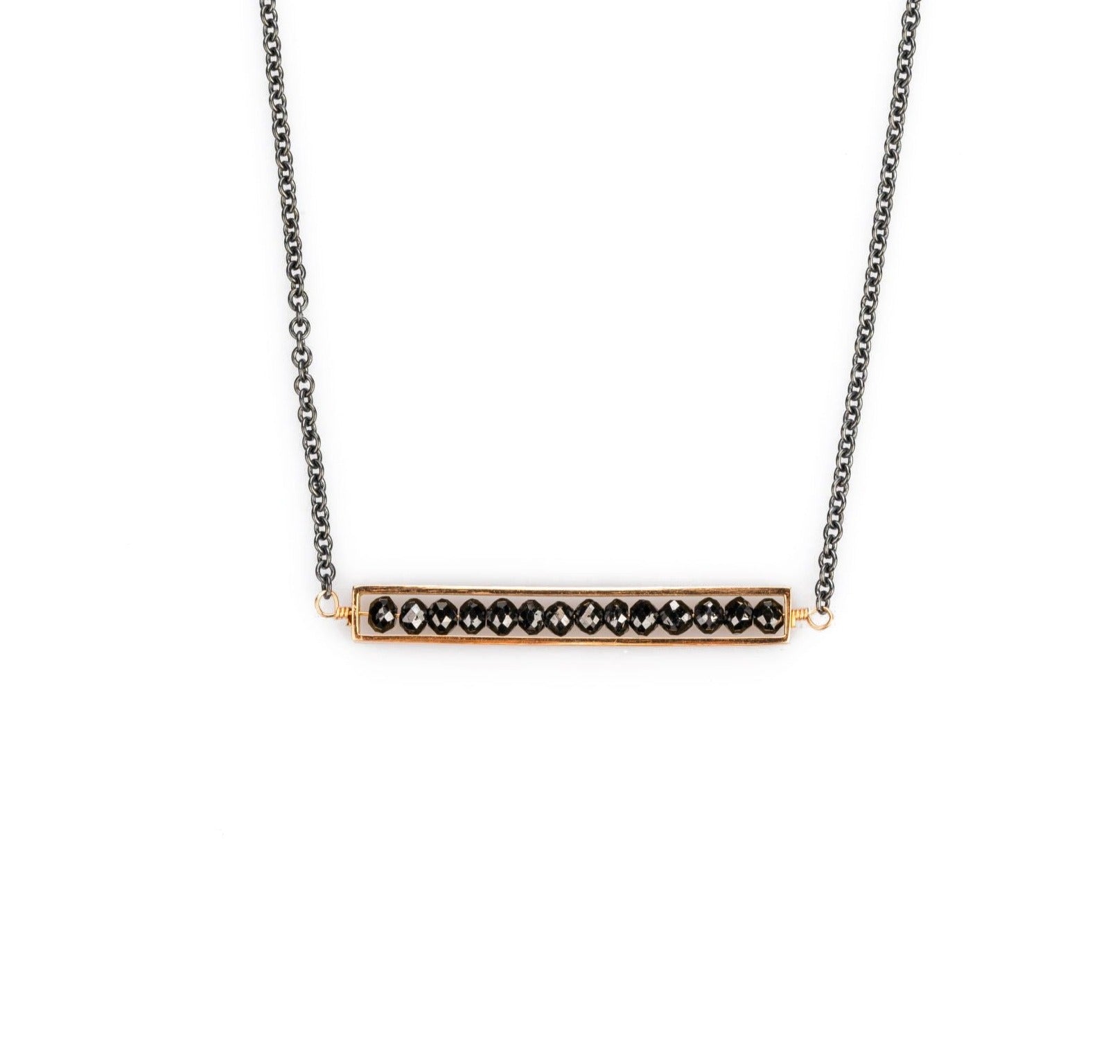 An 18k Rose gold bar necklace with approximately 2 carat of round faceted black diamonds on a 16" inch oxidized sterling silver cable chain. This necklace was made and designed by Sydney Strong.