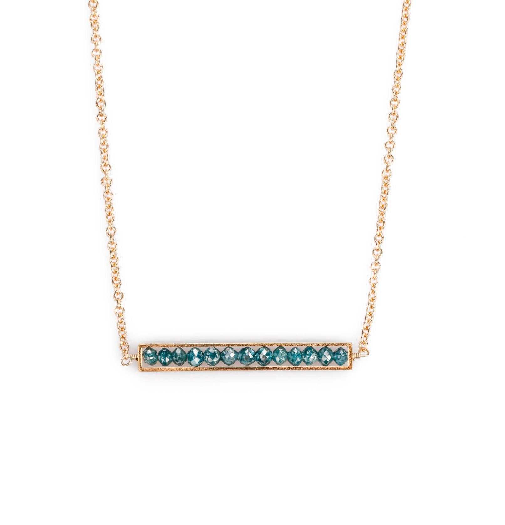 An 18k rose gold necklace with 2.0 total carat weight faceted blue diamond beads on a 14k rose gold 1.5mm 16" inch cable chain. This necklace was designed and made by Sydney Strong.