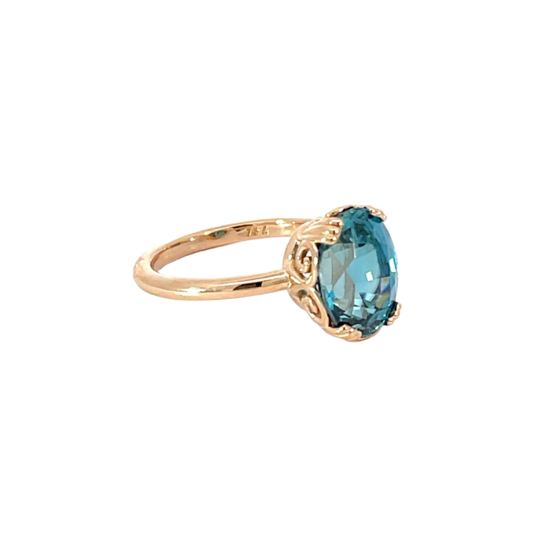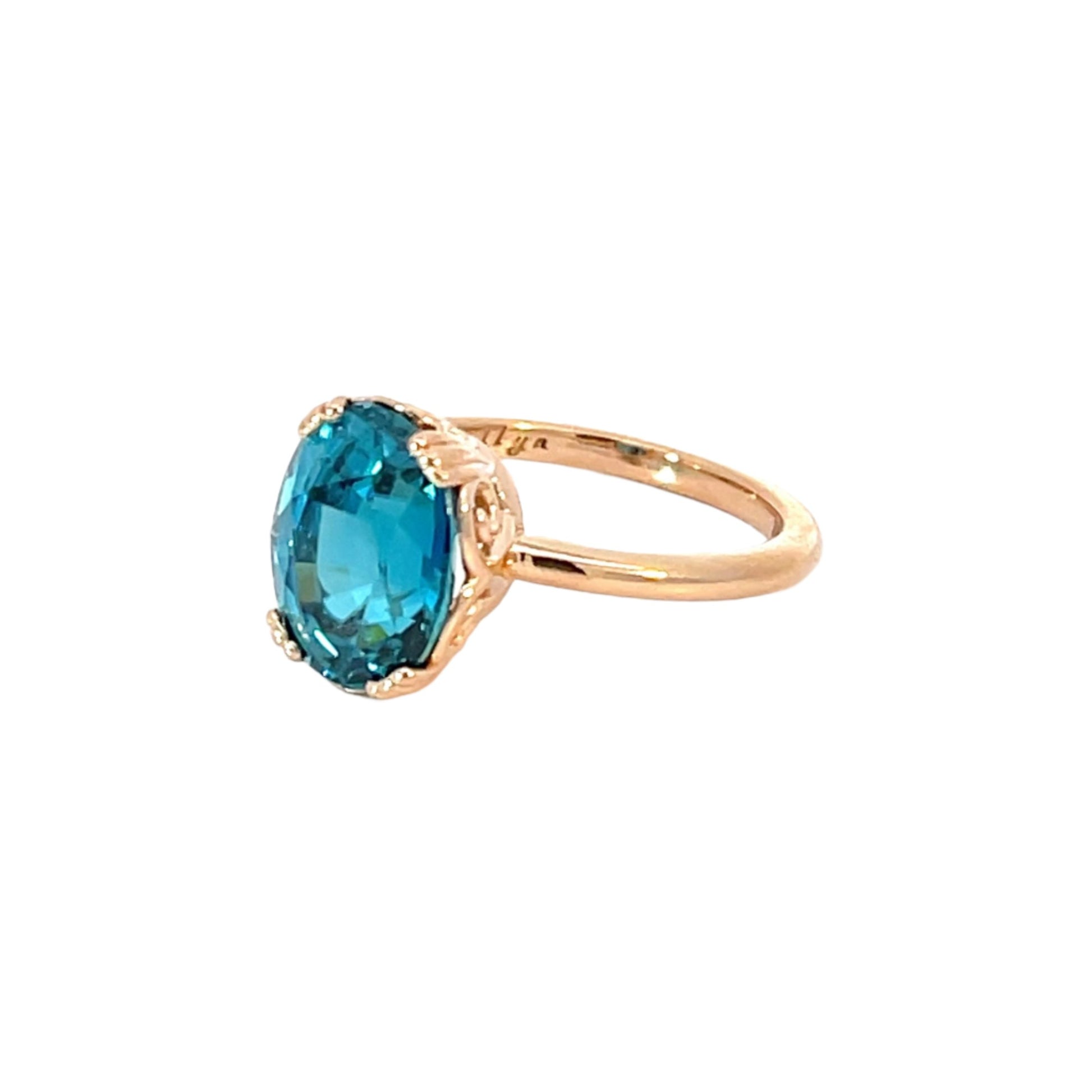 The blue zircon—often confused with blue topaz but far rarer—is celebrated for its high refractive index, which gives it diamond-like sparkle. Paired with the soft glow of 18k rose gold, the result is a blue zircon gold ring that radiates both elegance and individuality.