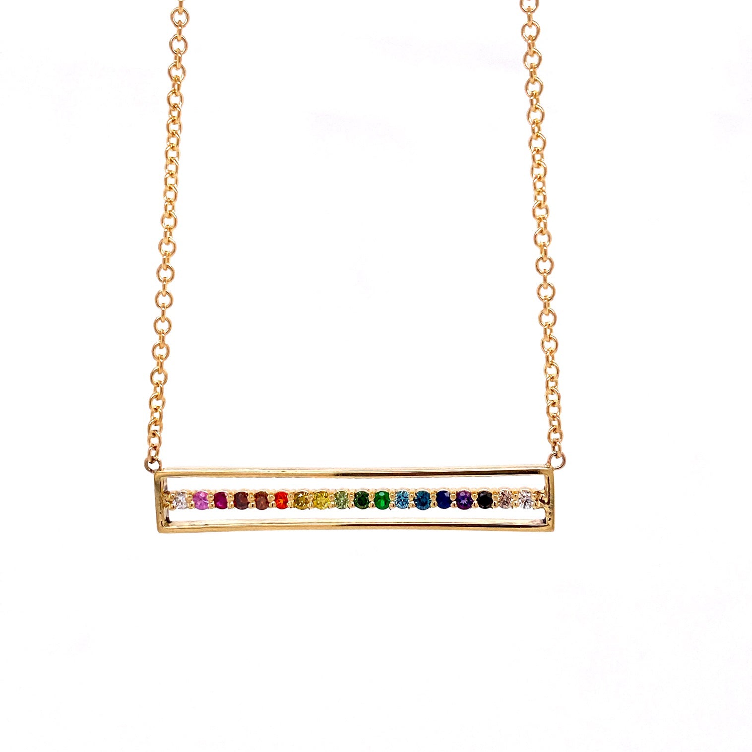 An 18k rose gold bar necklace set with 2 of each 1.5mm round full cut white diamond, pink sapphire, ruby, poppy topaz, yellow diamond, tsavorite garnet, blue diamond, blue sapphire, amethyst, black diamond, and champagne diamond 0.25 total carat weight. This necklace were designed and made by Sydney Strong.