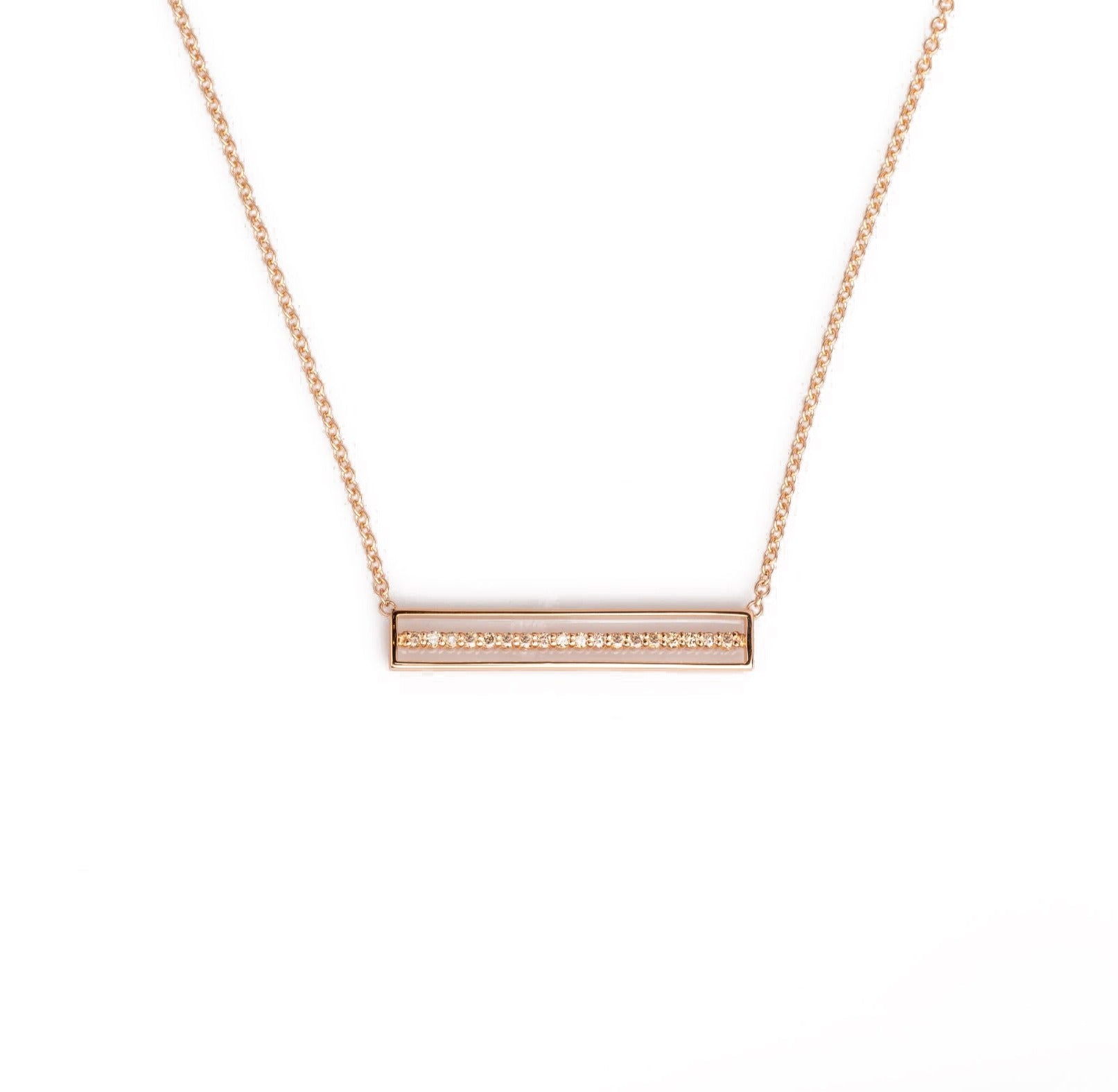 An 18k rose gold "Floating" bar necklace set with .36 total carats of round faceted FVS diamonds on a 16" inch 14k rose gold cable chain. This designed and made by Sydney Strong.