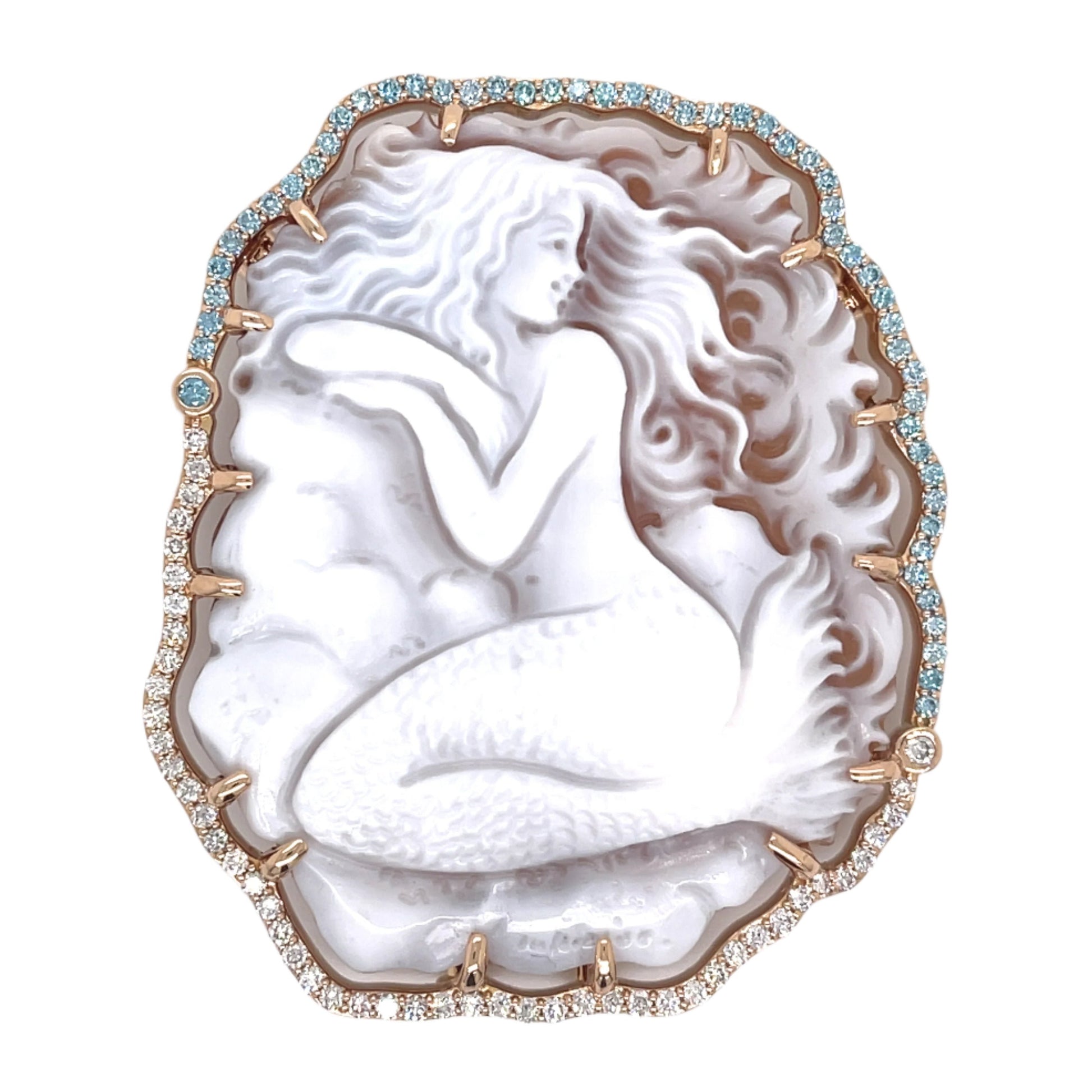 A hand carved mermaid cameo brooch and modullyn clasp set in 18k rose gold surrounded by .74 carats of aqua blue diamonds and .68 carats of champagne diamonds. The reverse shows the mermaid cut out in gold with a blue diamond belly button. Designed and made by llyn strong.