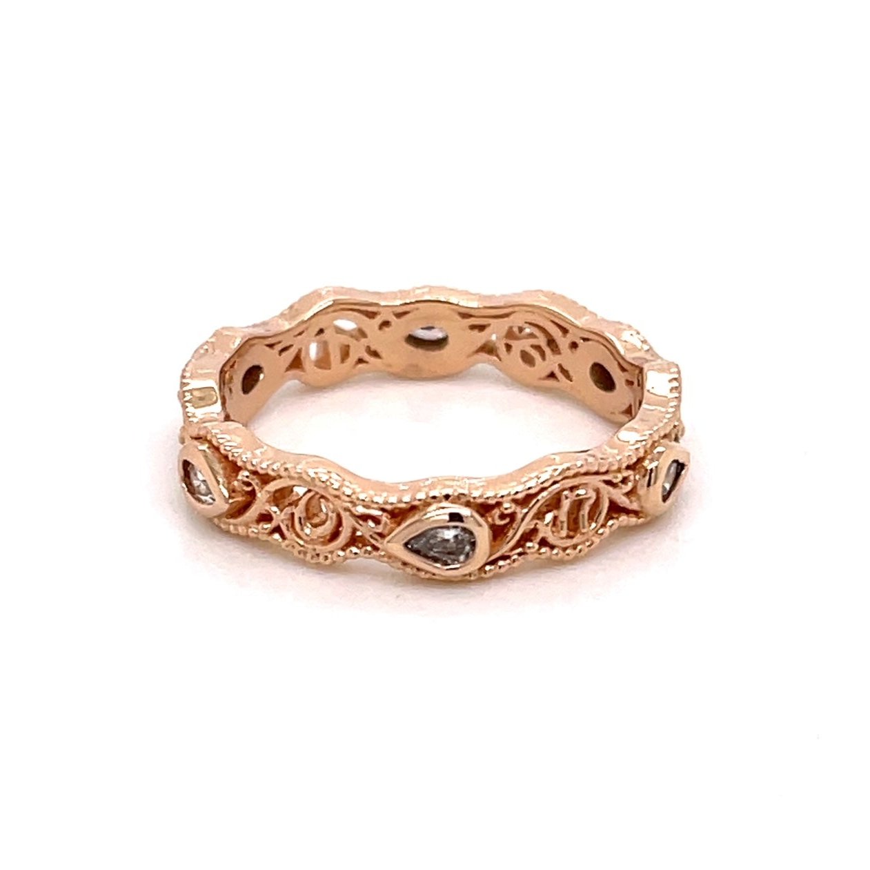 An 18k rose gold "Strong Pair" band set with .27 carats of pearshape diamonds. This ring was made and designed by llyn and Sydney Strong.