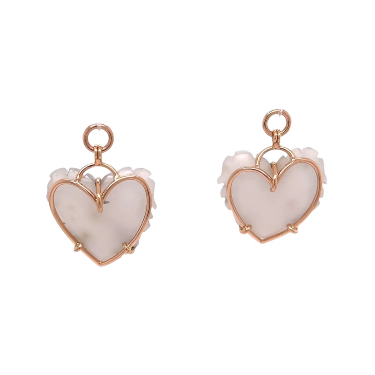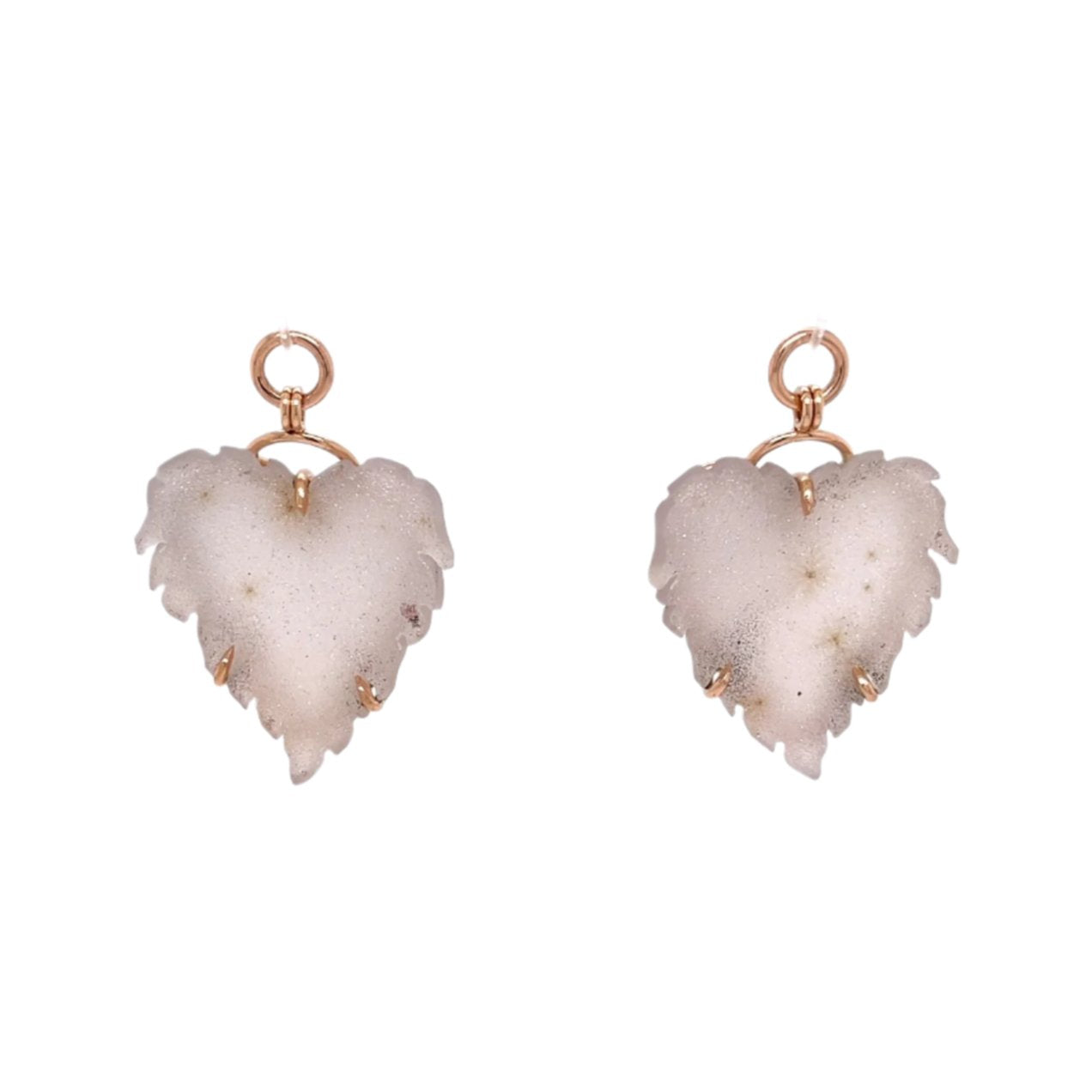 A pair of 18k rose gold jackets set with two carved white druzy hearts. These jackets were made and designed by llyn strong.