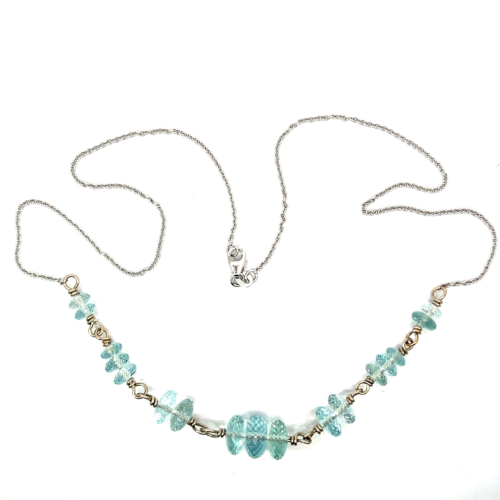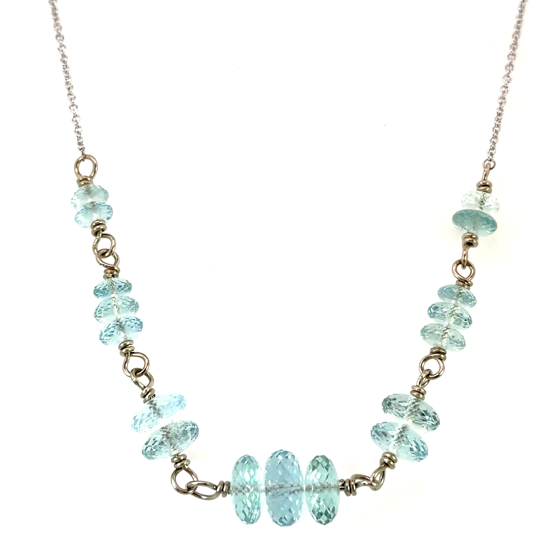 An 18k white gold necklace wire wrapped with Pakistan aquamarine beads that have a 34.95 total carat weight. This necklace was made and designed by llyn strong.