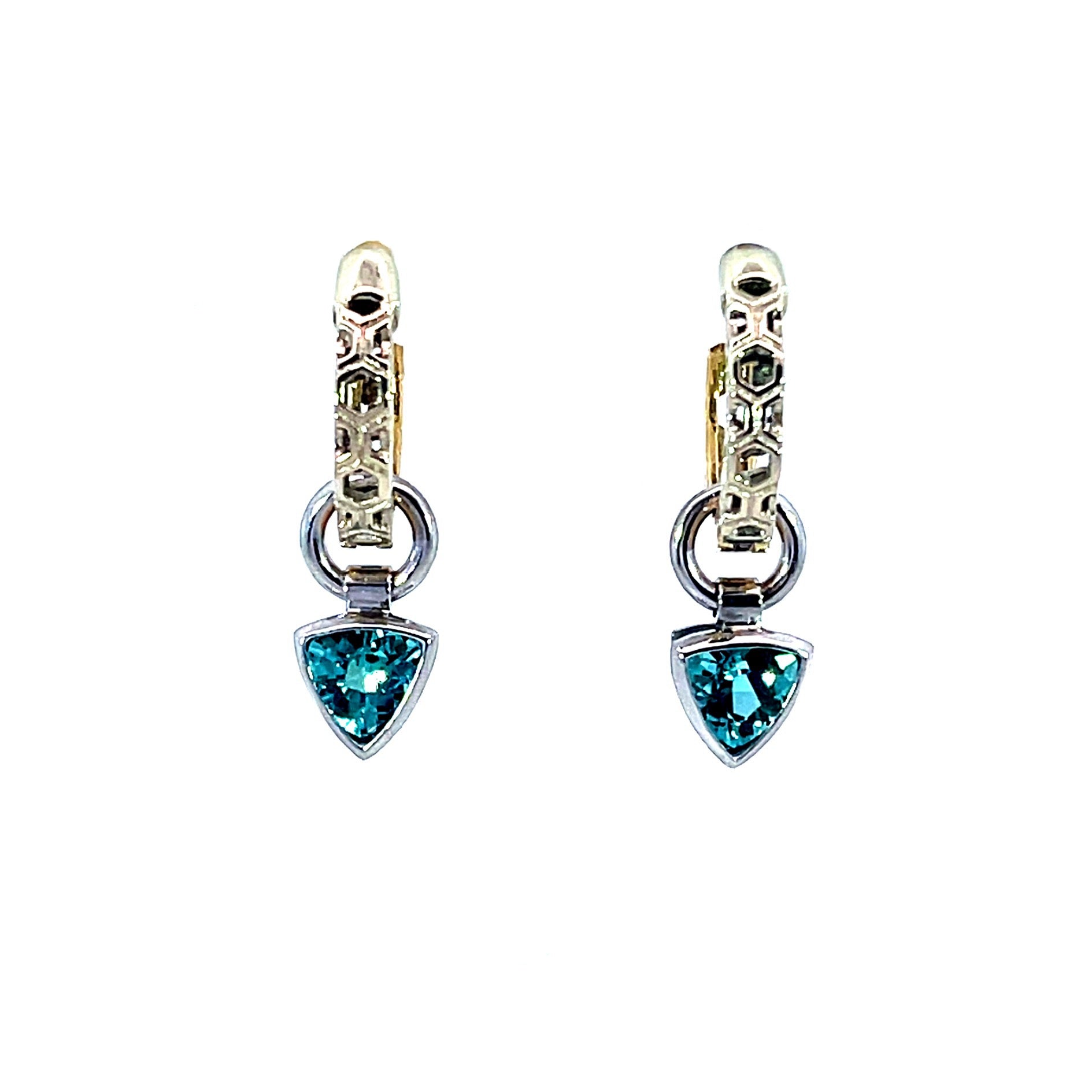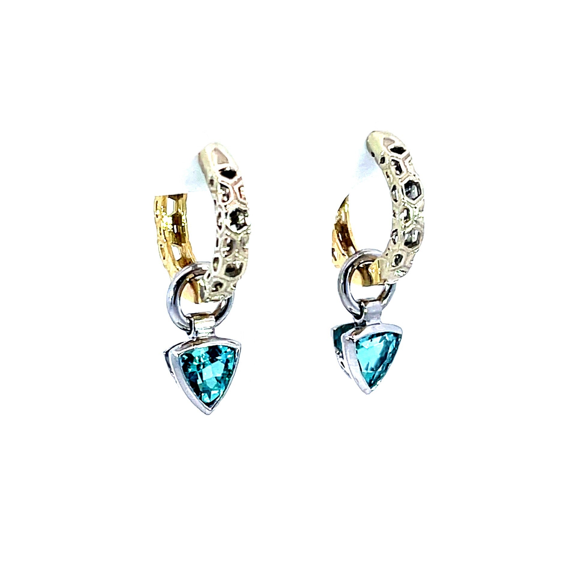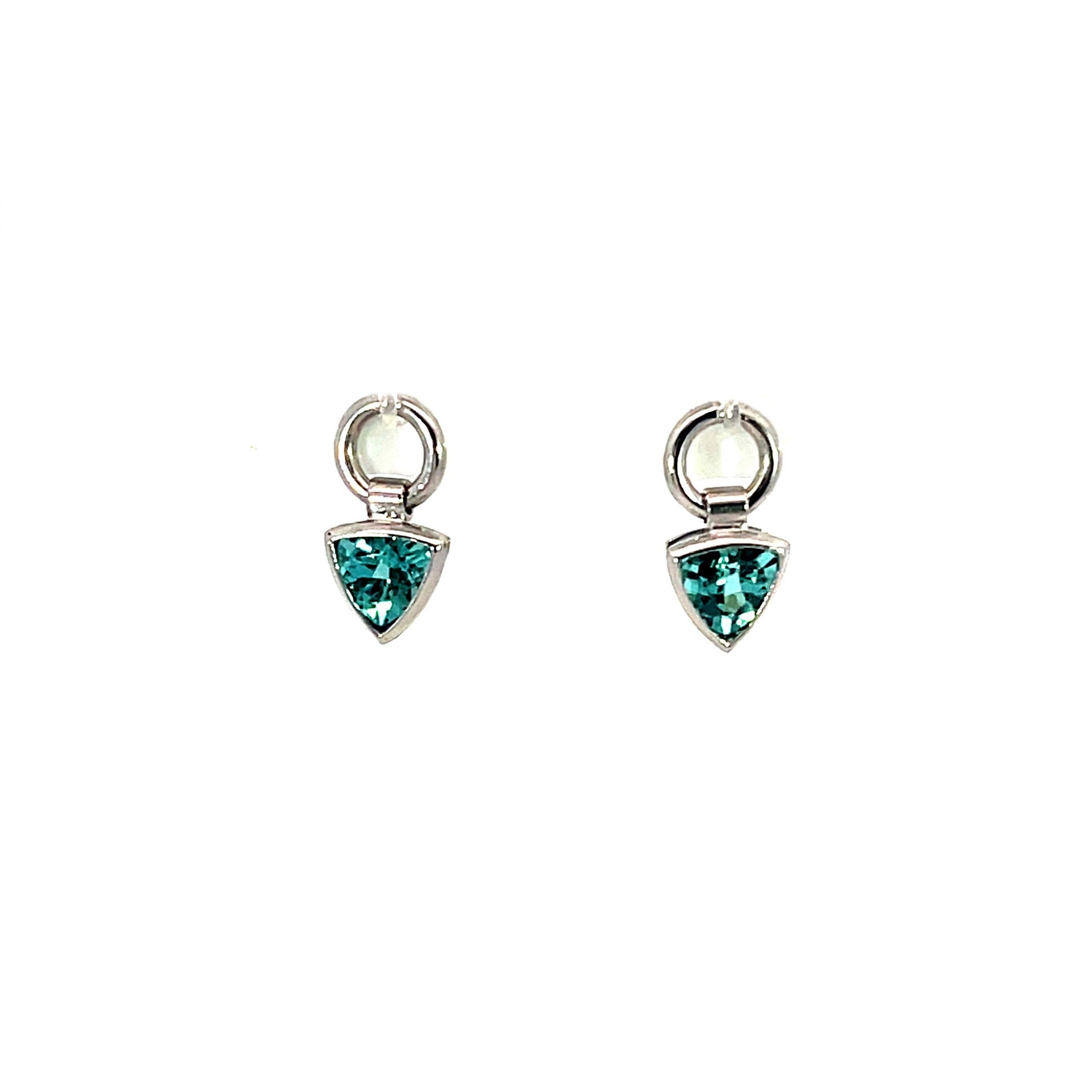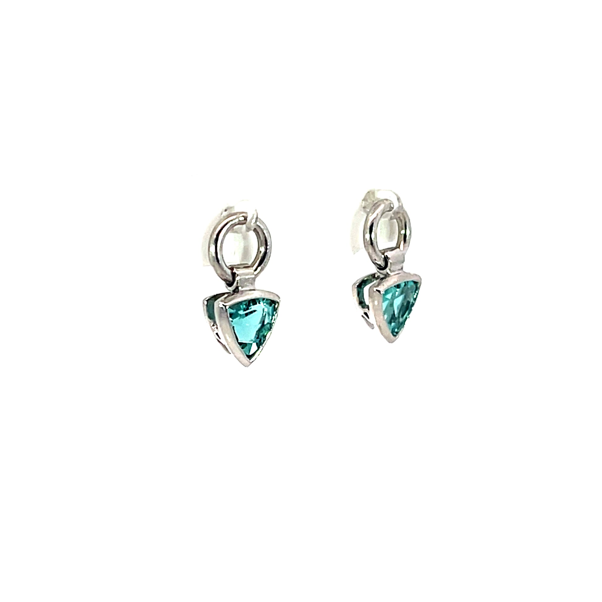 A pair of 18k white gold earring jackets featuring two bezel set trillion blue tourmalines with a total carat weight of 2. These jackets were made and designed by llyn strong.