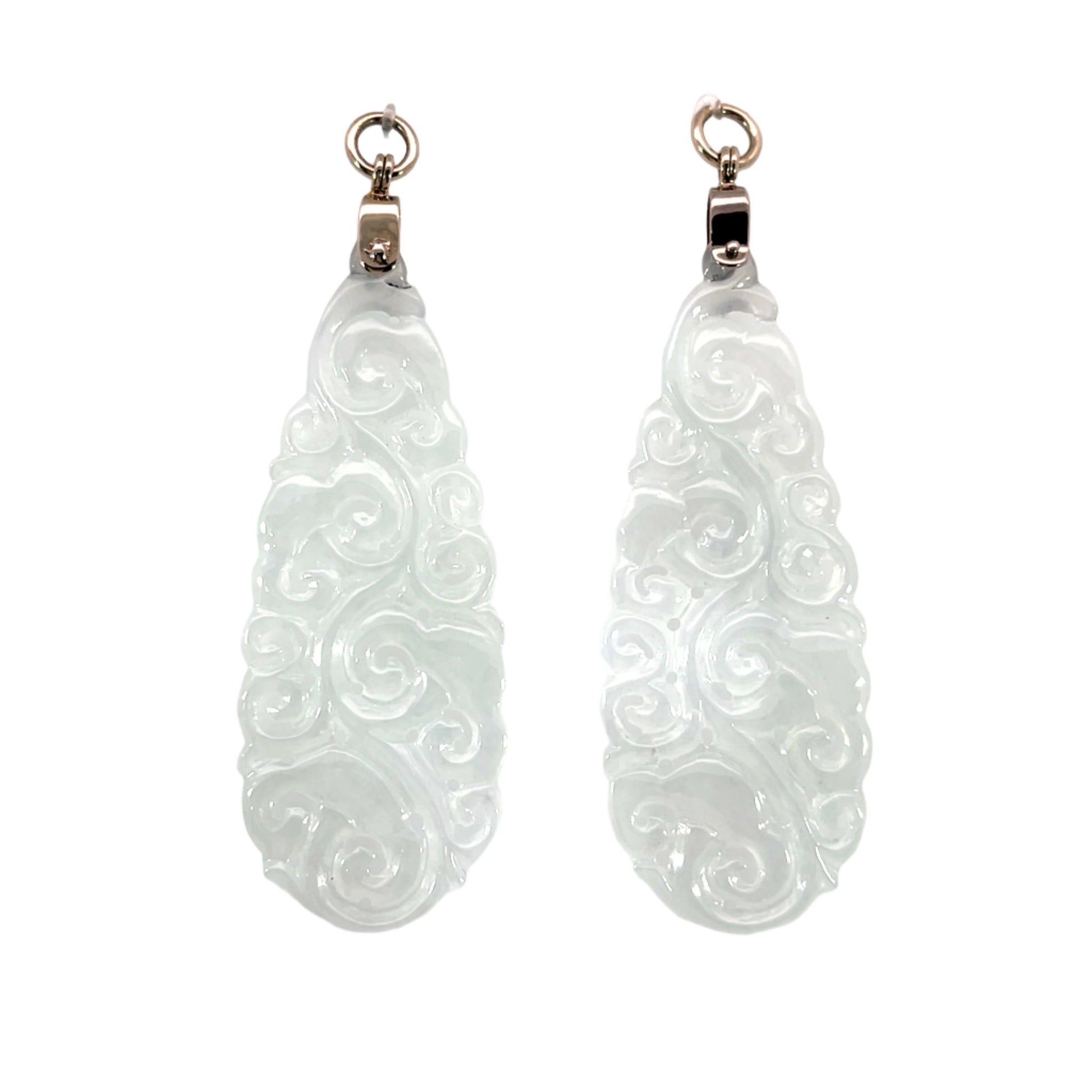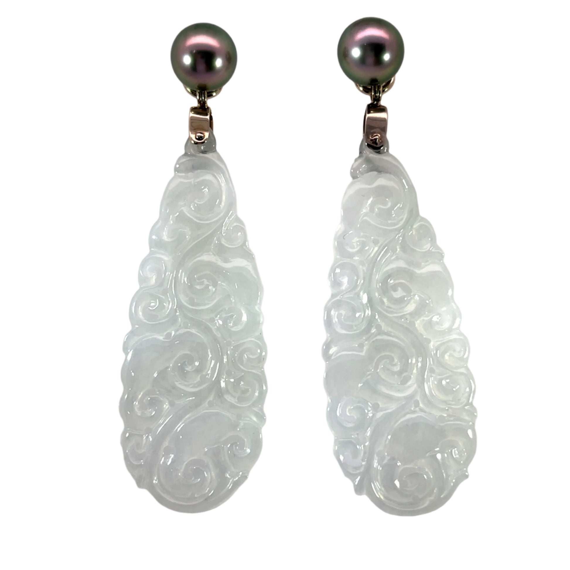 A pair of 18k white gold earring jackets featuring two pieces of carved jadeite. These earring jackets were designed and made by llyn strong.