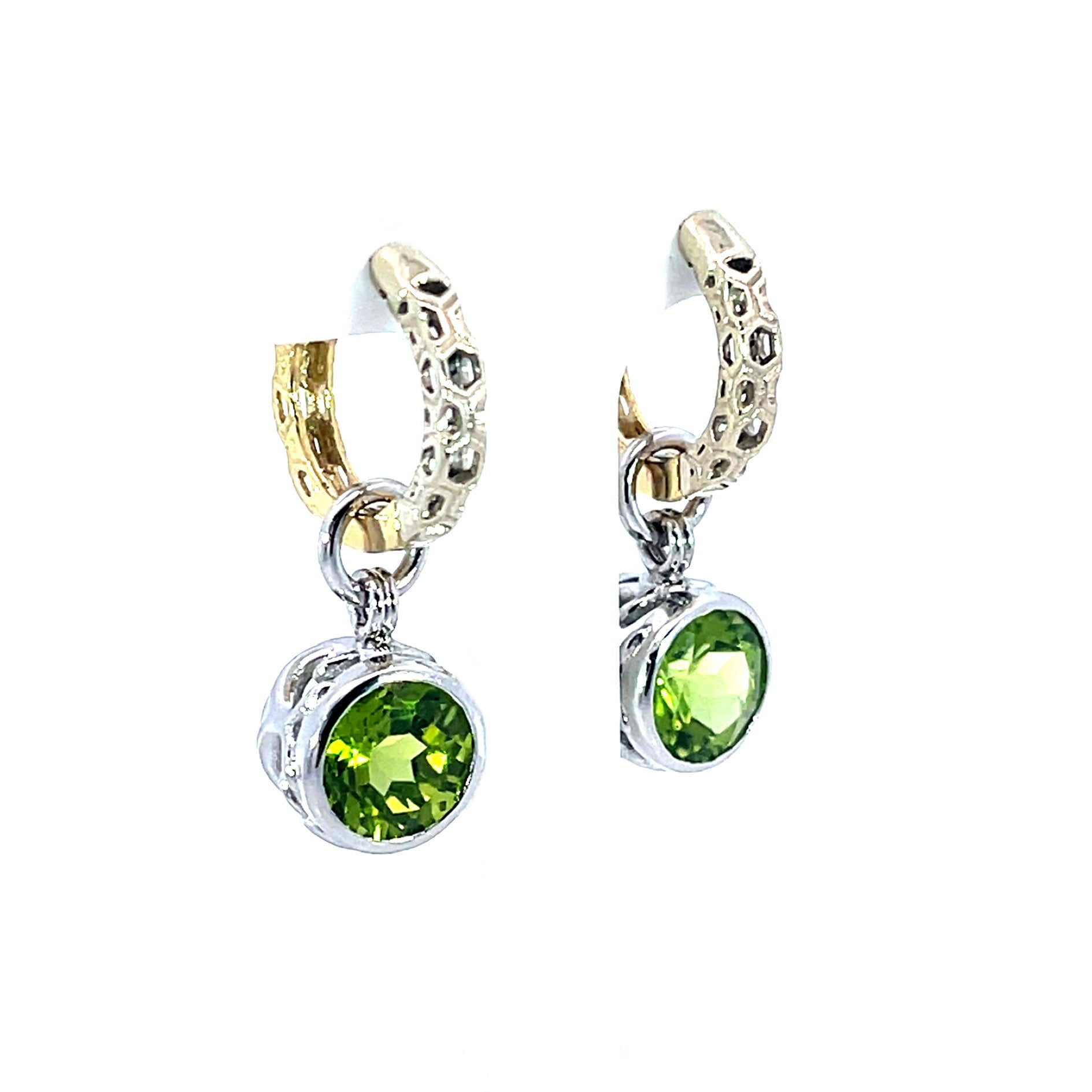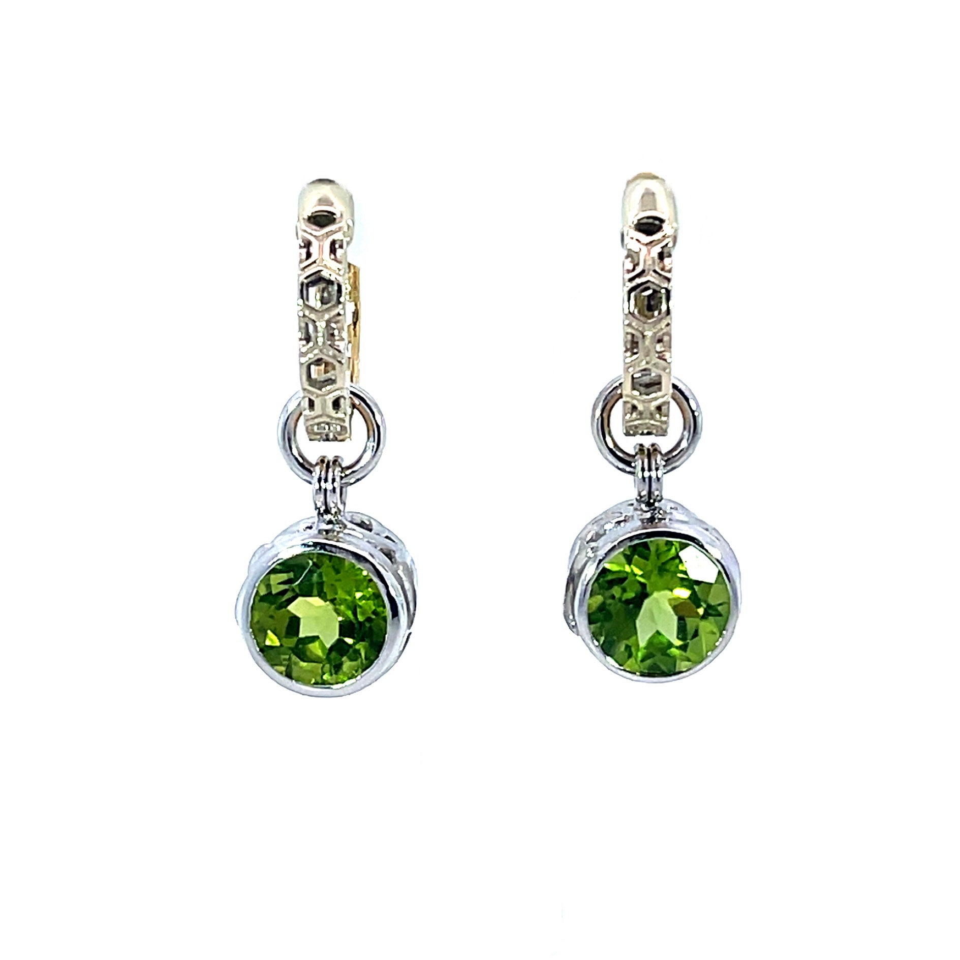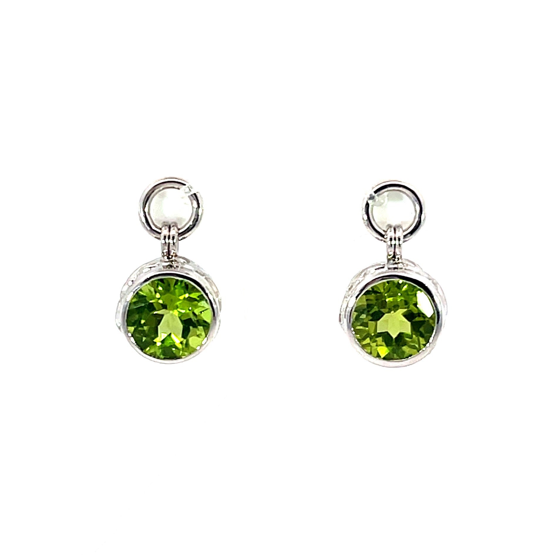 A pair of 18k white gold earring jackets featuring two round peridot with a total carat weight of 3.46. These jackets were made and designed by llyn strong.