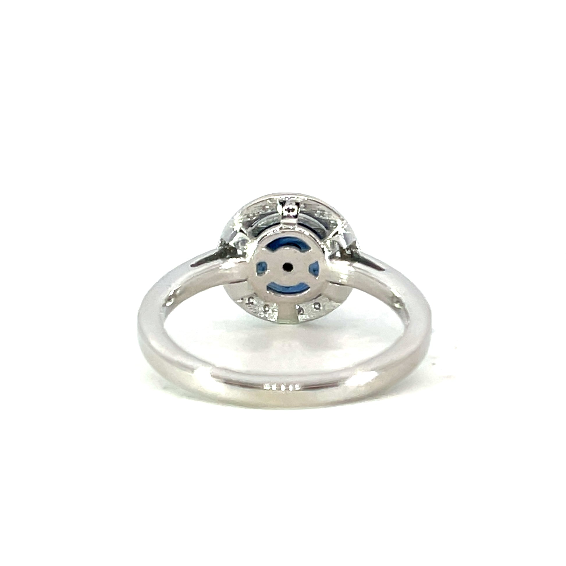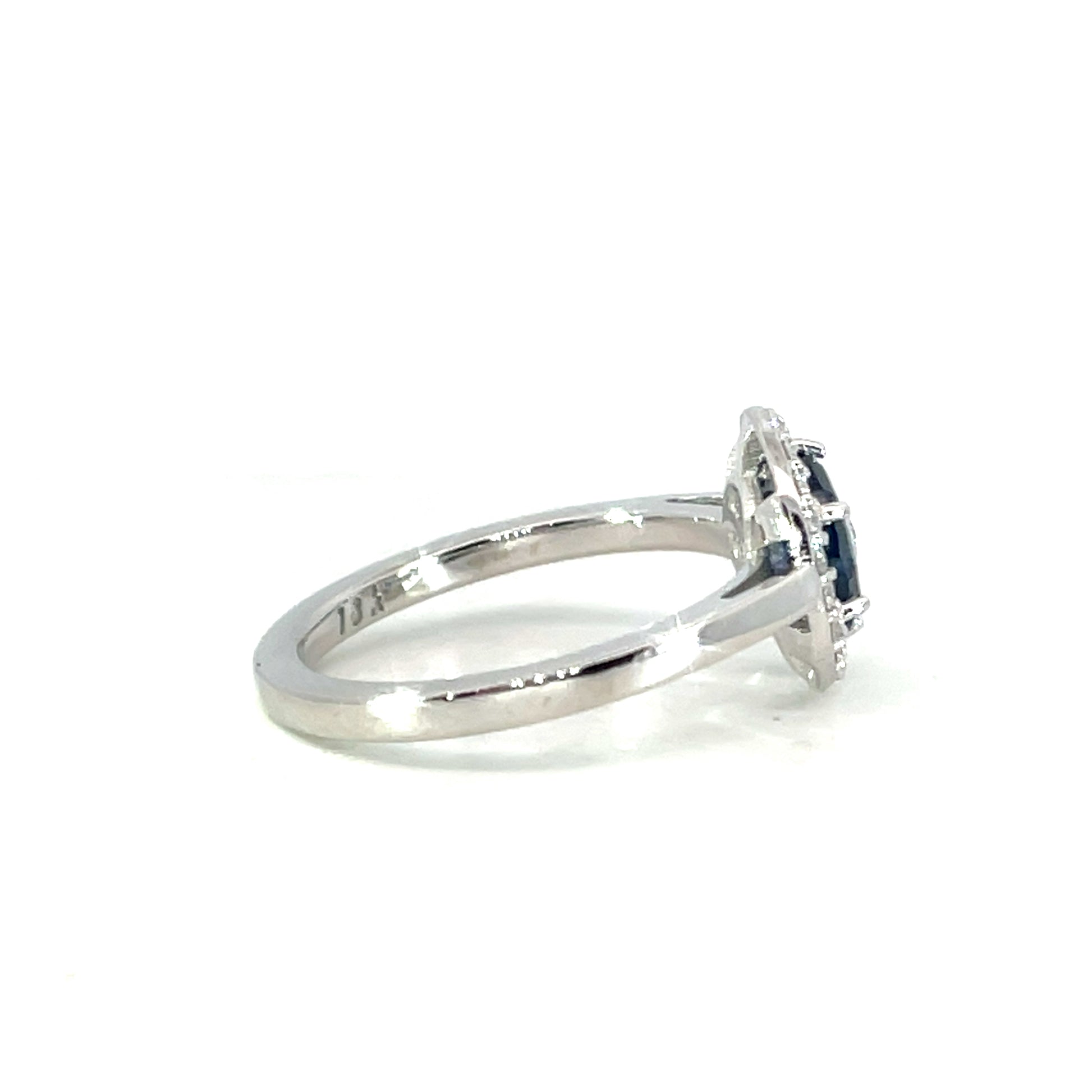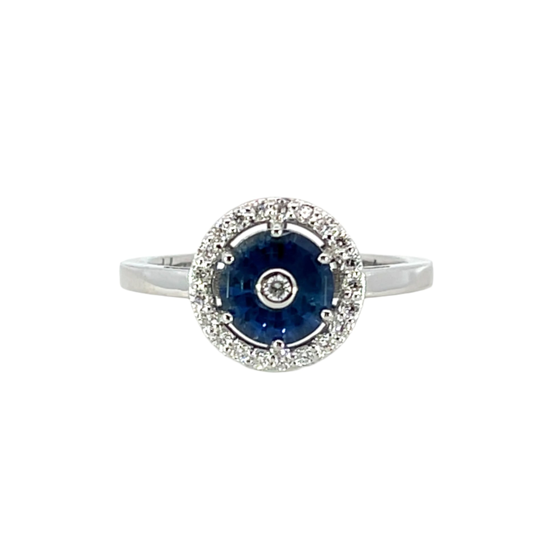 An 18k white gold ring set with a 1.21ct blue sapphire Torus and a halo set with 0.17 total carat weight of FVS diamonds. Ring size 7. This ring was made and designed by llyn strong.