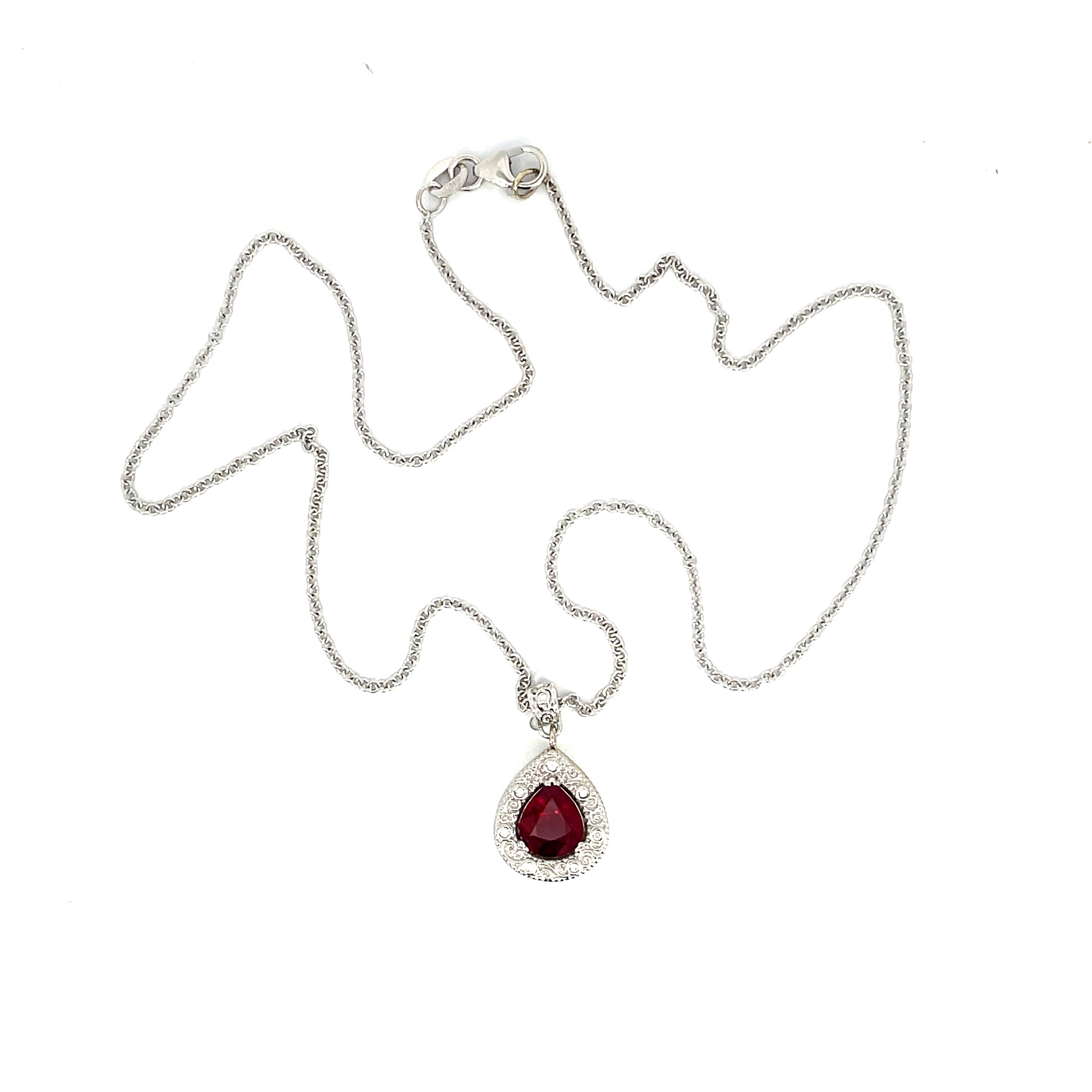 An 18k white gold pendant featuring a 1.7ct pearshape ruby and 0.04tcw FVS diamonds. Ruby is 6.93mm x 8.06mm and diamonds are 1.0mm. This pendant was made and designed by llyn strong.