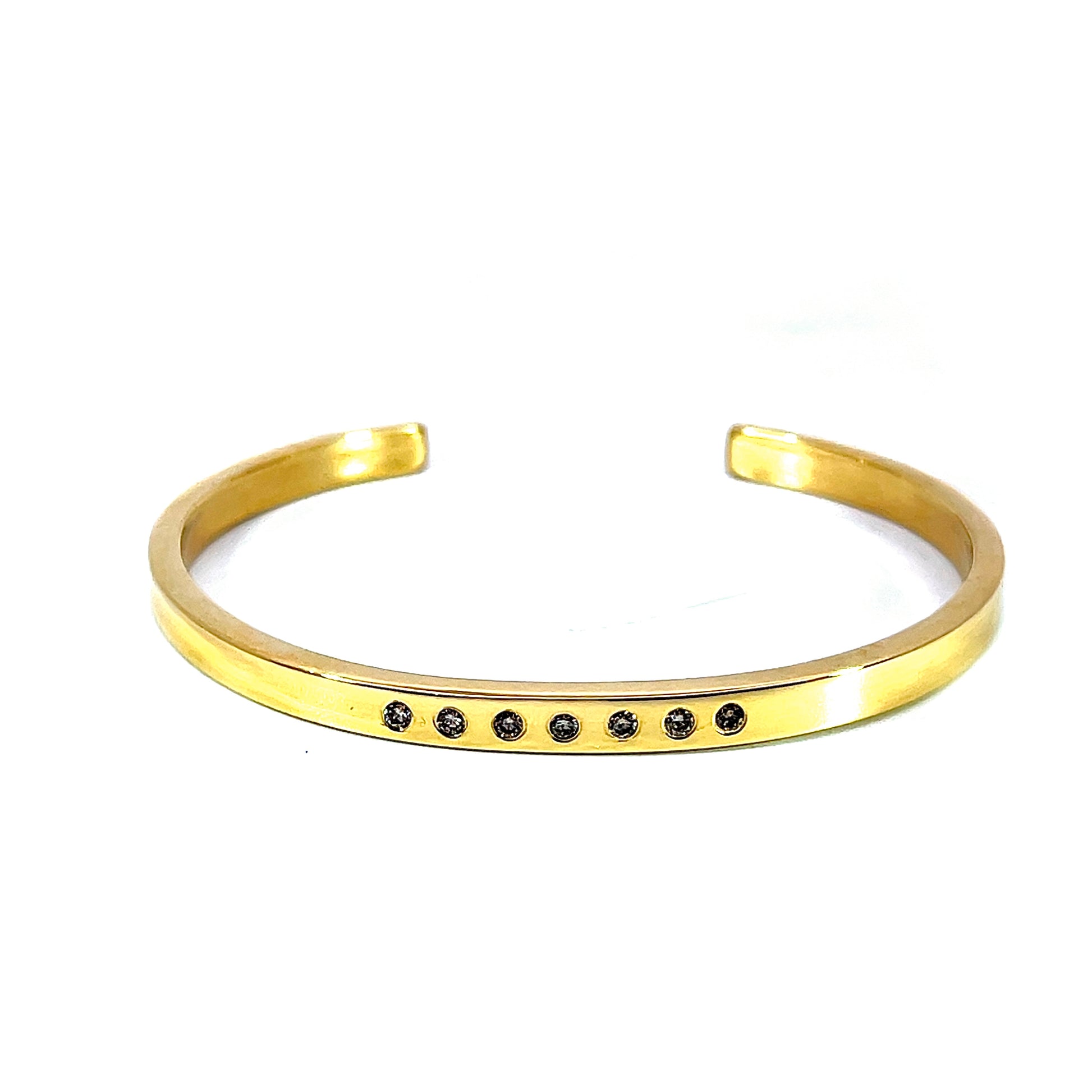 An 18k yellow gold bracelet cuff with 7 2mm champagne diamonds. This bracelet was made and designed by llyn strong.
