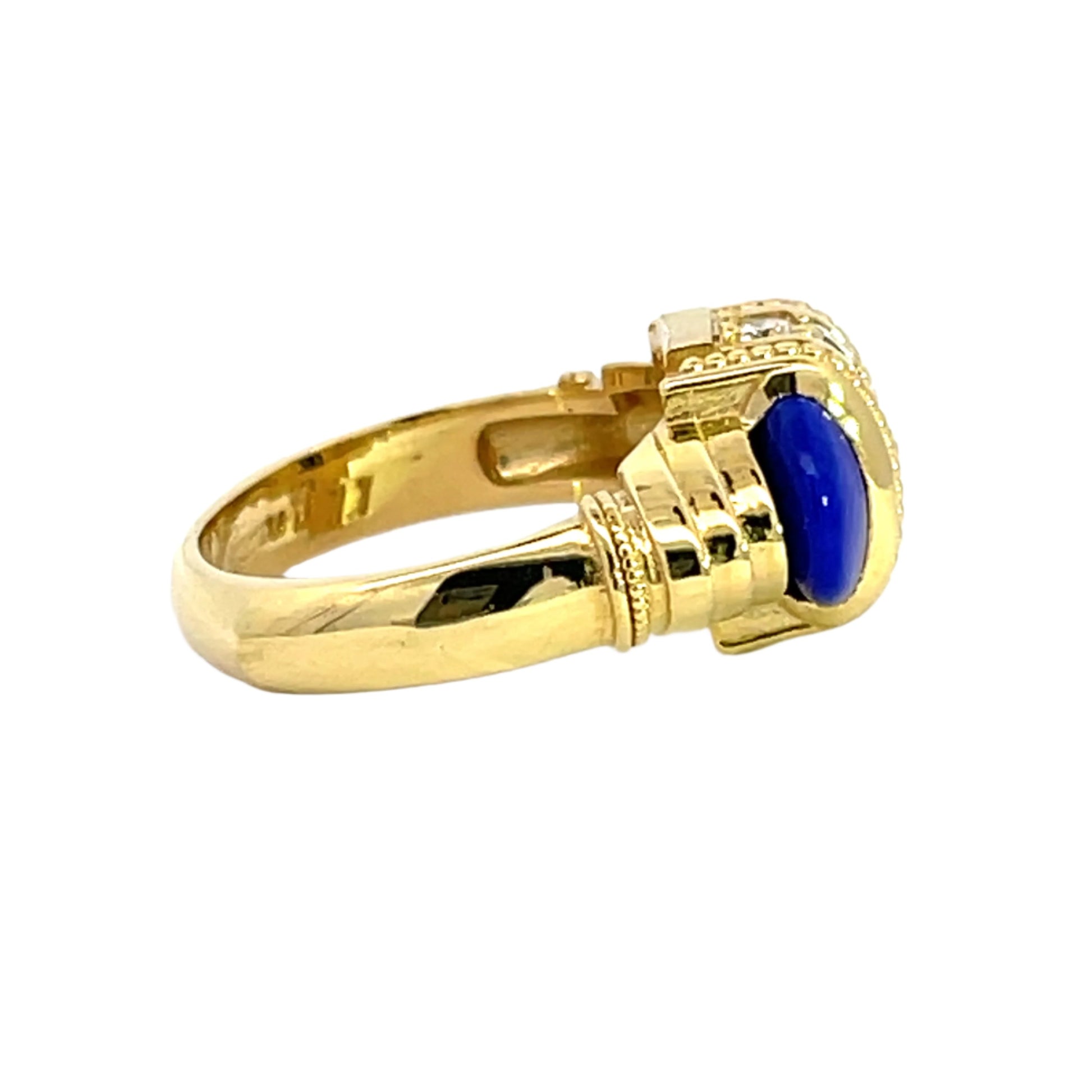 Lapis is rarely seen in modern fine jewelry, which is exactly why it shines here. Framed by the brilliance of white diamonds and anchored in high-karat gold, the stone commands attention without overwhelming the hand. The gold ring arch silhouette gives this piece an architectural edge—curved just enough to feel fluid but structured enough to hold presence.