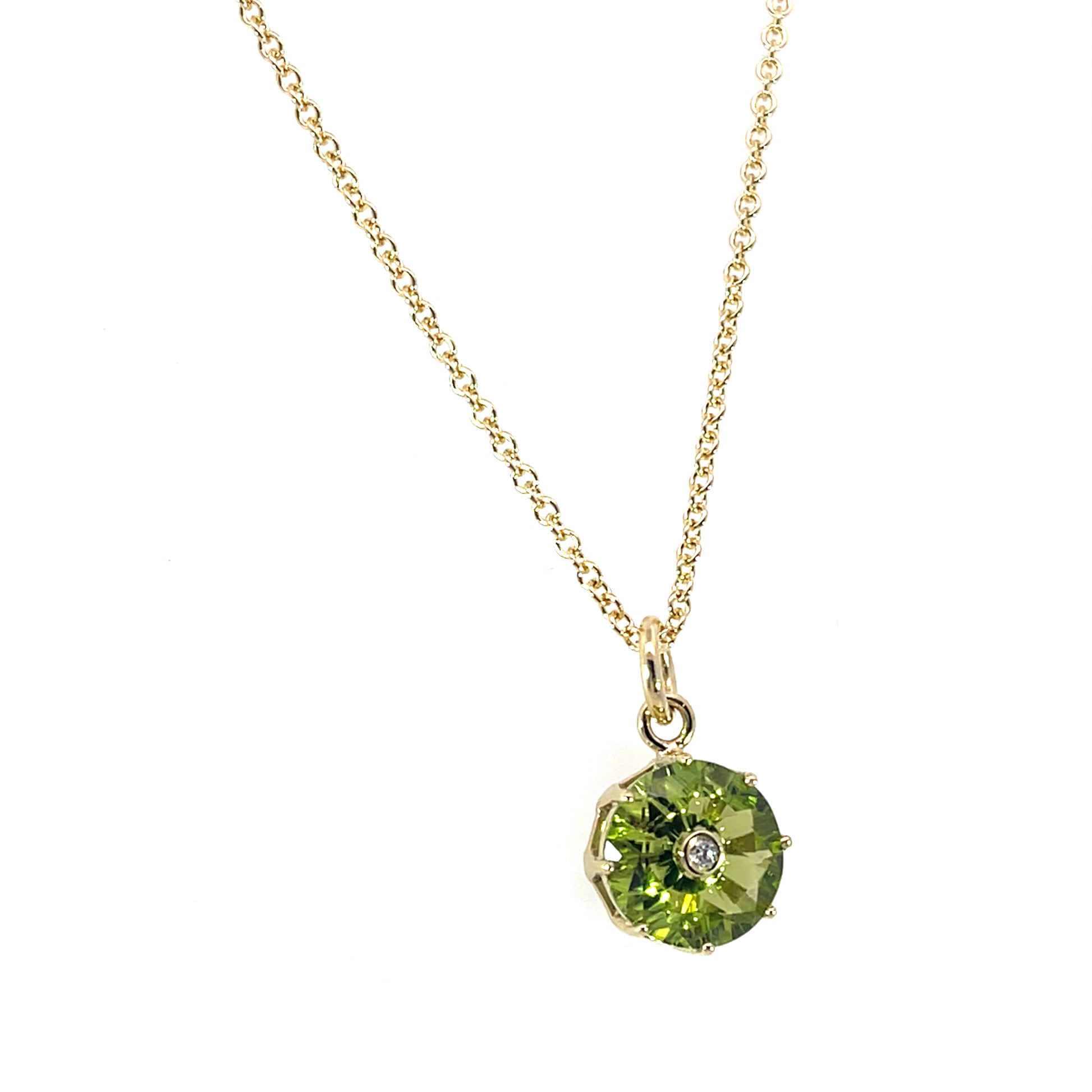 A 18k yellow gold 2.5ct peridot torus pendant with a 0.02 champagne diamond set in the middle. Pendant only. This pendant was made and designed by llyn strong.