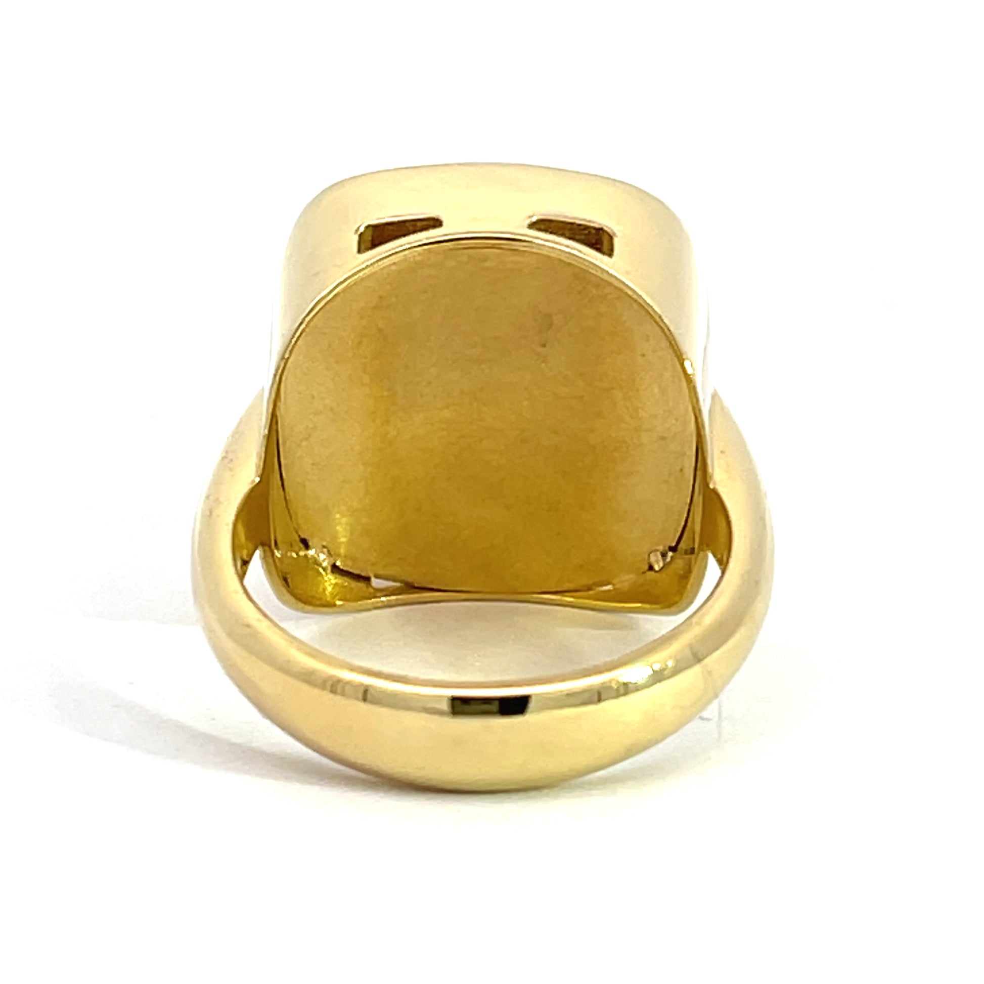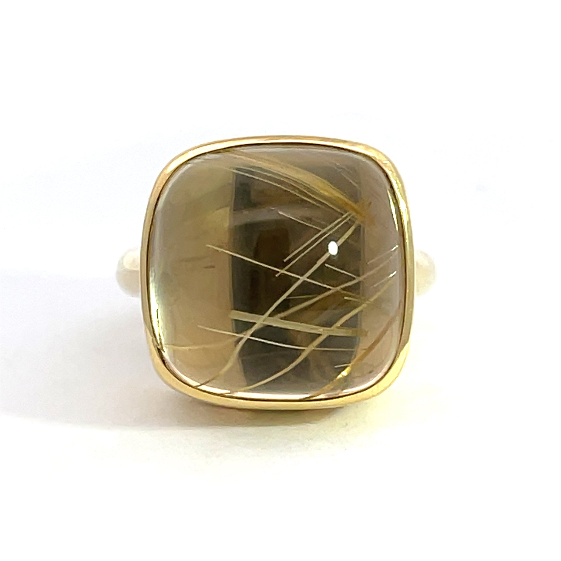 Set in rich 18k yellow gold, the cushion-shaped rutilated quartz weighs an impressive 22.55 carats. The stone is bezel-set, a secure and clean-lined style that showcases the natural character of the quartz. Known for its luminous golden threads—often referred to as “Venus hair”—rutilated quartz adds both movement and intrigue to any jewelry design. Each stone is truly unique, with golden inclusions dancing within a clear or smoky body, catching the light with every gesture.