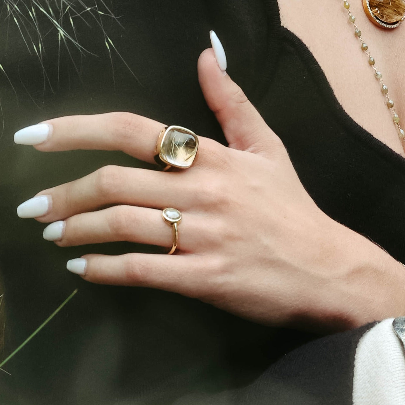 Though this piece is made in 18k yellow gold, we also create pieces in other finishes like 18k white gold rutilated quartz rings and mixed-metal combinations. Looking for something to match this ring? Consider a bezel bracelet or custom necklace made from similar stones—crafted just for you.