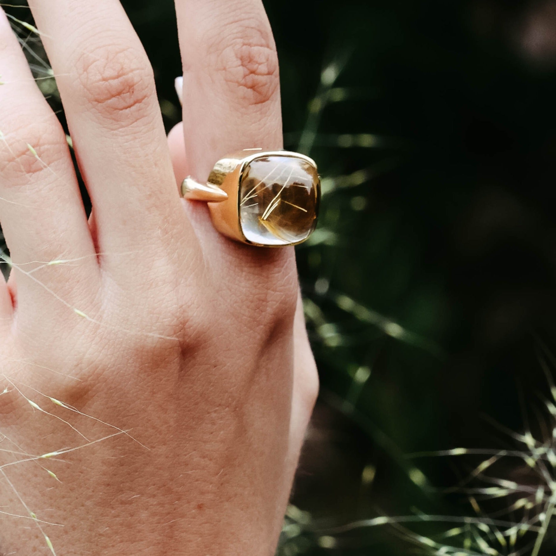Sydney chose this particular gemstone for its bold visual personality and its harmonious relationship with yellow gold. The result? A gold rutilated quartz ring that balances elegance with edge, and luxury with raw, earthy texture.