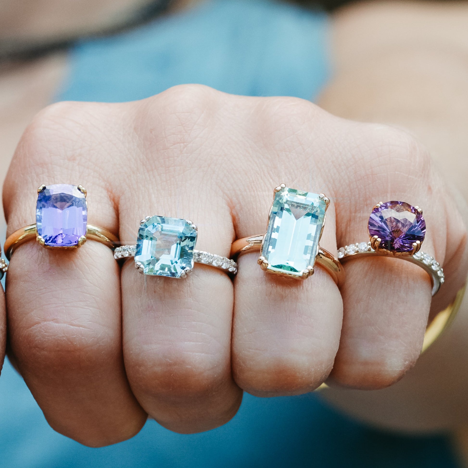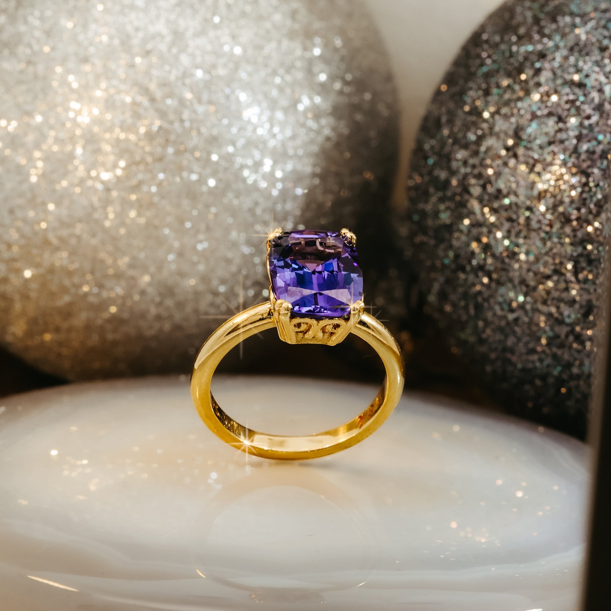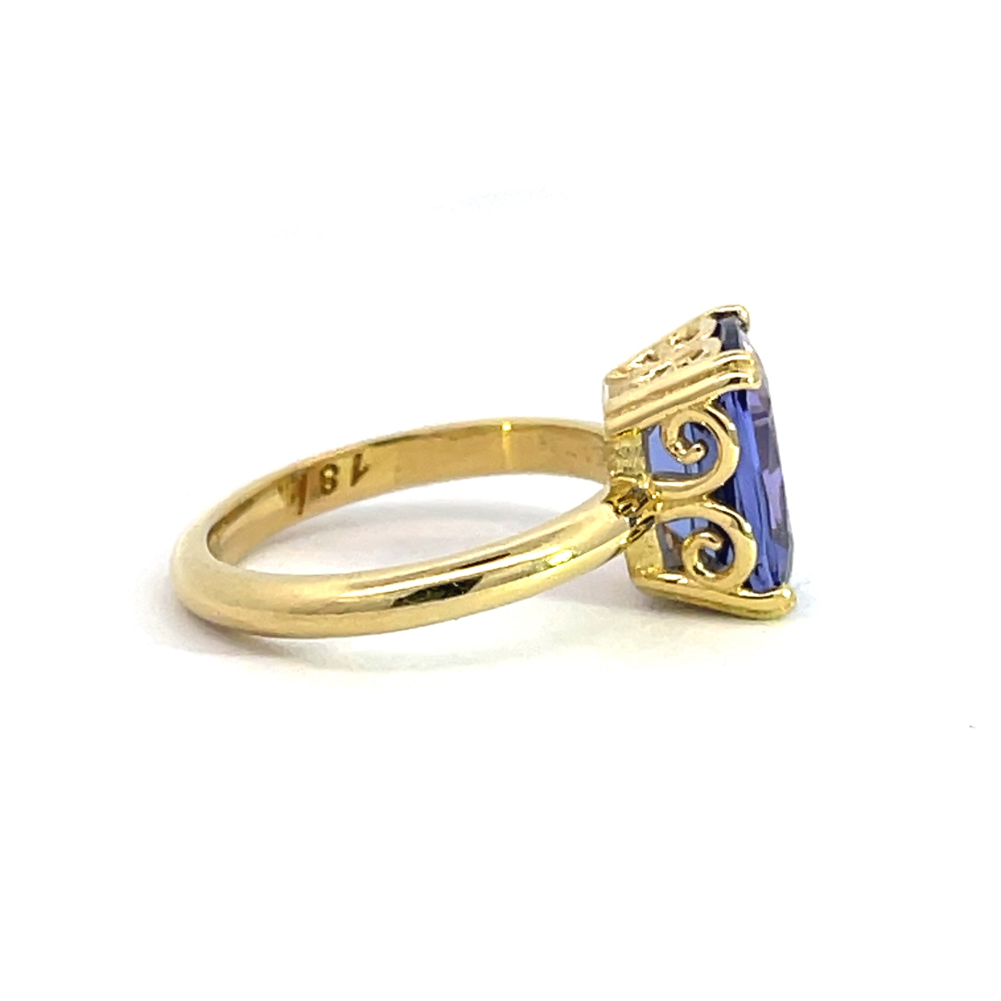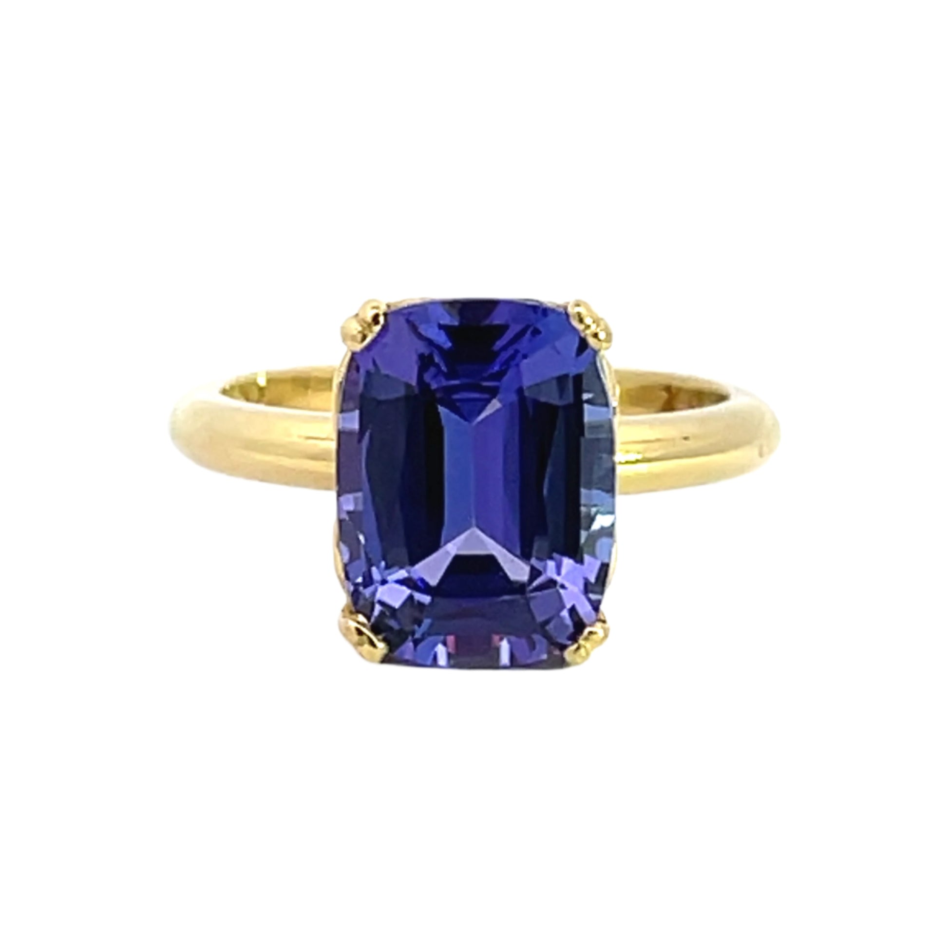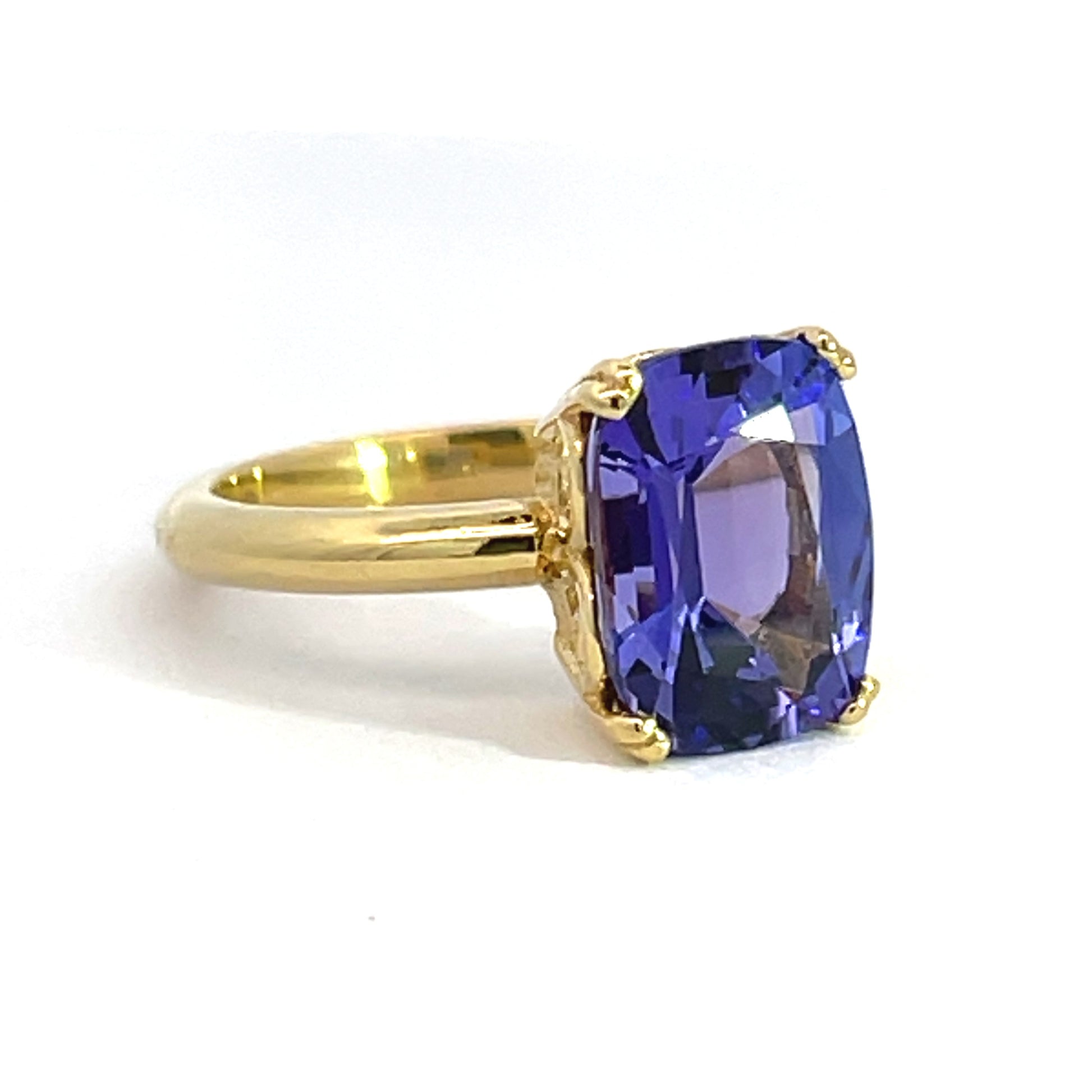 An 18k yellow gold ladies ring featuring one double prong set cushion cut Tanzanite out of Tanzania 4.24 carats. This ring was custom designed and made by Sydney Strong.
