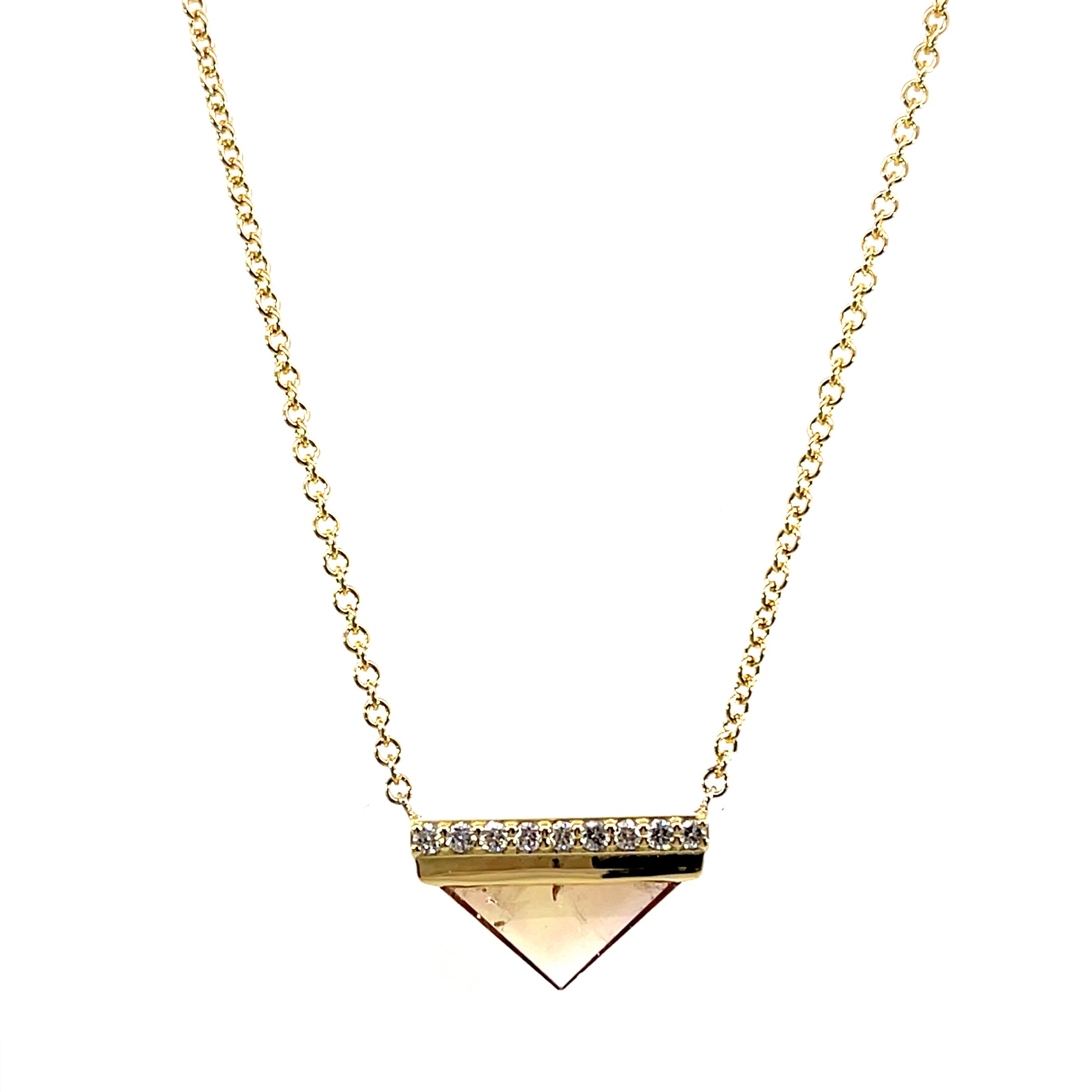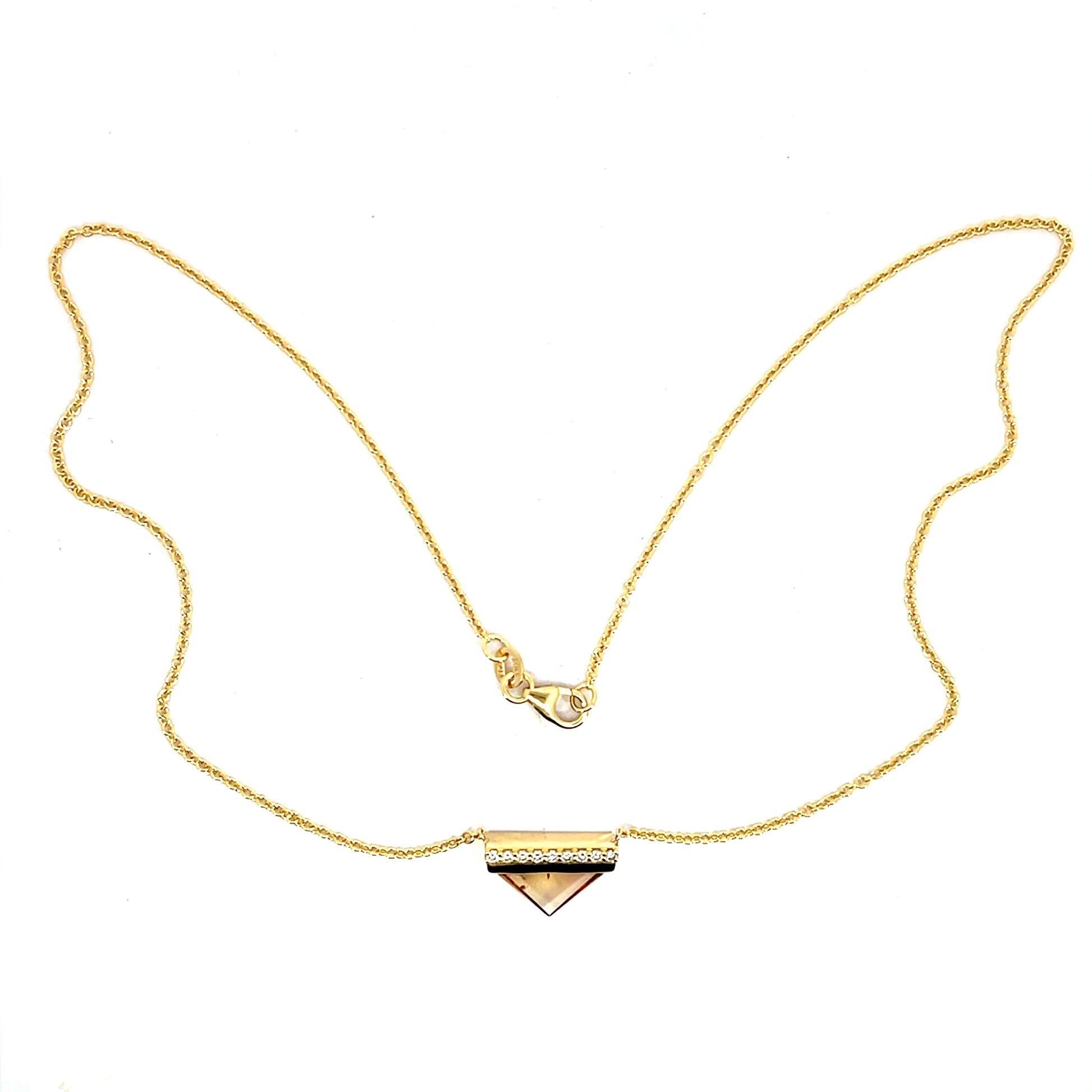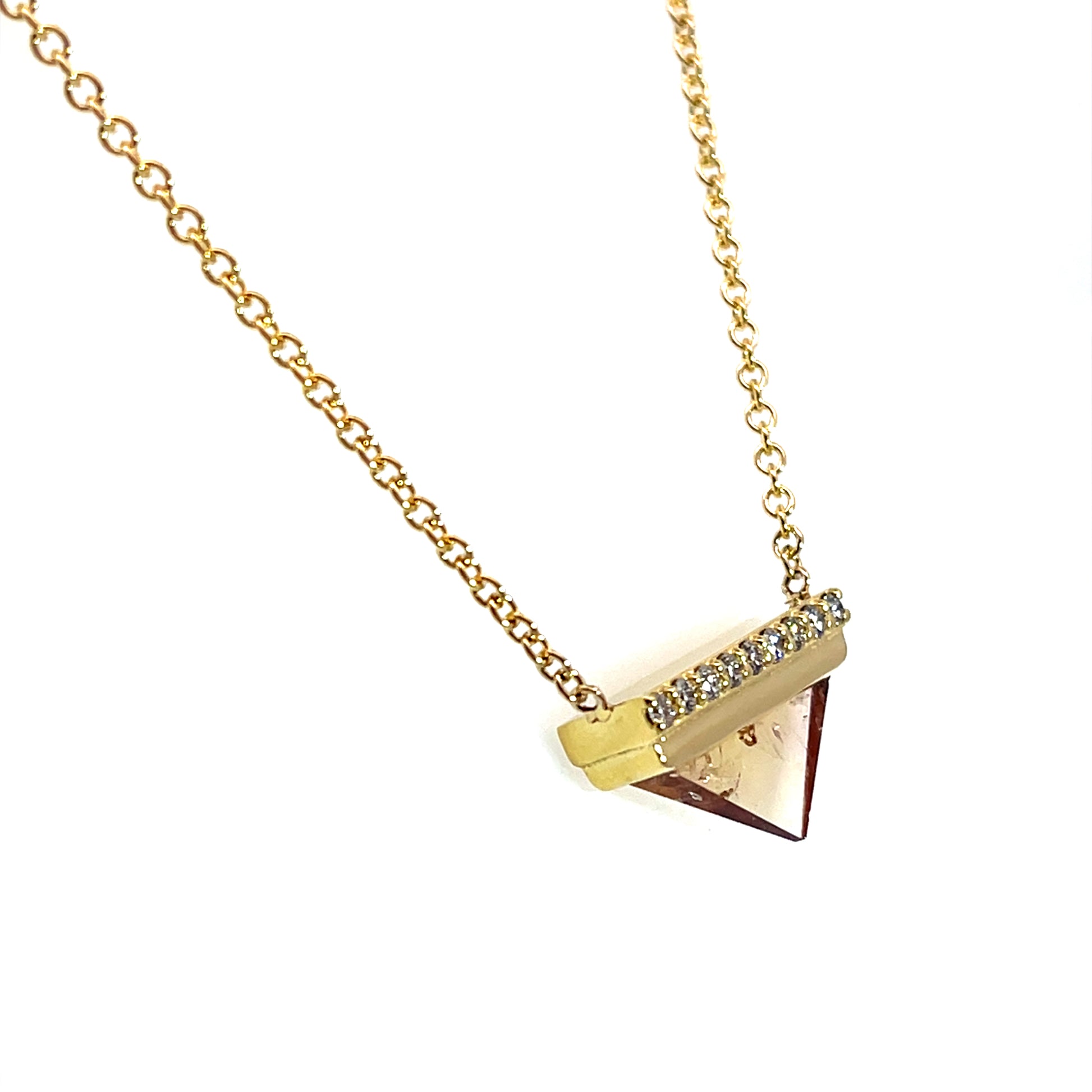 An 18k yellow gold necklace with a 3.05ct topaz triangle and 9 champagne diamonds that total 0.11ct. 16" long. This necklace was made and designed by llyn strong.