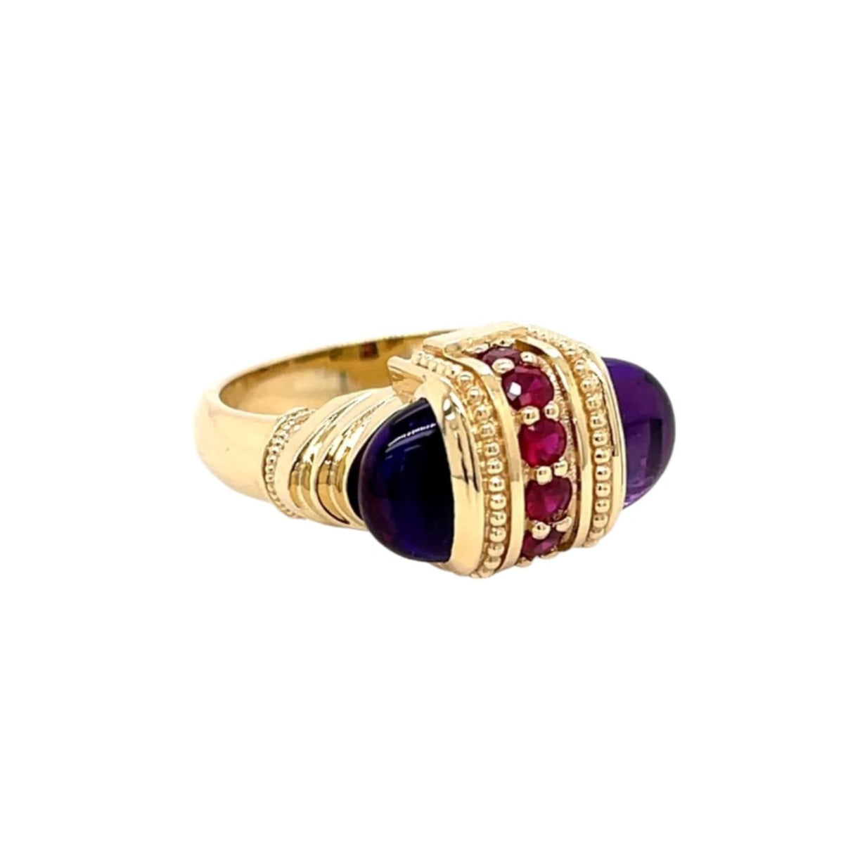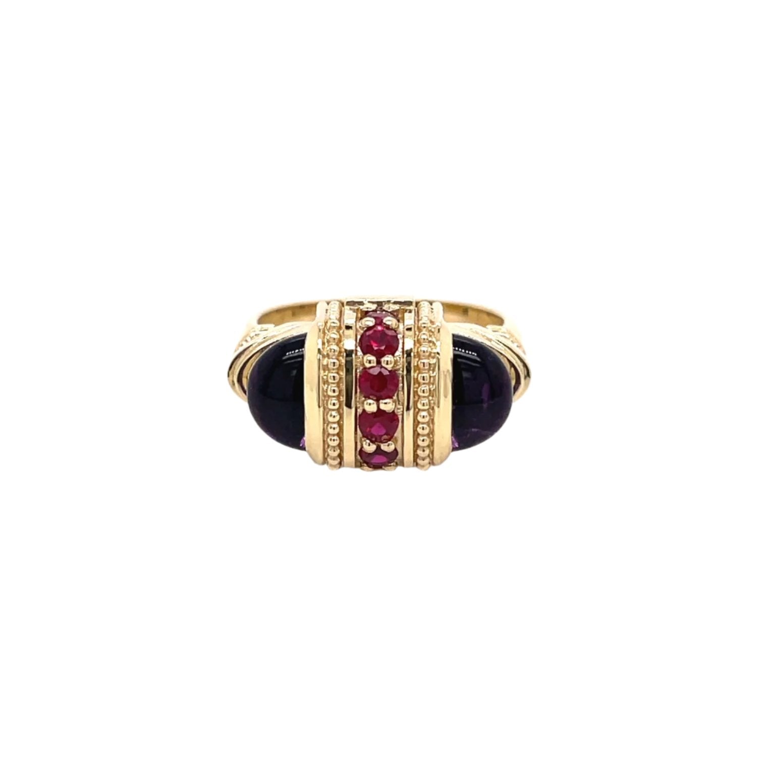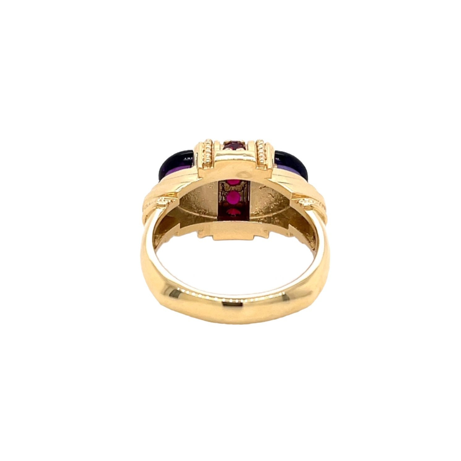 An 18k yellow gold "Arch" ring set with amethyst arches six 2.5mm rubies for a total of, .42ctw. This ring was made and designed by llyn strong.