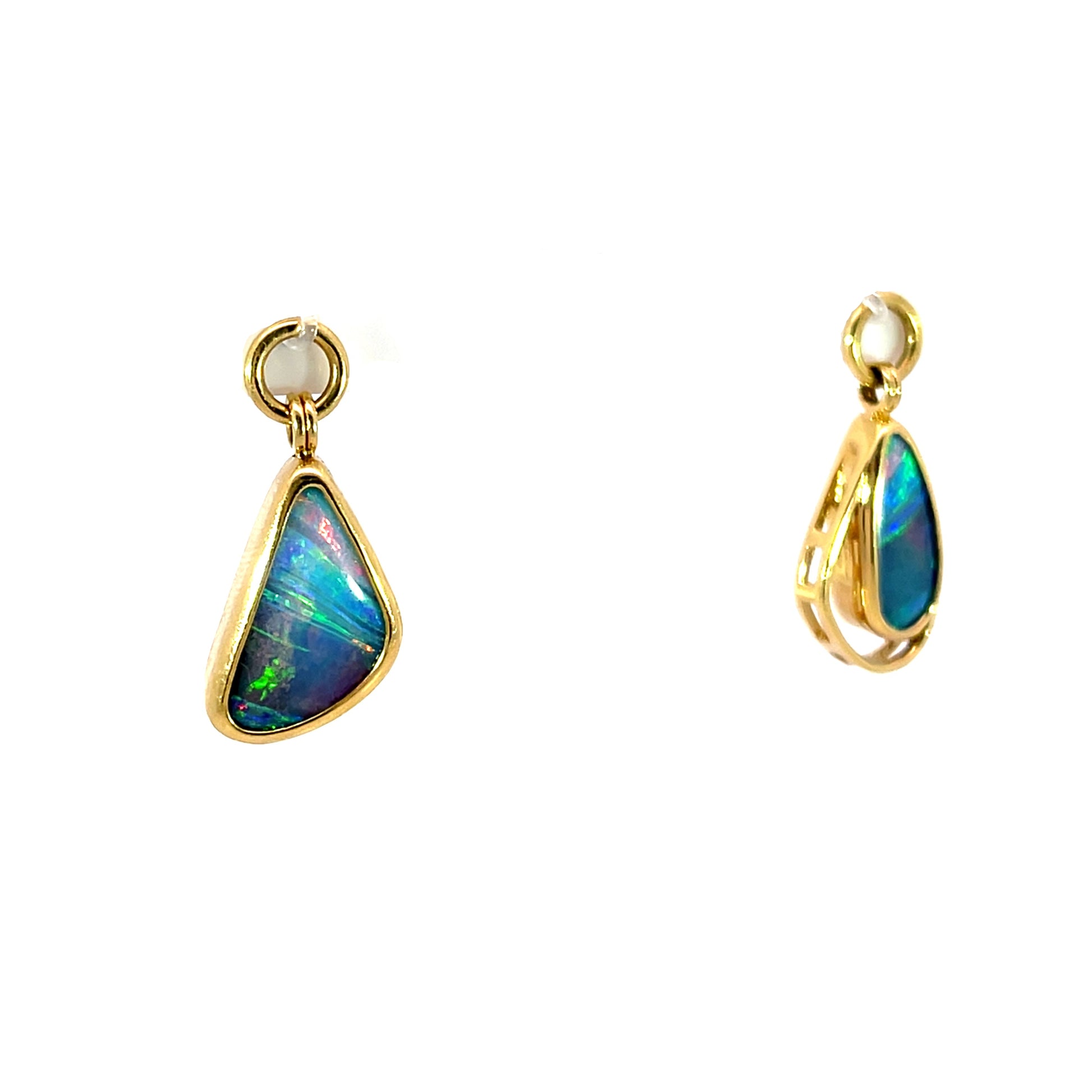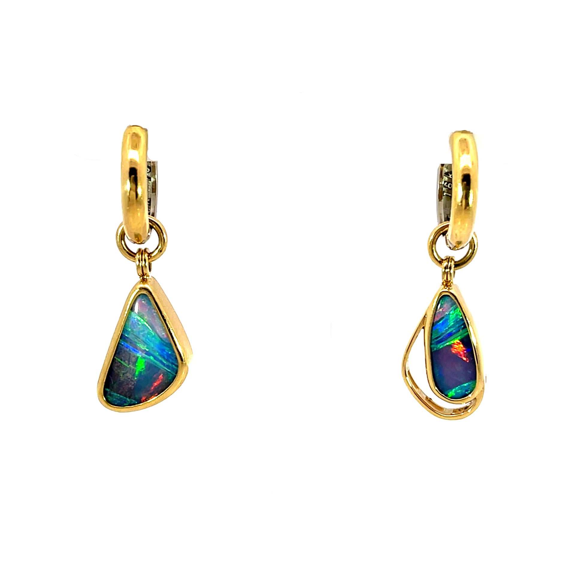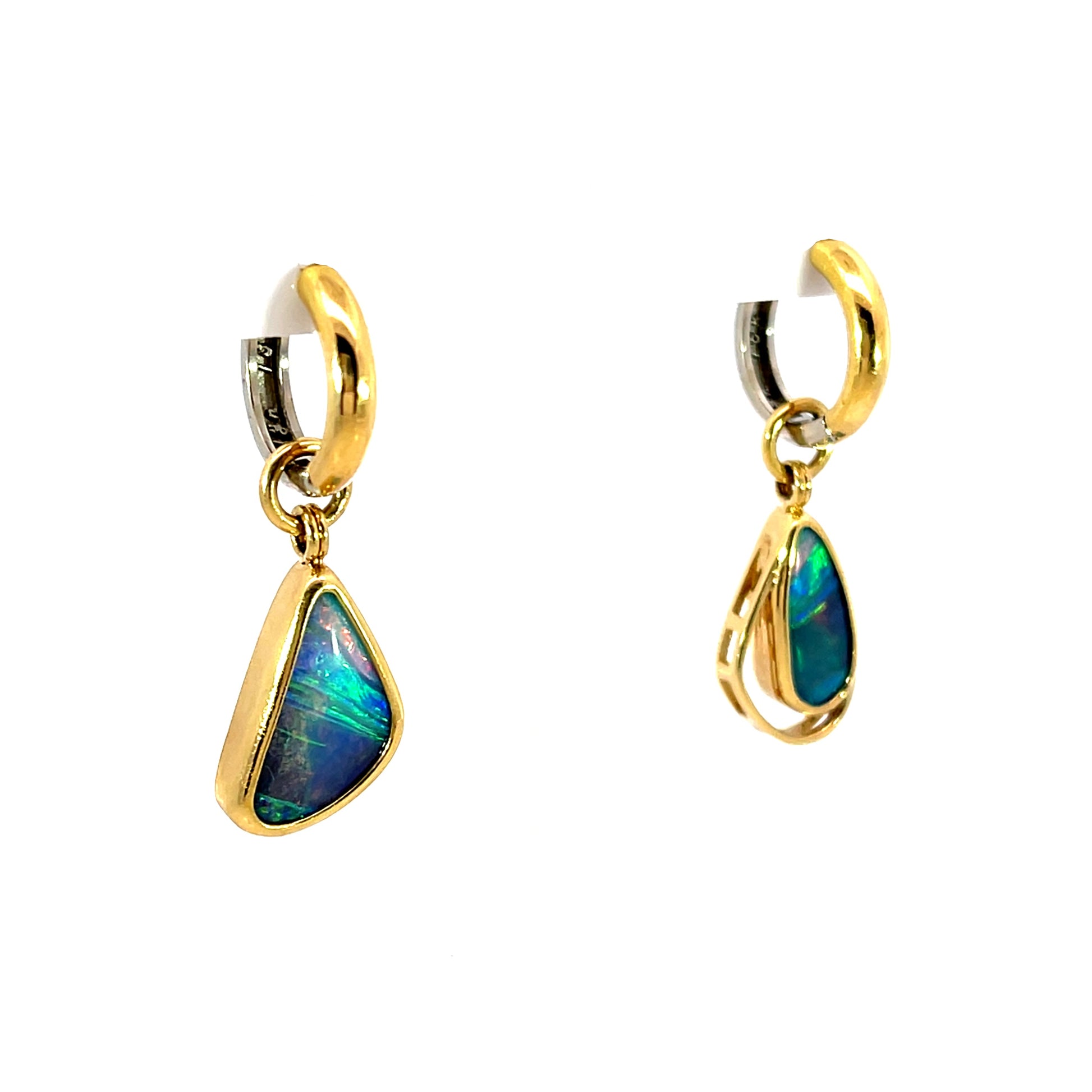 A pair of 18k yellow gold asymmetrical earring jackets bezel set boulder opals 5.5 total carat weight. These earring jackets were designed and made by llyn strong.