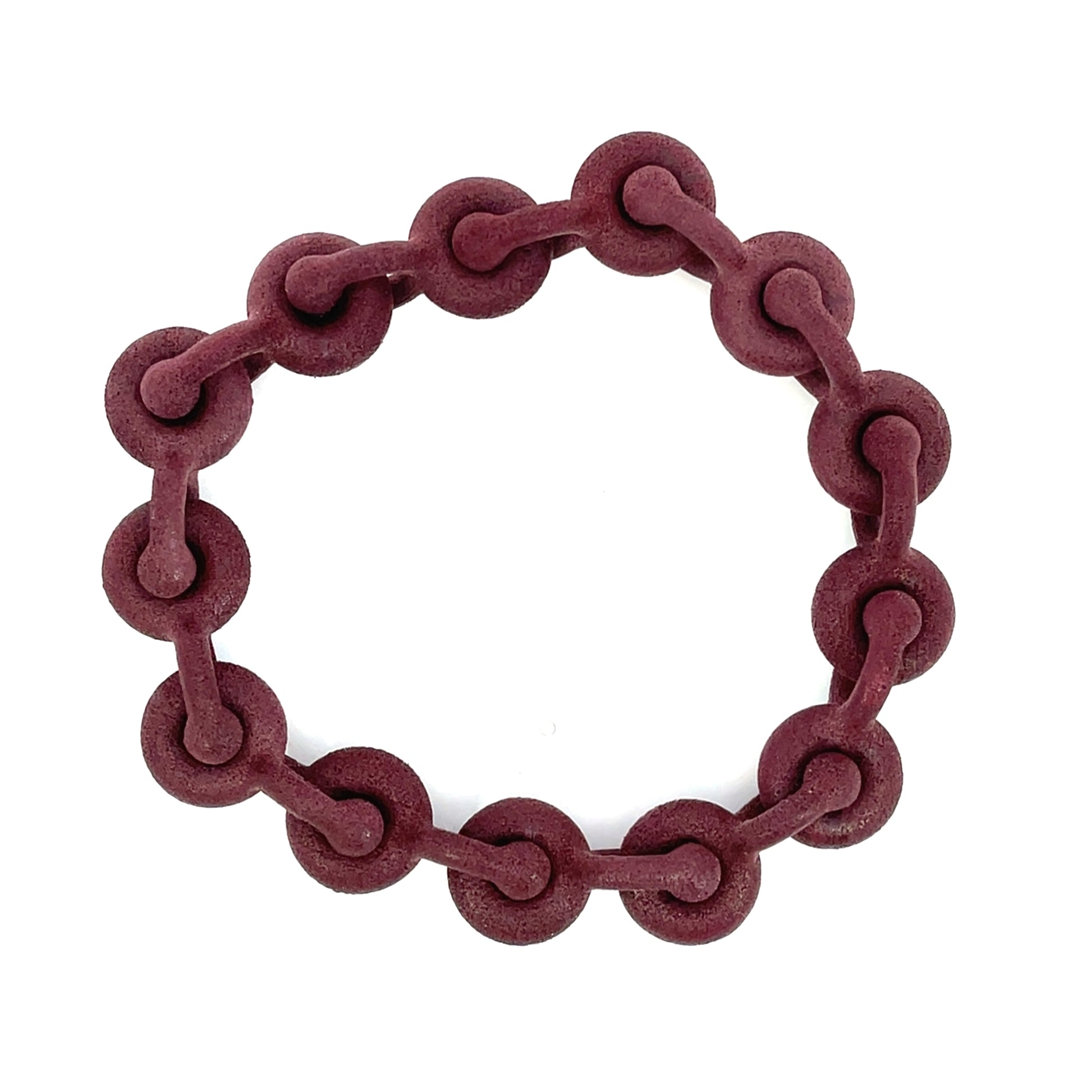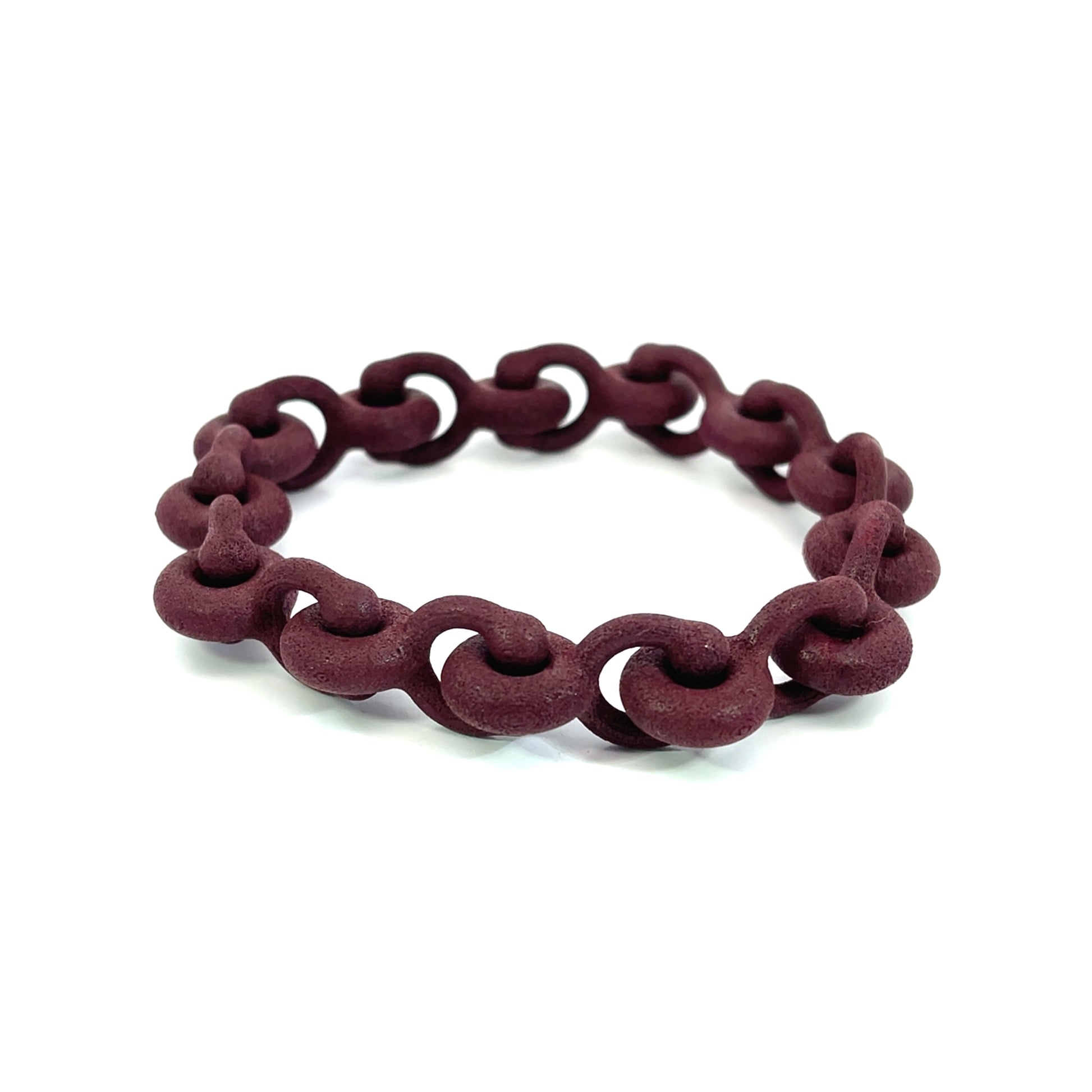 A hand-dyed, 8" long aubergine laser sintered (3D printed) nylon link bracelet. Designed and made by Erin Stuart.