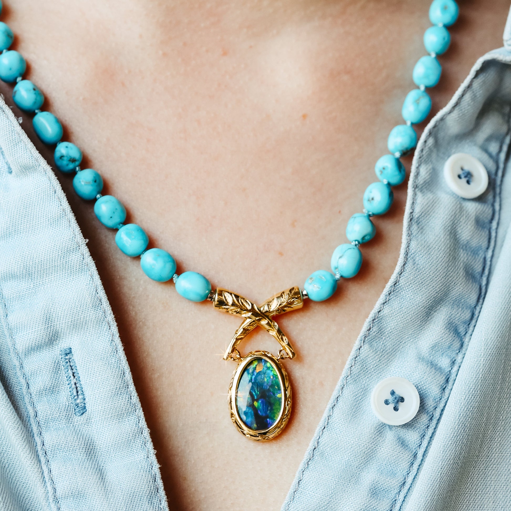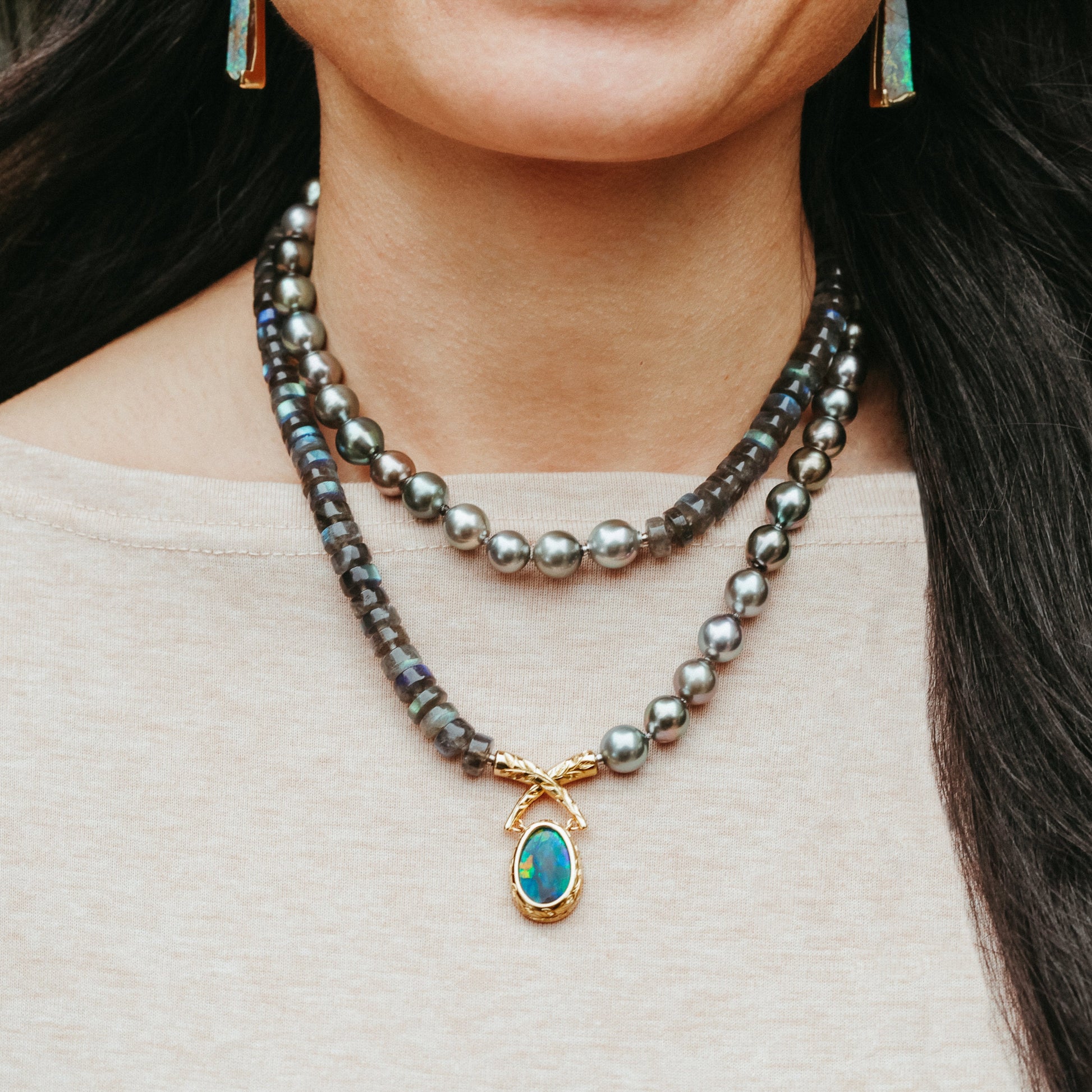 First model wearing the opal clasp on a strand of Tahitian pearls and a strand of rondel shaped labradorite.