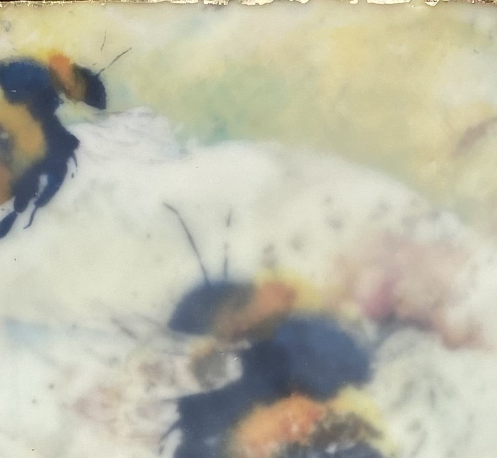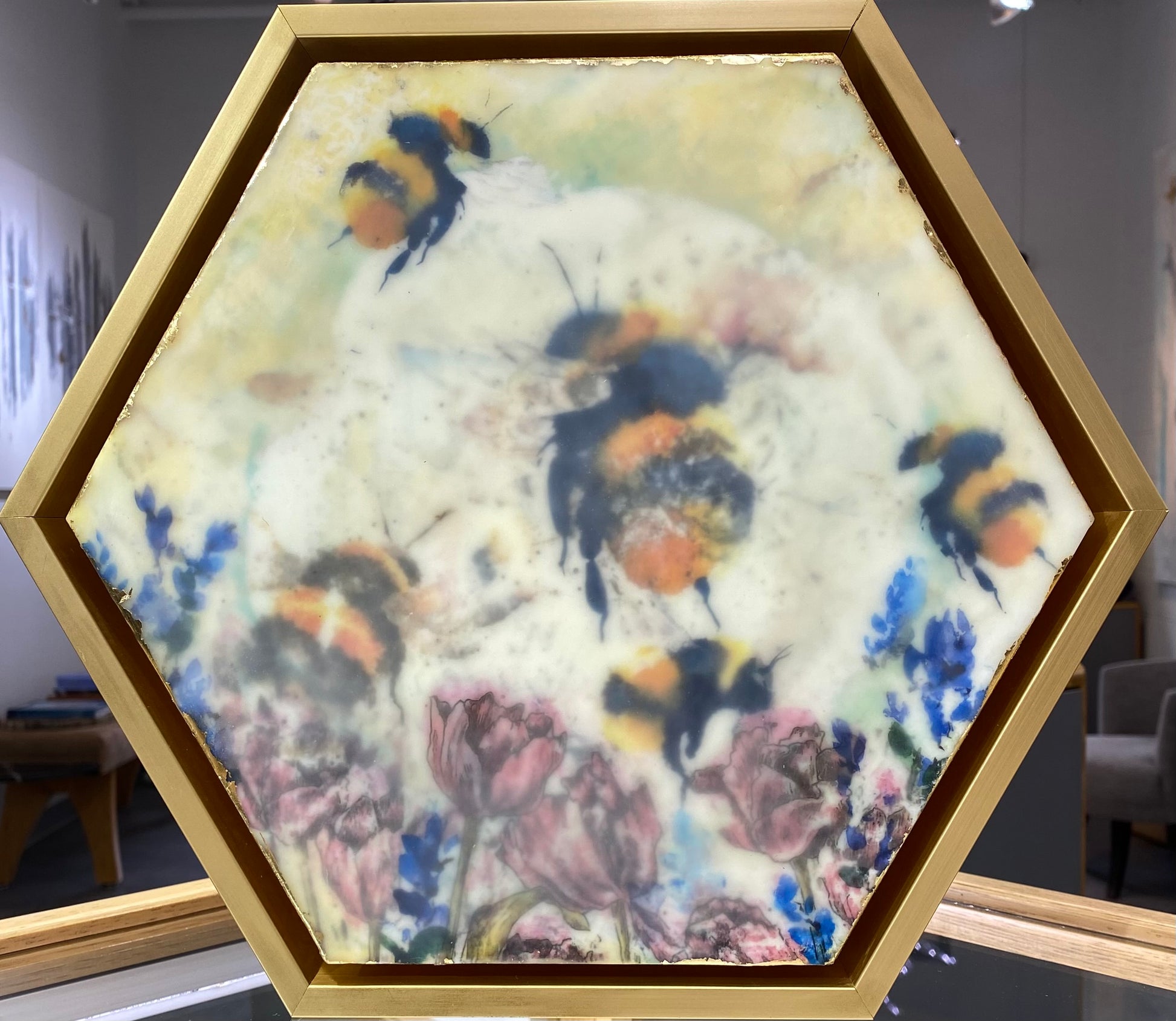 11.75"x 13.5"x.2.25" hexagonal framed. Encaustic, gold leaf, ink transfer and oil pan pastels and oil crayons painting by llyn strong.
