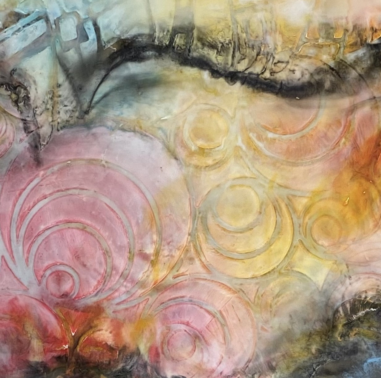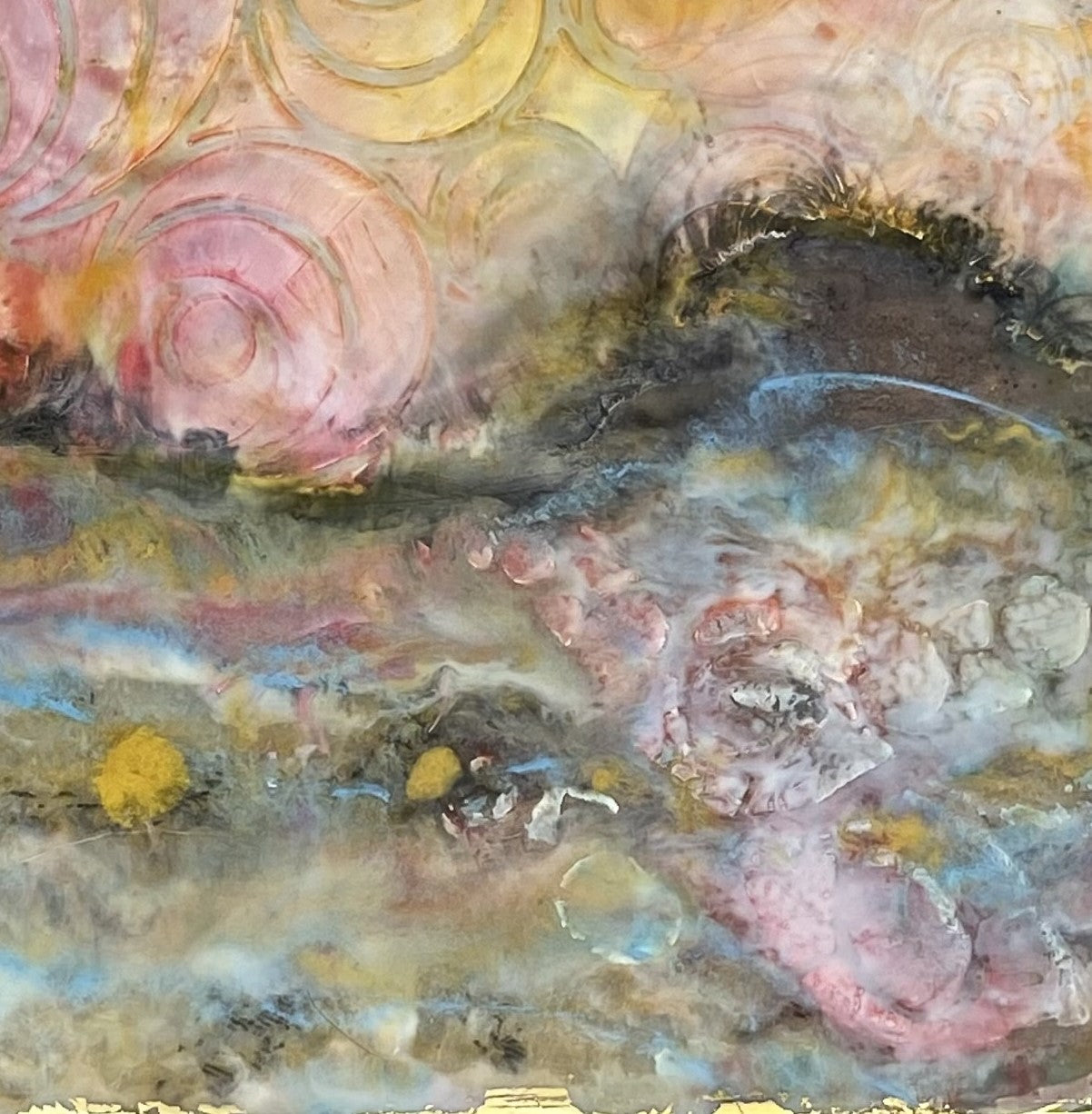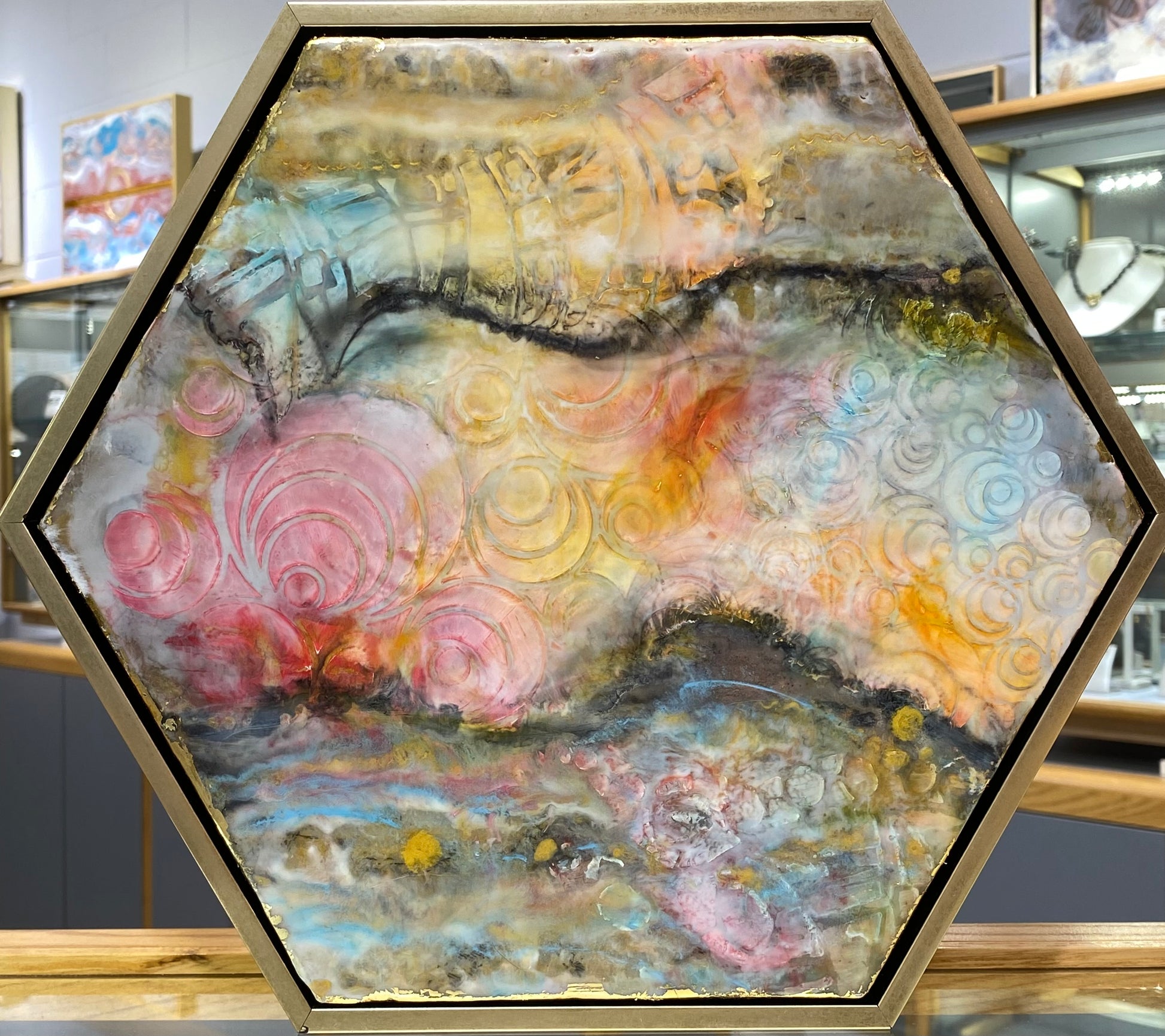 11.75"x 13.5"x.2.25" "Between The Lines" hexagonal framed painting. Encaustic, gold leaf, ink transfer and oil pan pastels and oil crayons painting by llyn strong.