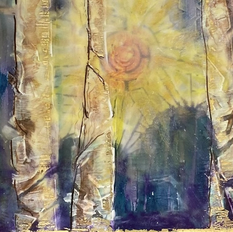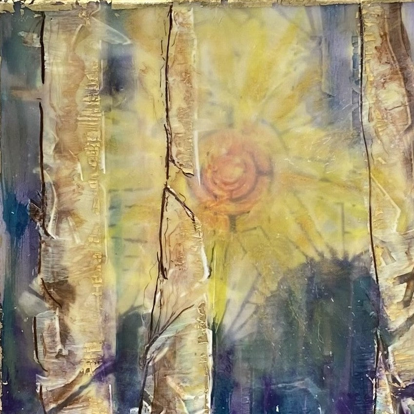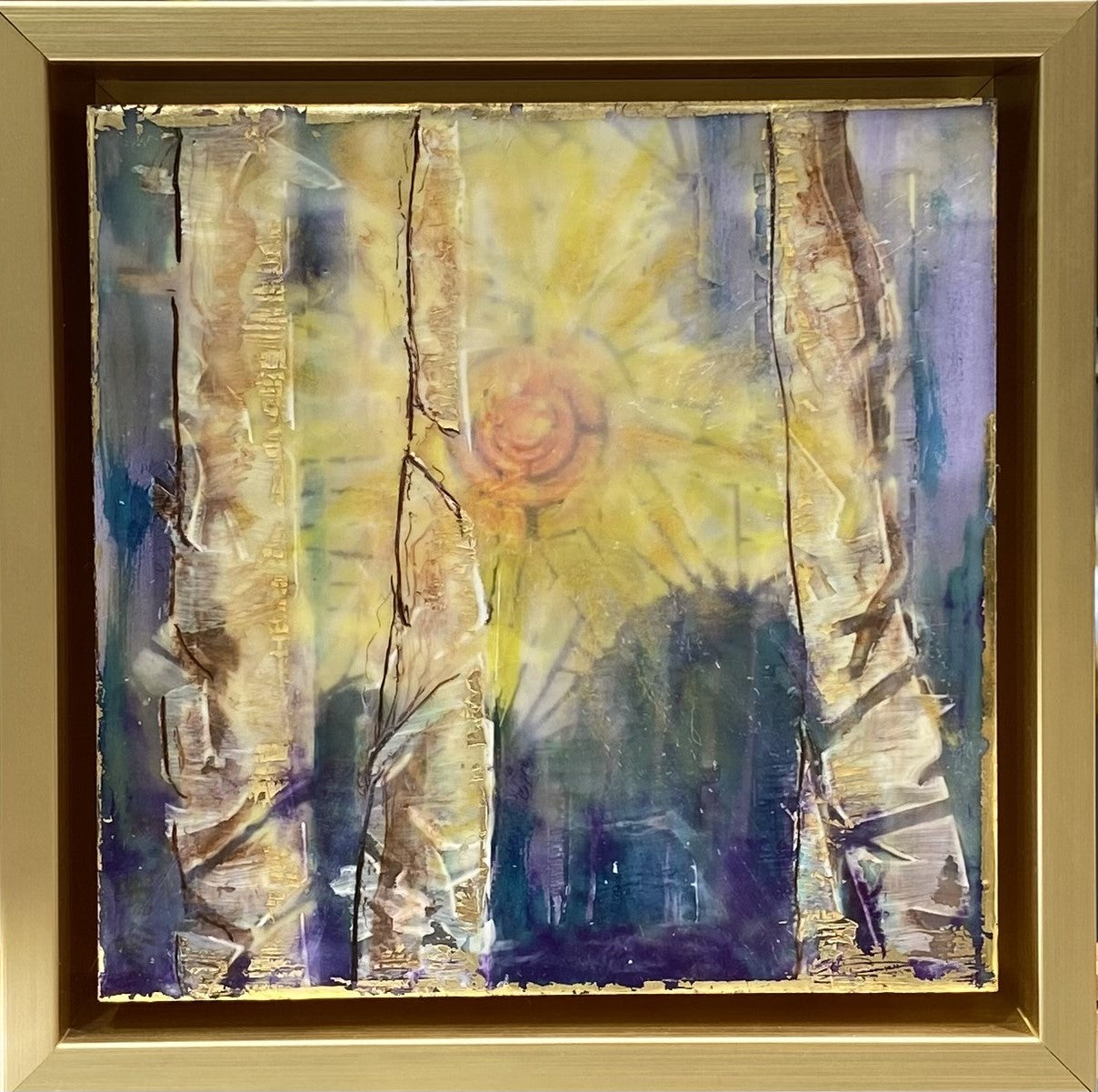 "Between the Trees 3" is an encaustic, oil, pastel and chalk paste painting by llyn strong. The painting measures 7.25" X 7.25" X 2.5" framed.