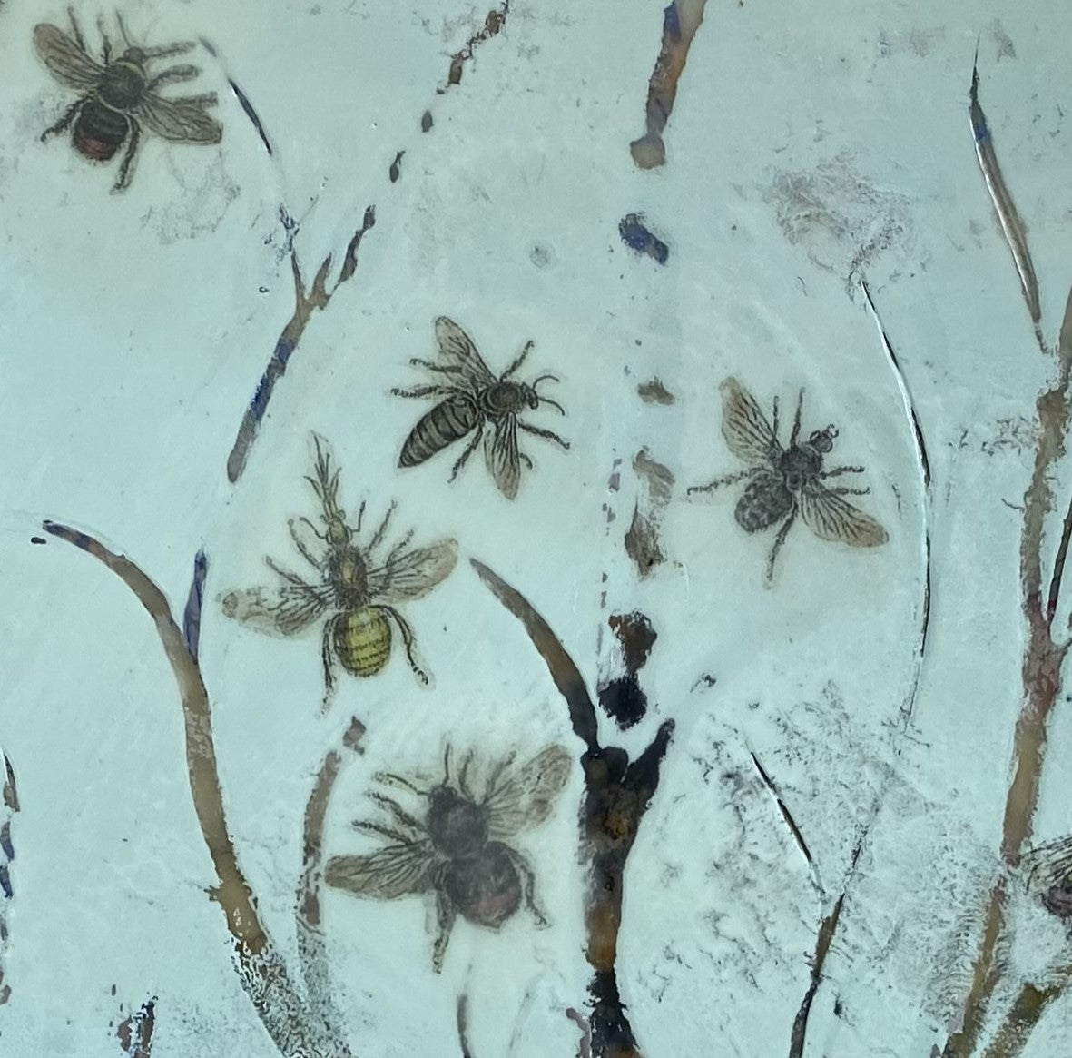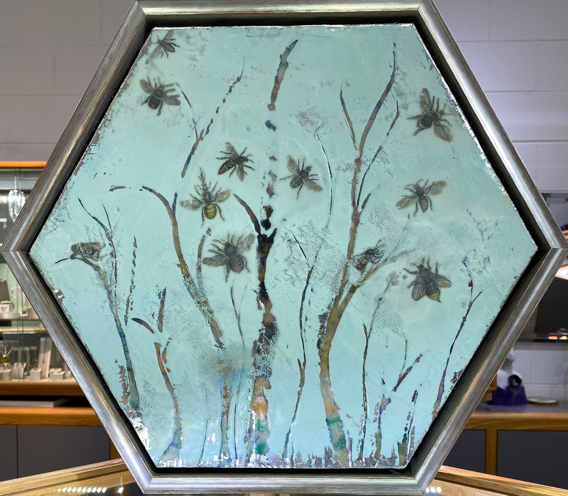 18 x15.5"x2.25" octagonal shaped frame. Encaustic, silver leaf, ink transfer and oil pan pastels and oil crayons painting by llyn strong.