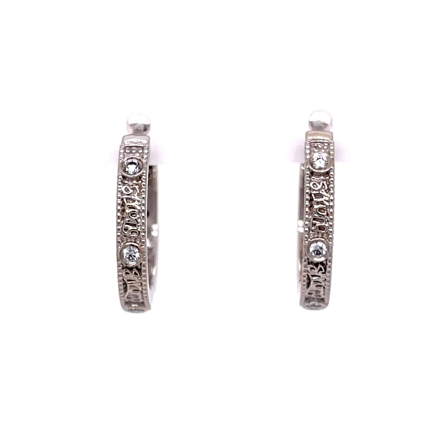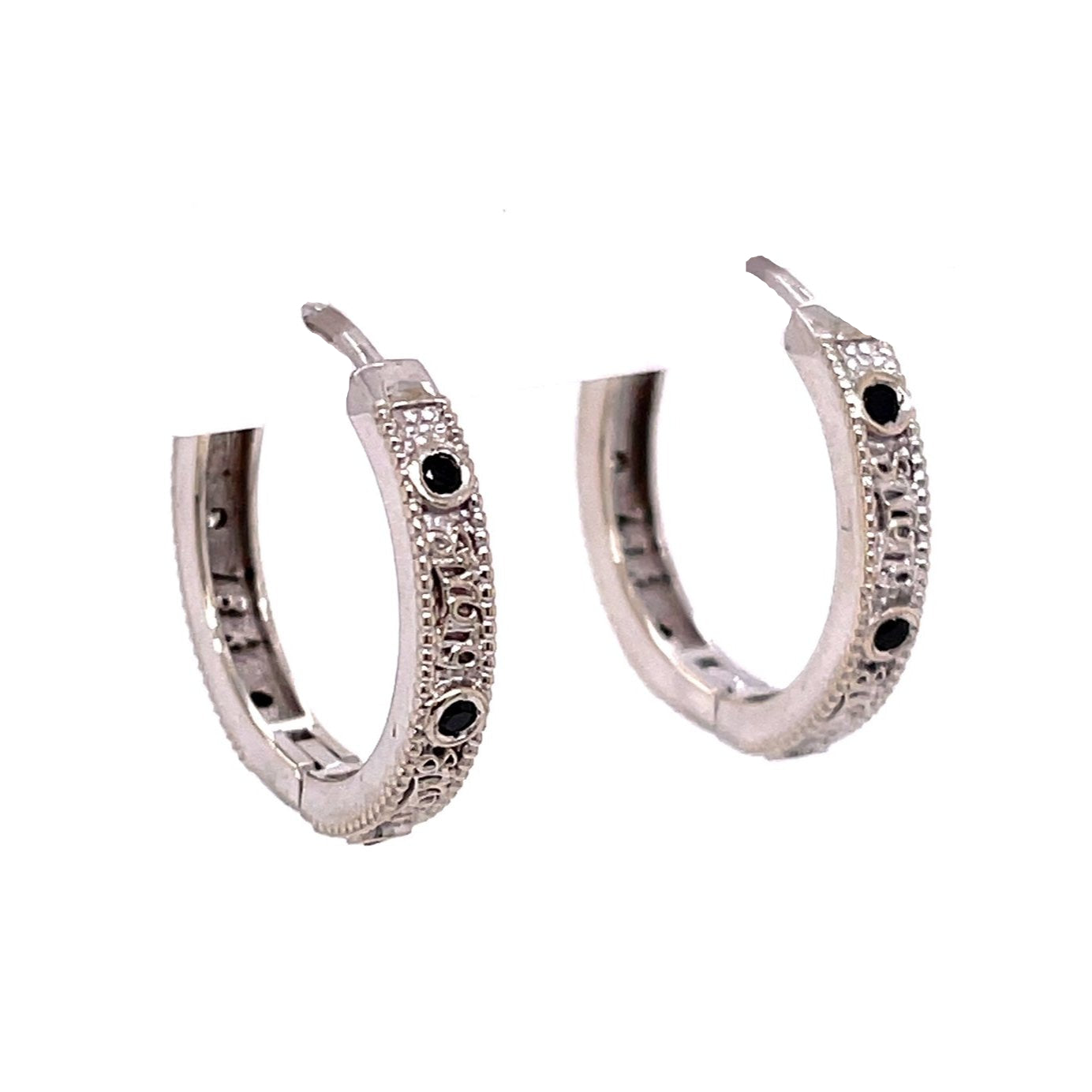 A pair of 18k white gold "Strong Pair" Hoops set with .12 carats of 1.5mm white diamonds, and .12 carats of 1.5mm black diamonds. These hoops were made and designed by llyn and Sydney Strong.
