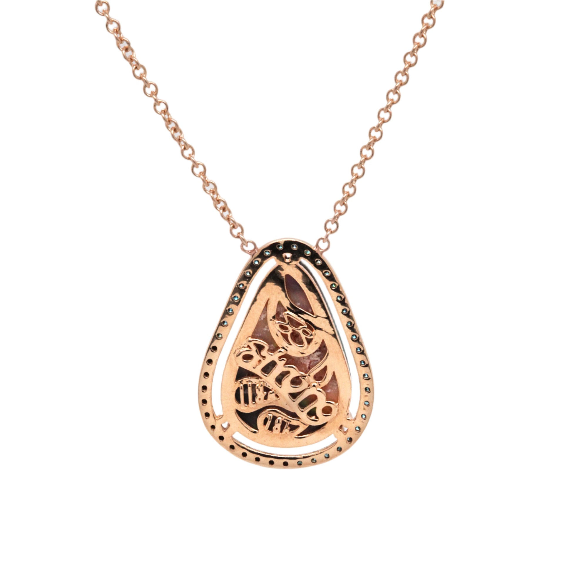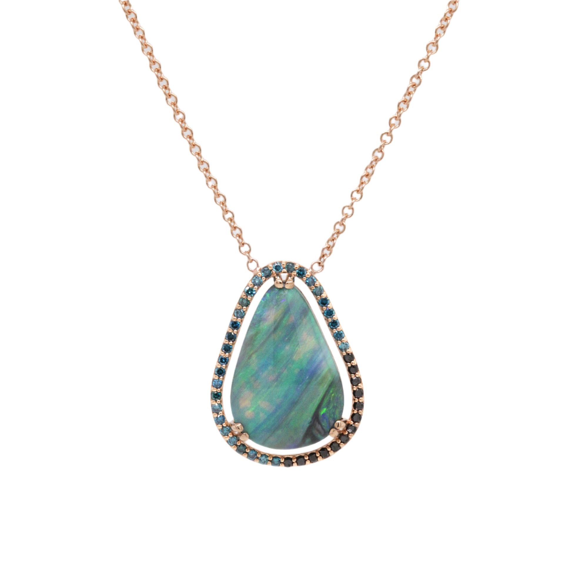 An 18k rose gold "Strong Pair" necklace set with 4.29 carat black opal, .26 carats of teal diamonds, and .09 carats of black diamonds. This necklace was made and designed by llyn and Sydney Strong.