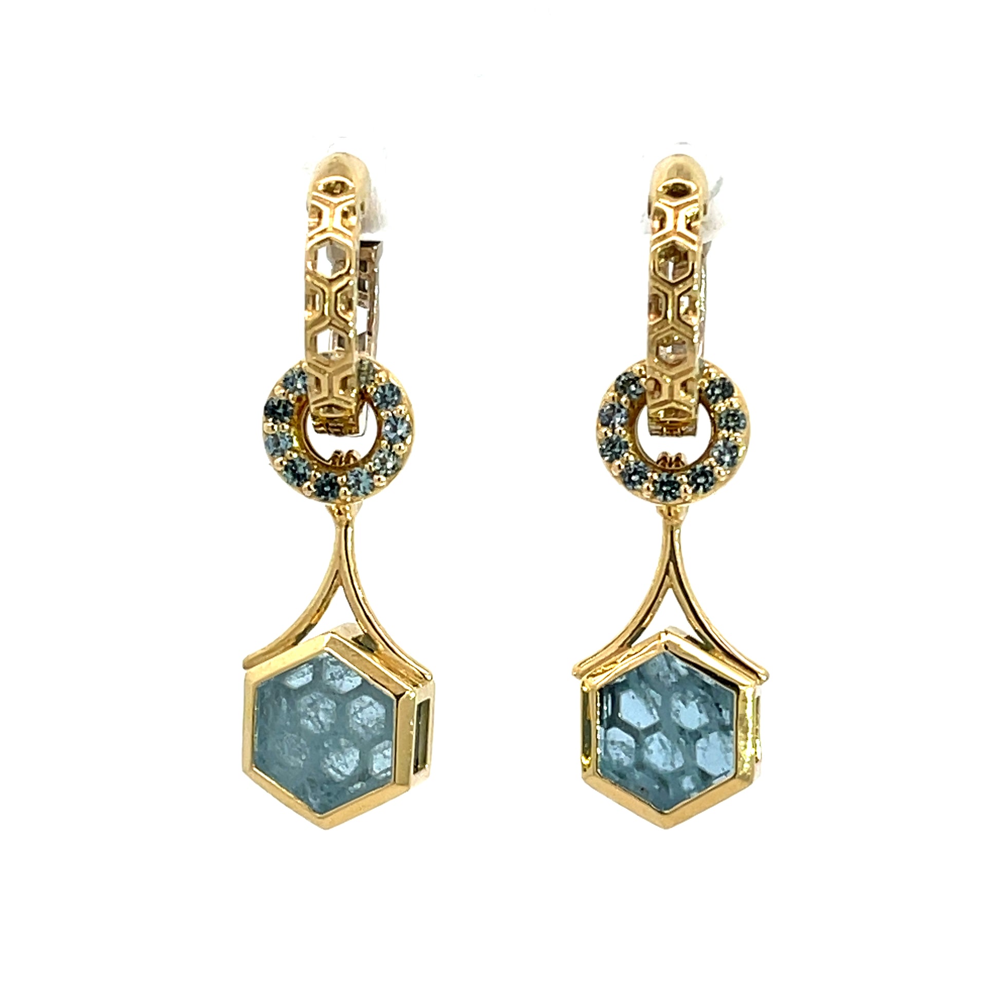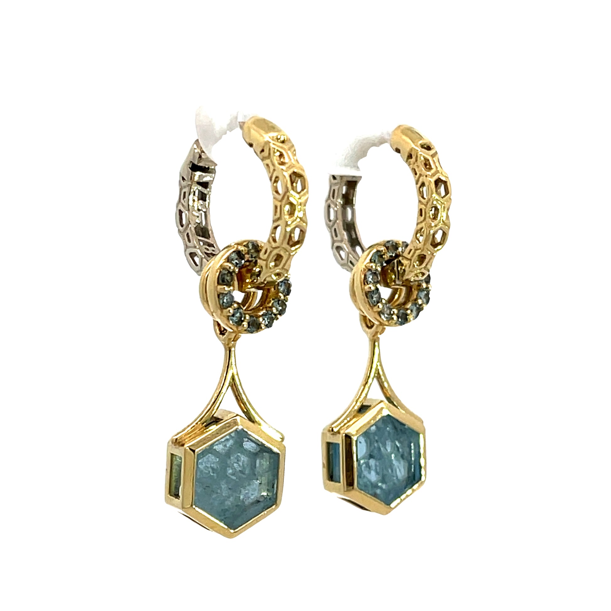 Shown with Reversible 18k Yellow and White Gold Honeycomb Hoops and 18k Yellow Gold Aquamarine Hexagon Jackets.
