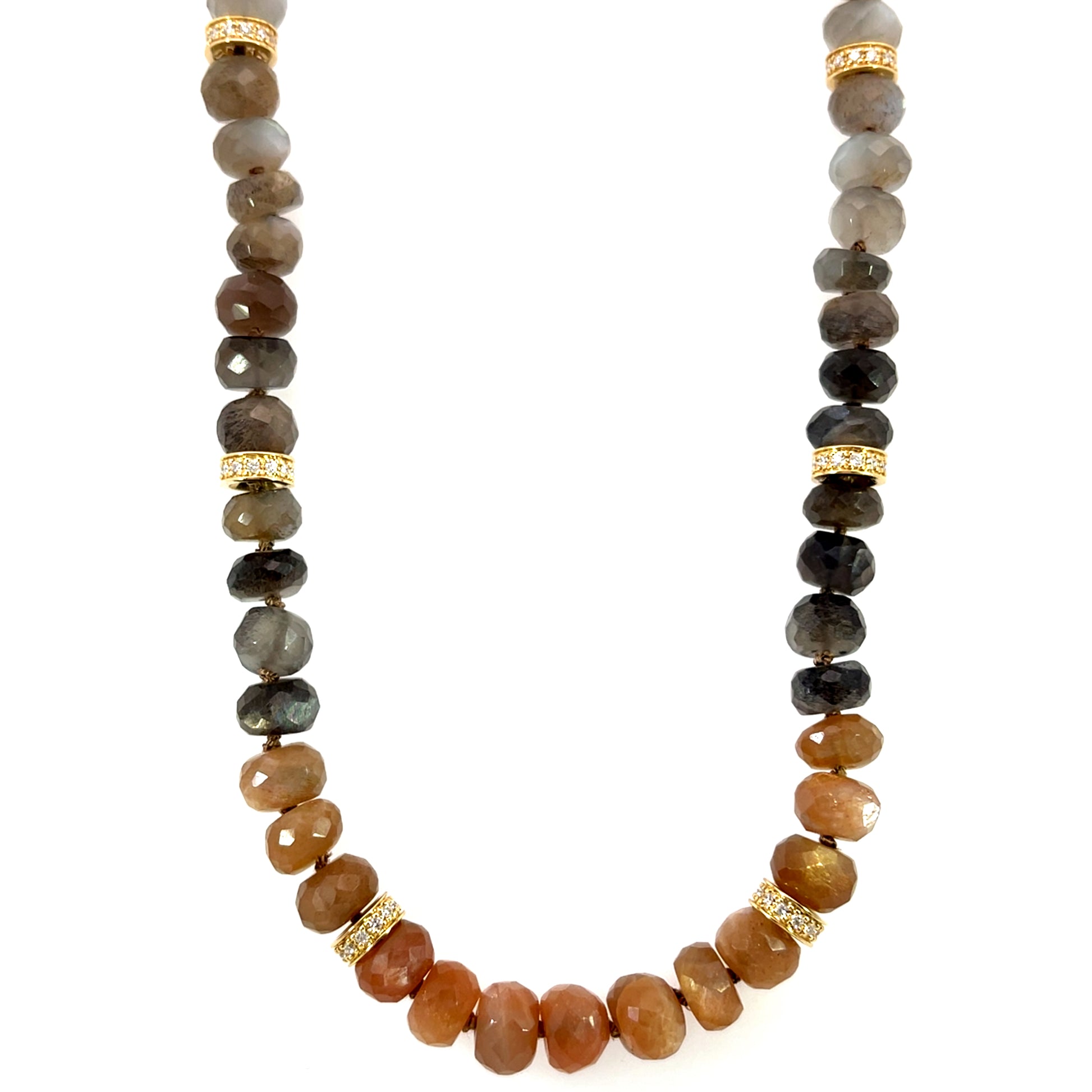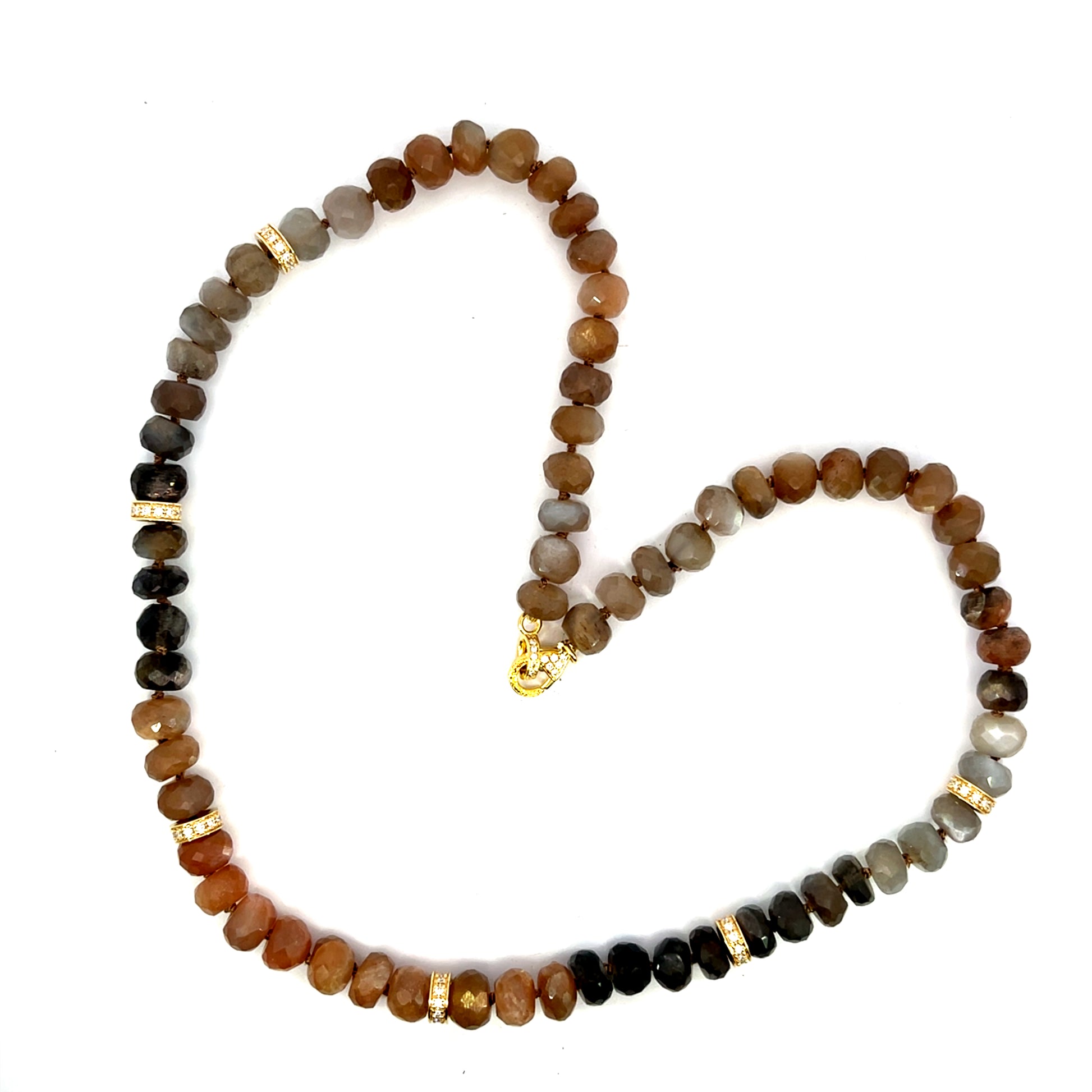 A faceted brown moonstone necklace with 18k yellow gold and G-H, I1 diamond beads and clasp with a total carat weight of 1.38. 16.5" long. This necklace was made and designed by llyn strong.