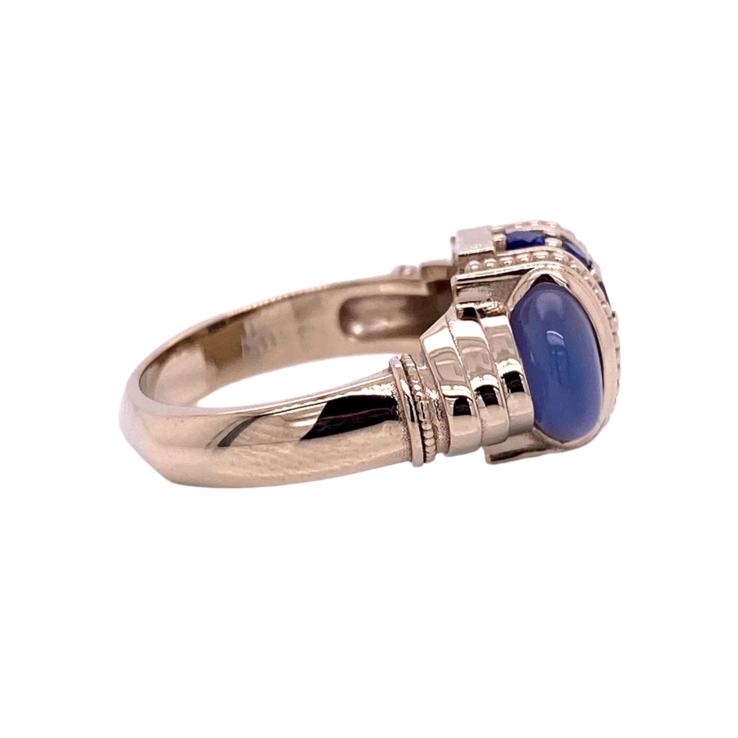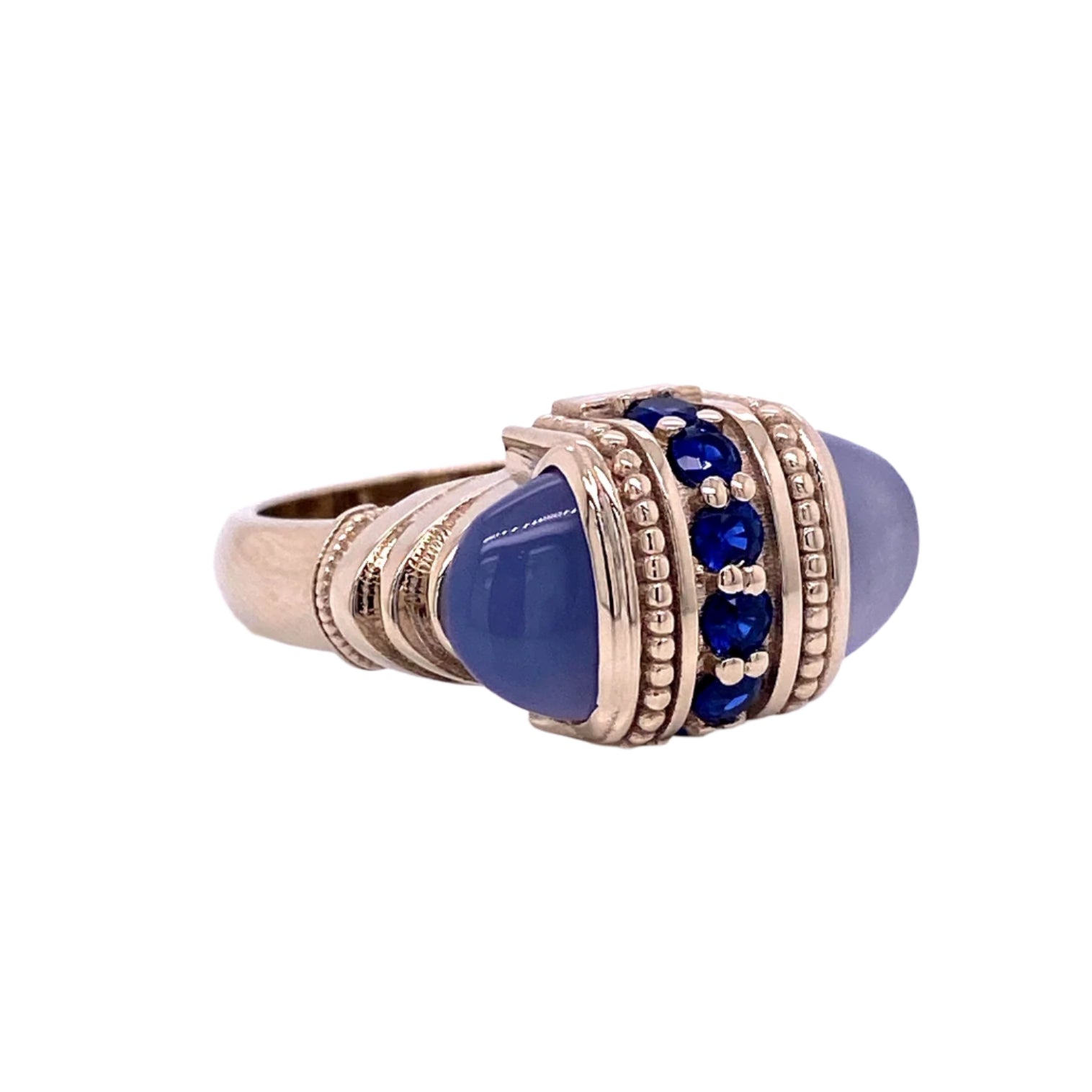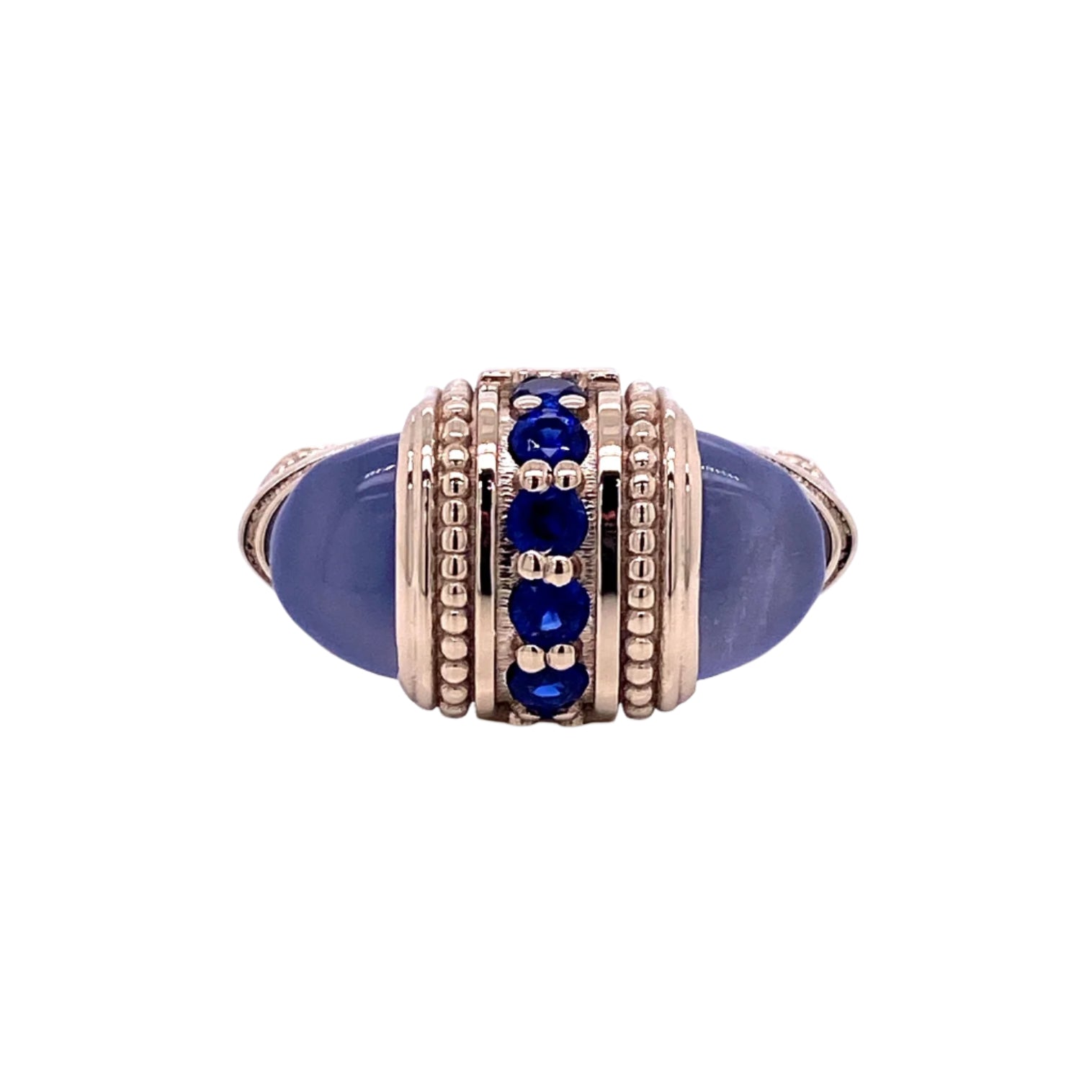 Ladies 18k white gold arch ring set with chalcedony shapped arches and six 2.5mm light blue sapphires, .42ctw. The ring was designed and made by llyn strong.
