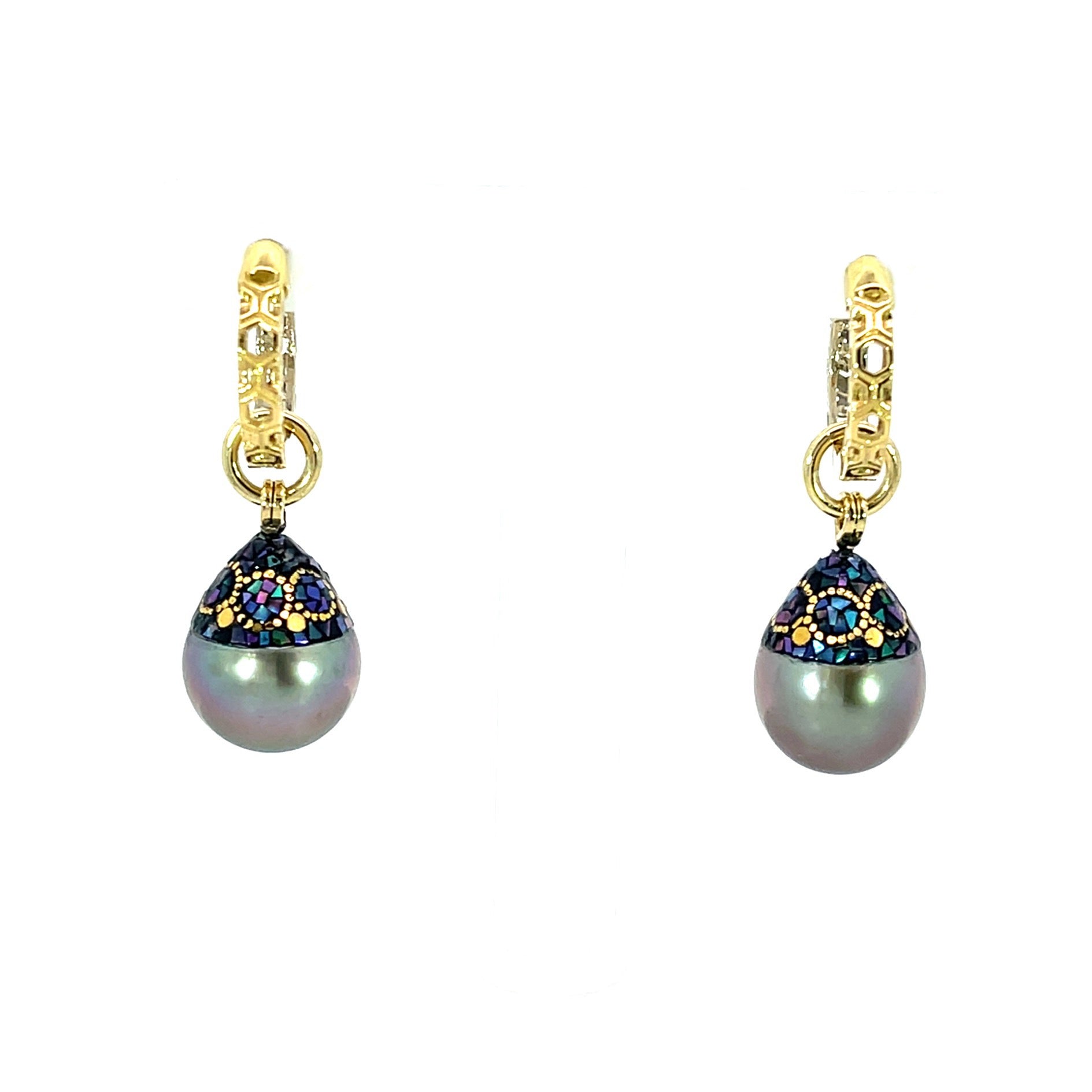 A pair of mother of pearl circle motif Maki-e Tahitian drop pearl earring jackets with 18k yellow gold rings. These earring jackets were made and designed by llyn strong.