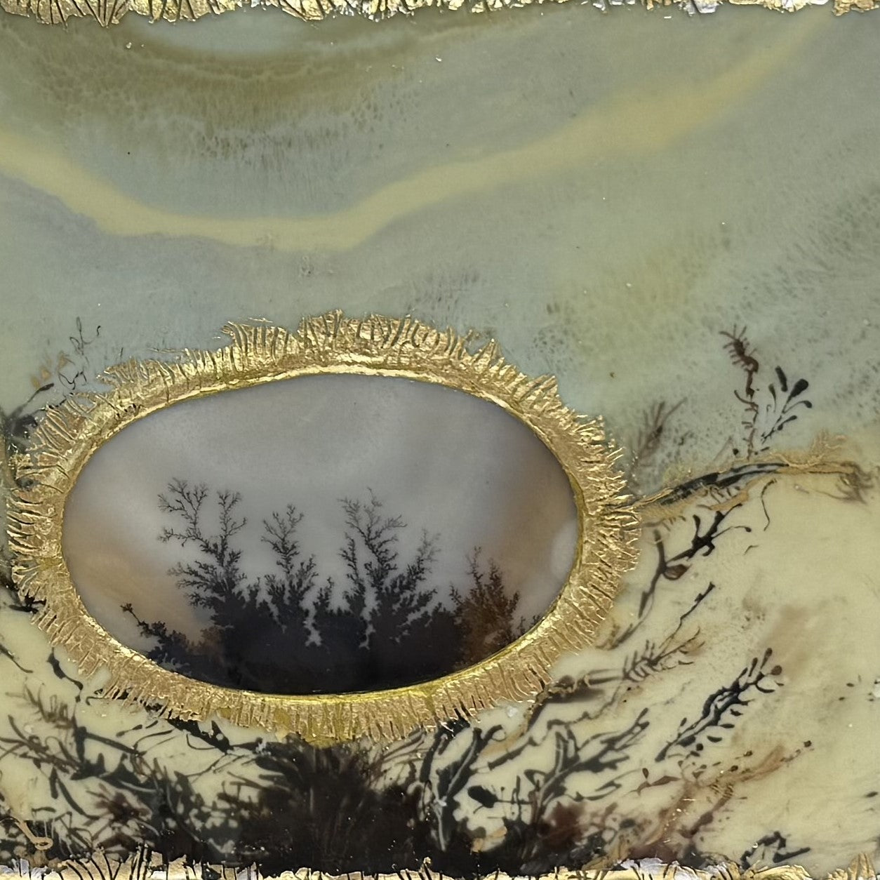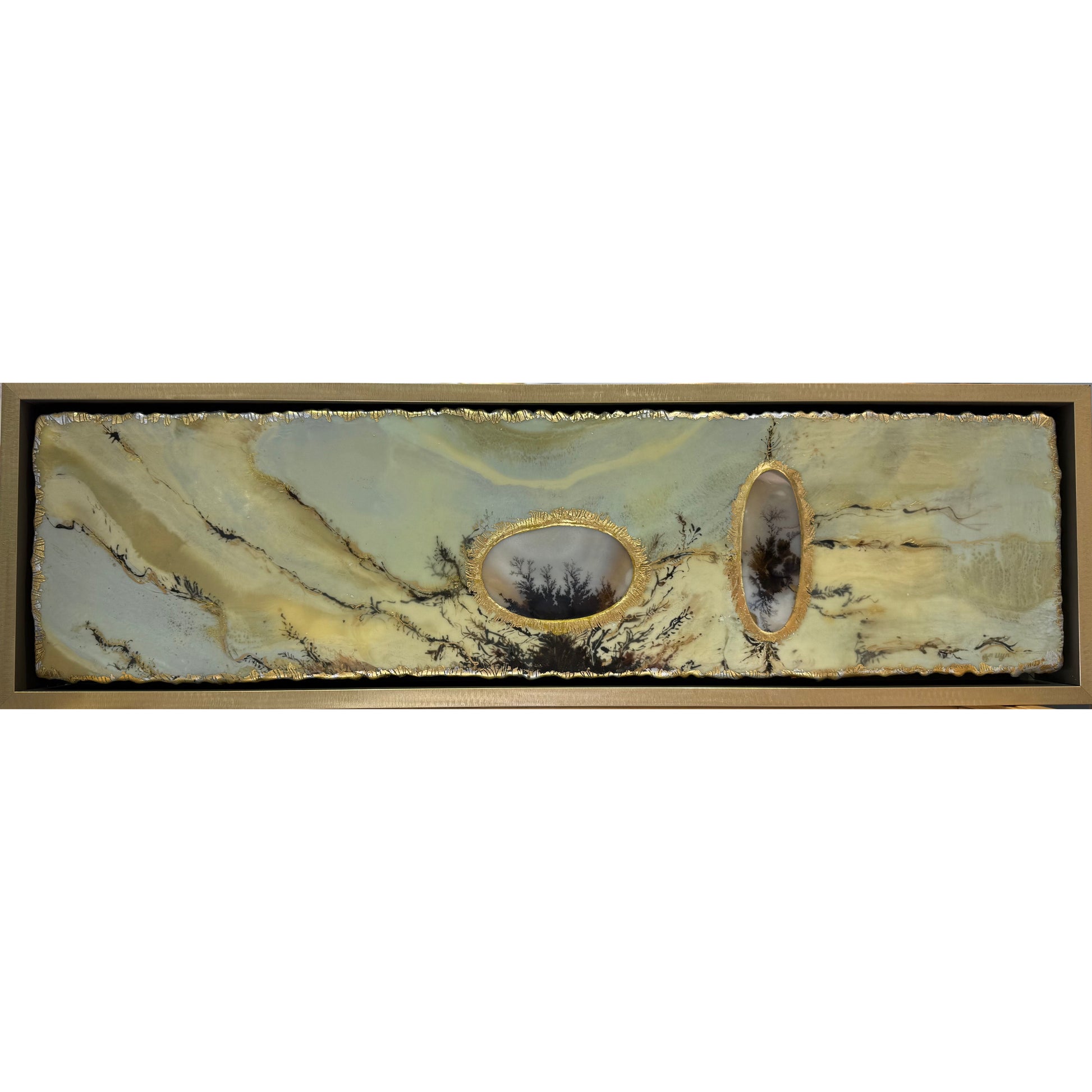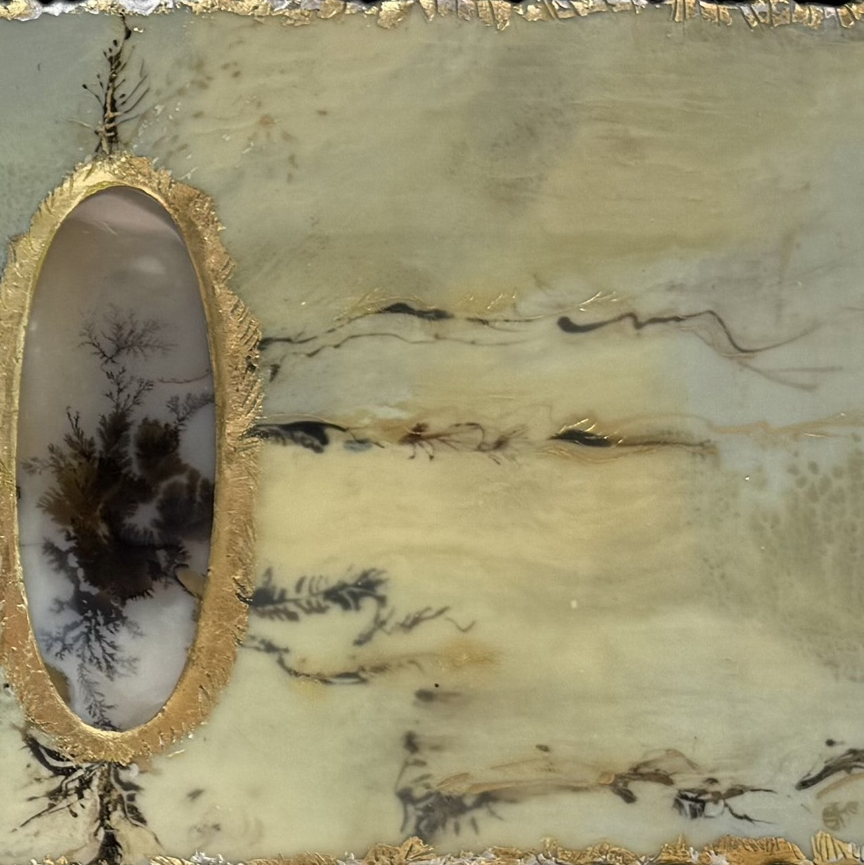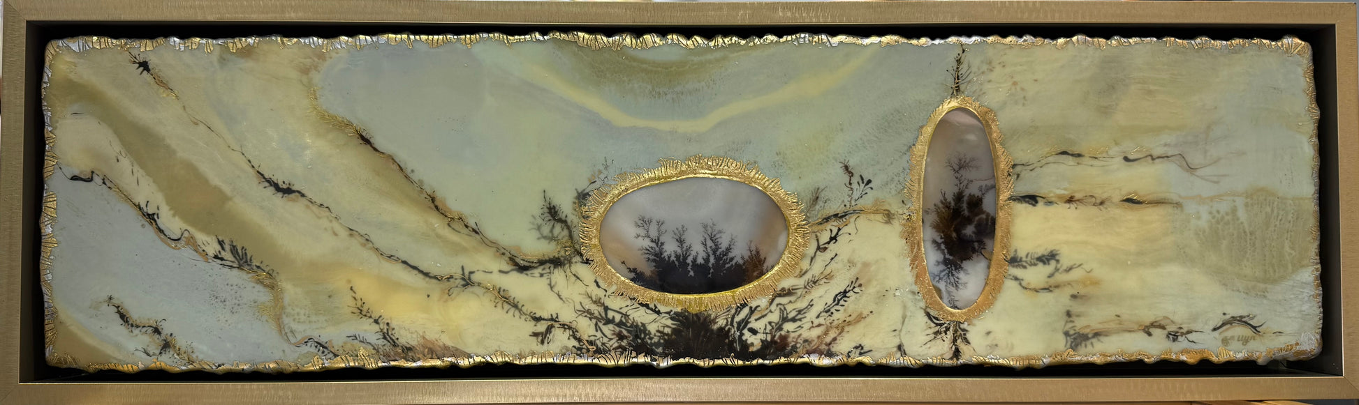 Encaustic and oil paint and india ink with gold and silver leaf and 2 natural dentritic agates from the Banda region in Northern India. One dentritic agate measures 98.6mm x 57mm and the other agate measures 98.3mm x 35.9mm. This painting was made by llyn strong.