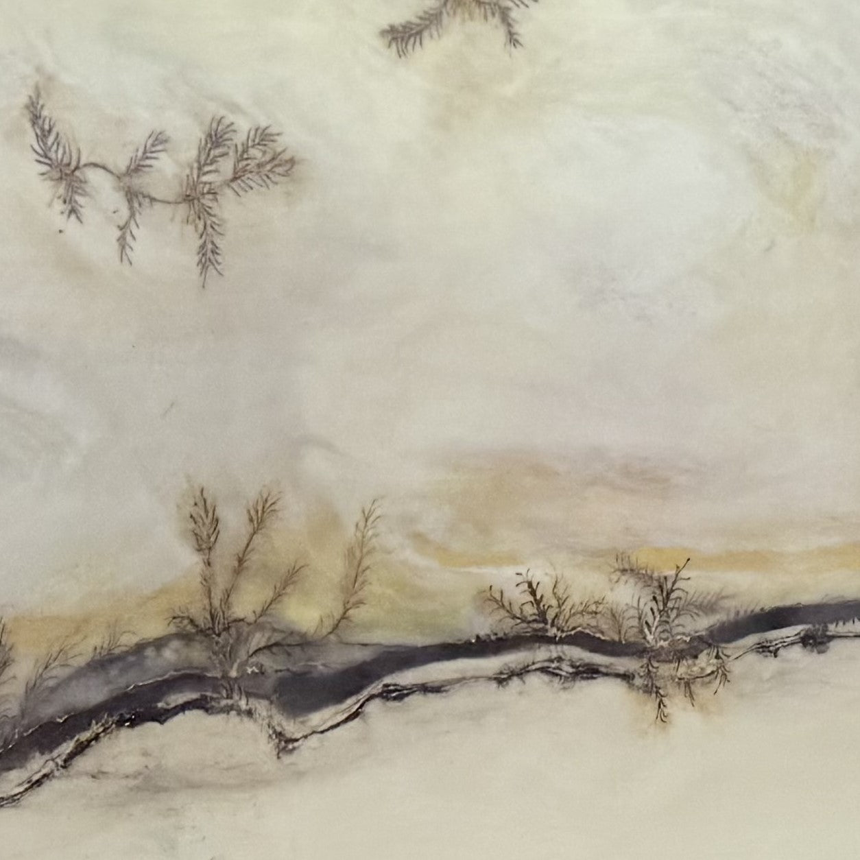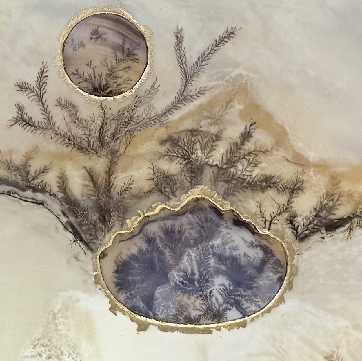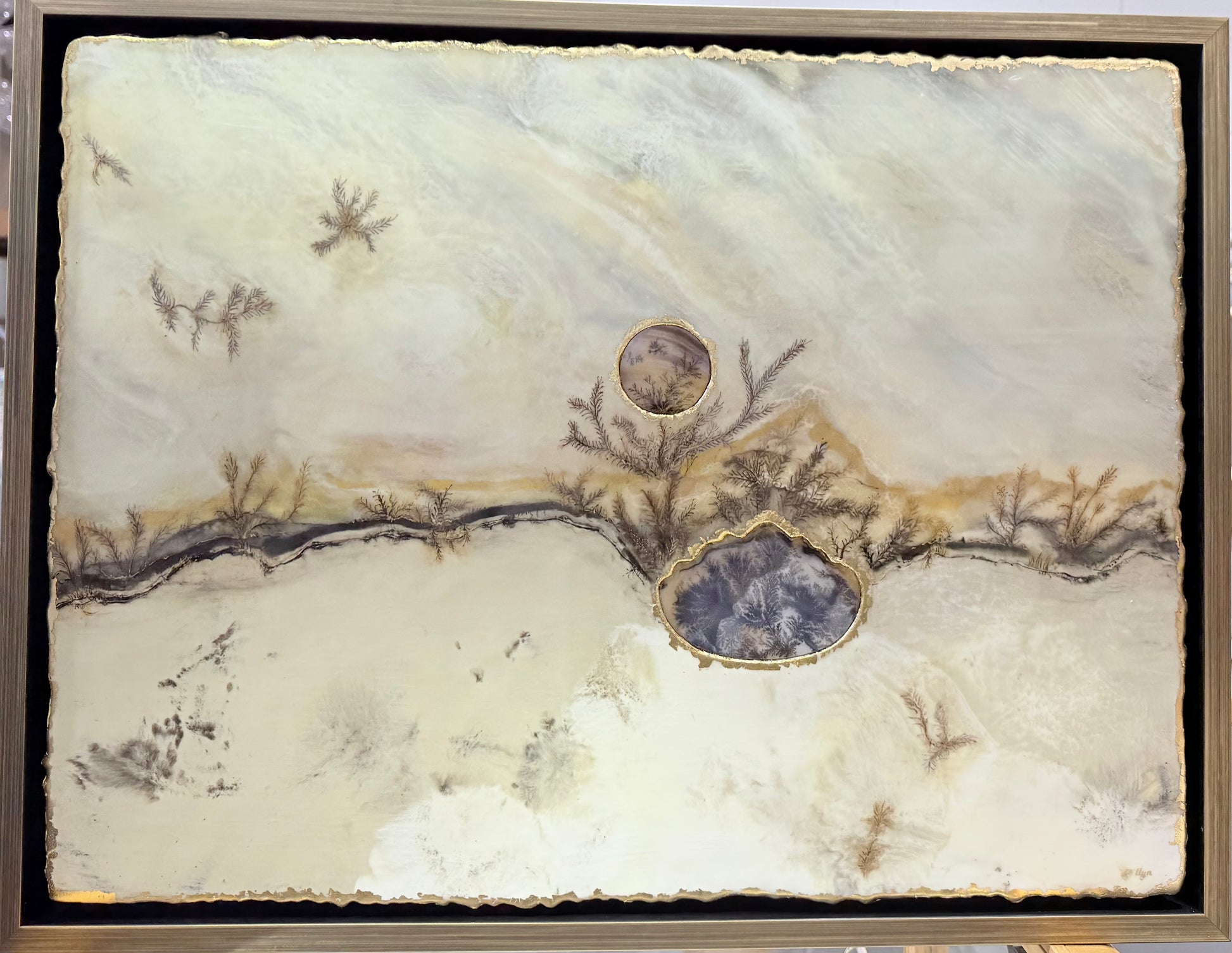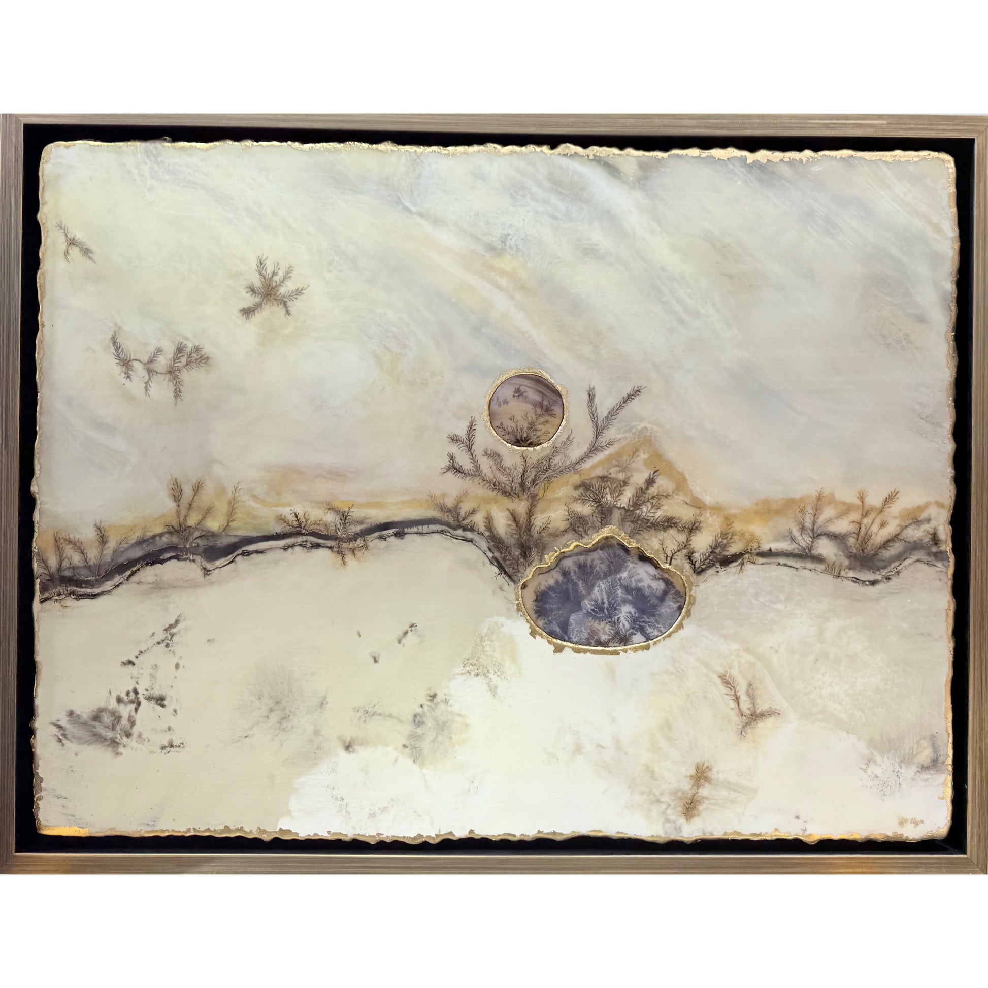 26" x 20" x 2.25". "Dentritic Portal 22" is an encaustic and oil painting with India ink, gold leaf, and two dentritic agates, one 50mm and the other 75mm X 111mm both from the Banda region in Northern India. This painting was made by llyn strong.