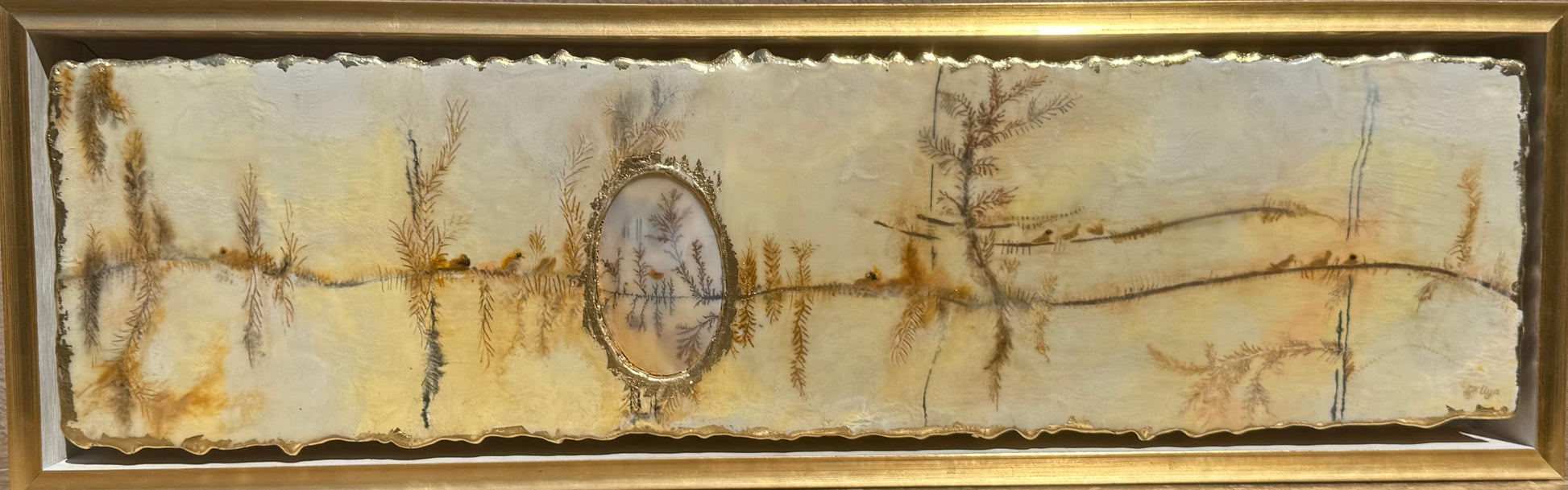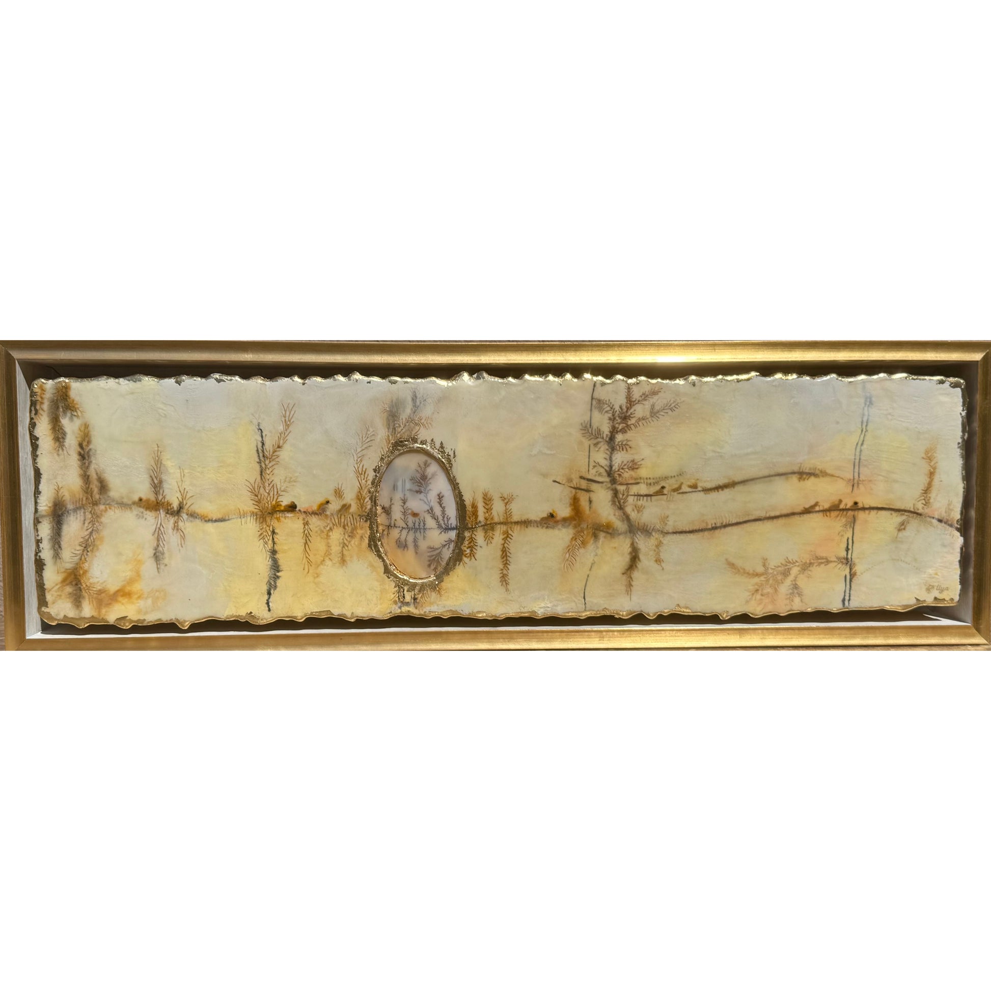 26" x 8 "x 2.75". Encaustic and oil paint with gold leaf and a natural 52mm x87mm oval dentritic agate from the Banda region in Northern India. This painting was made by llyn strong.