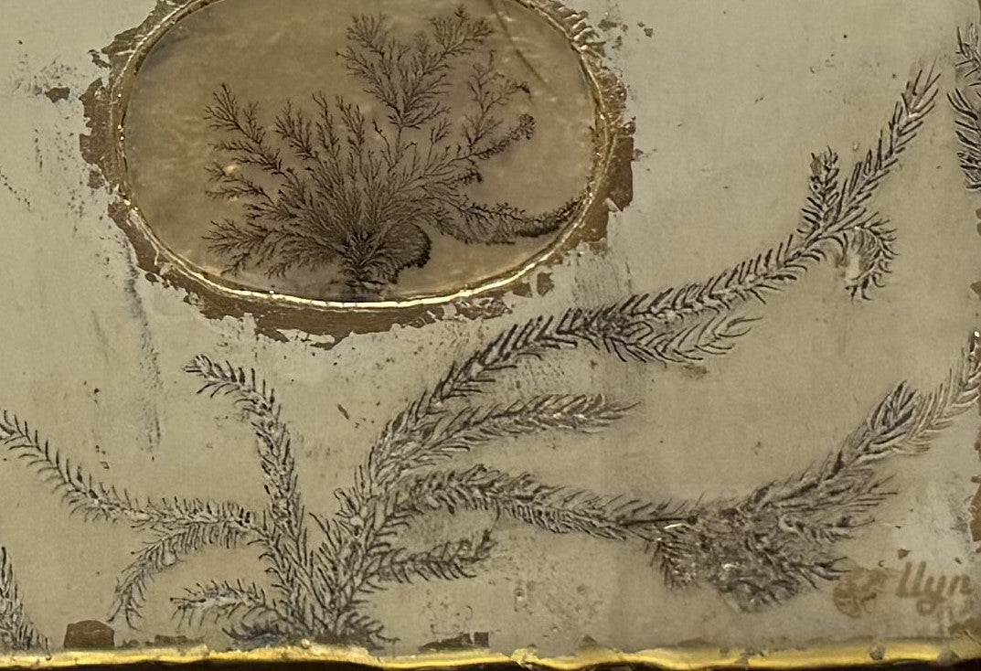Encaustic and oil paint with silver leaf and a natural 41mm x 62mm oval dentritic agate from the Banda region in Northern India. This painting was made by llyn strong.