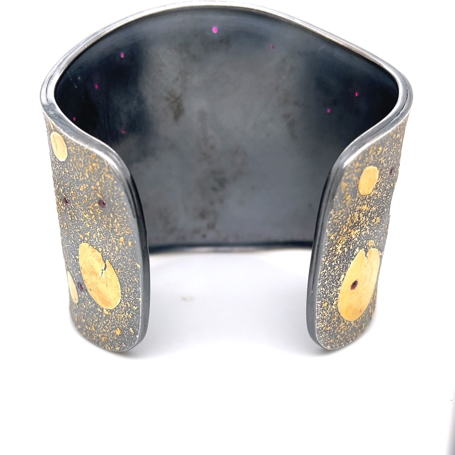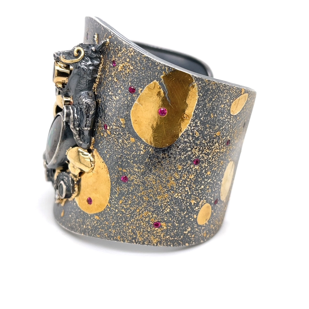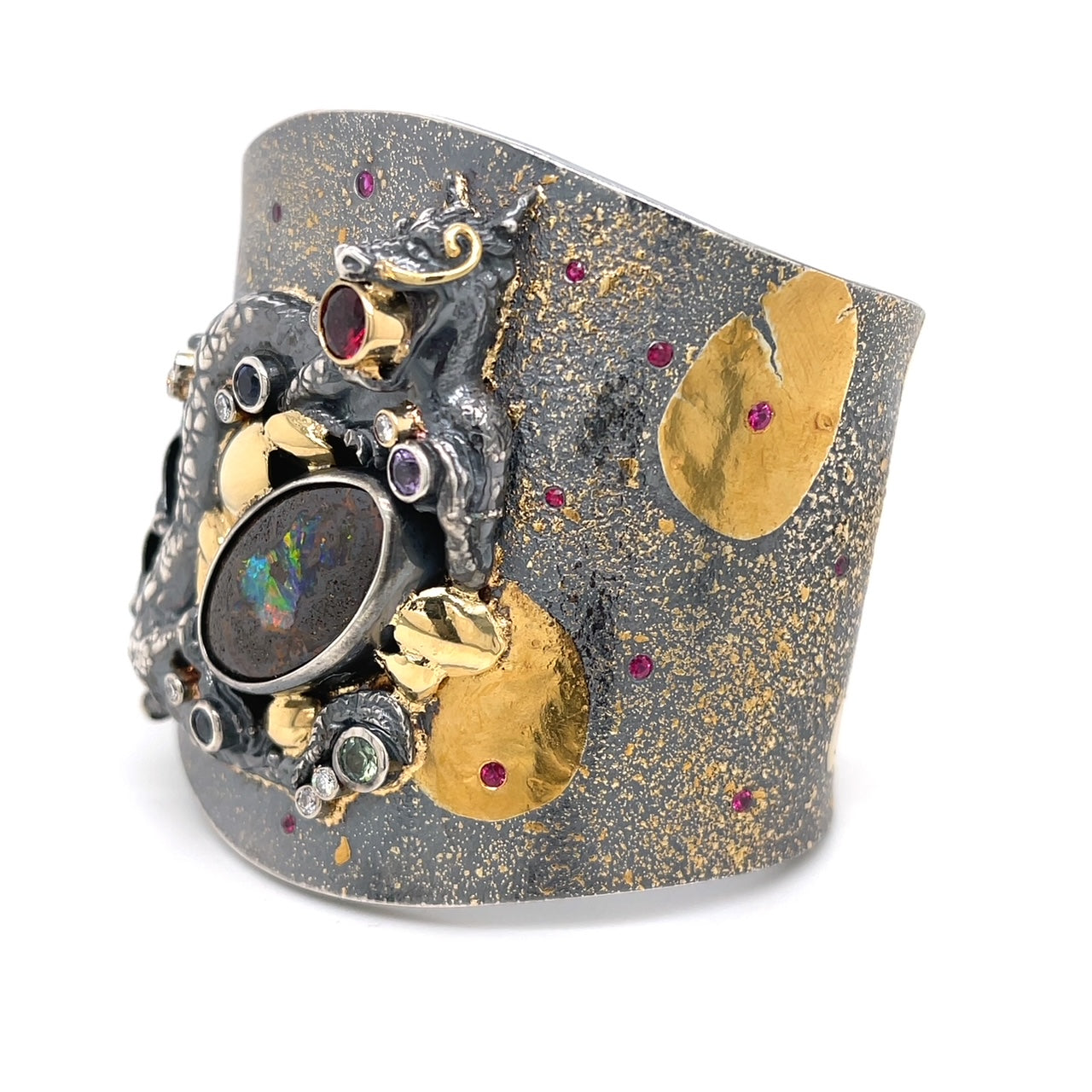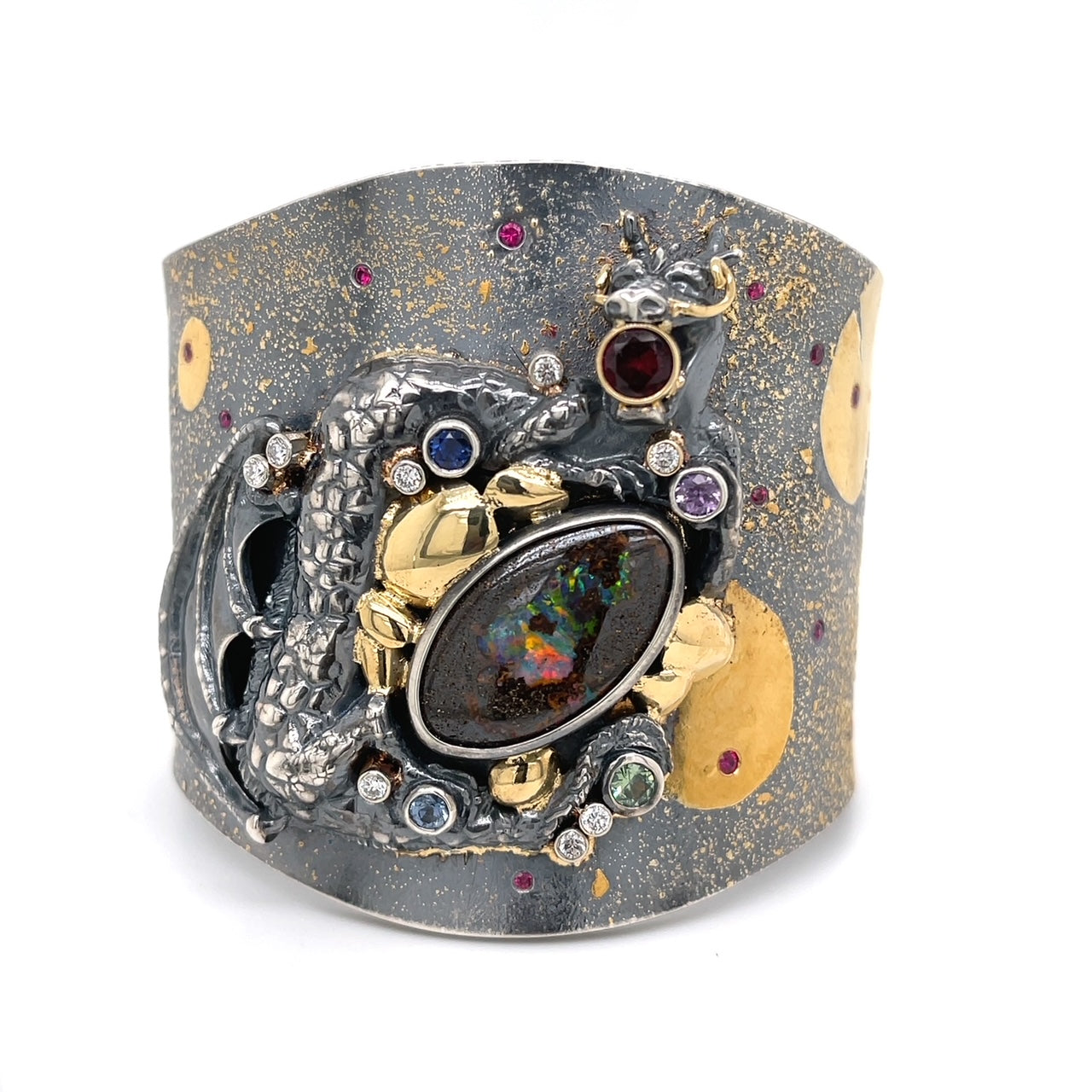 An oxidized sterling silver, 18k and 22k yellow gold dragon cuff set with one 14.46 carat oval boulder opal, .66 carats of round rubies, .21 carats of diamonds, .61 carats of blue, pink, and green sapphires, and one round .85 carat 5.5mm pyrope garnet. This cuff was made and designed by llyn strong.
