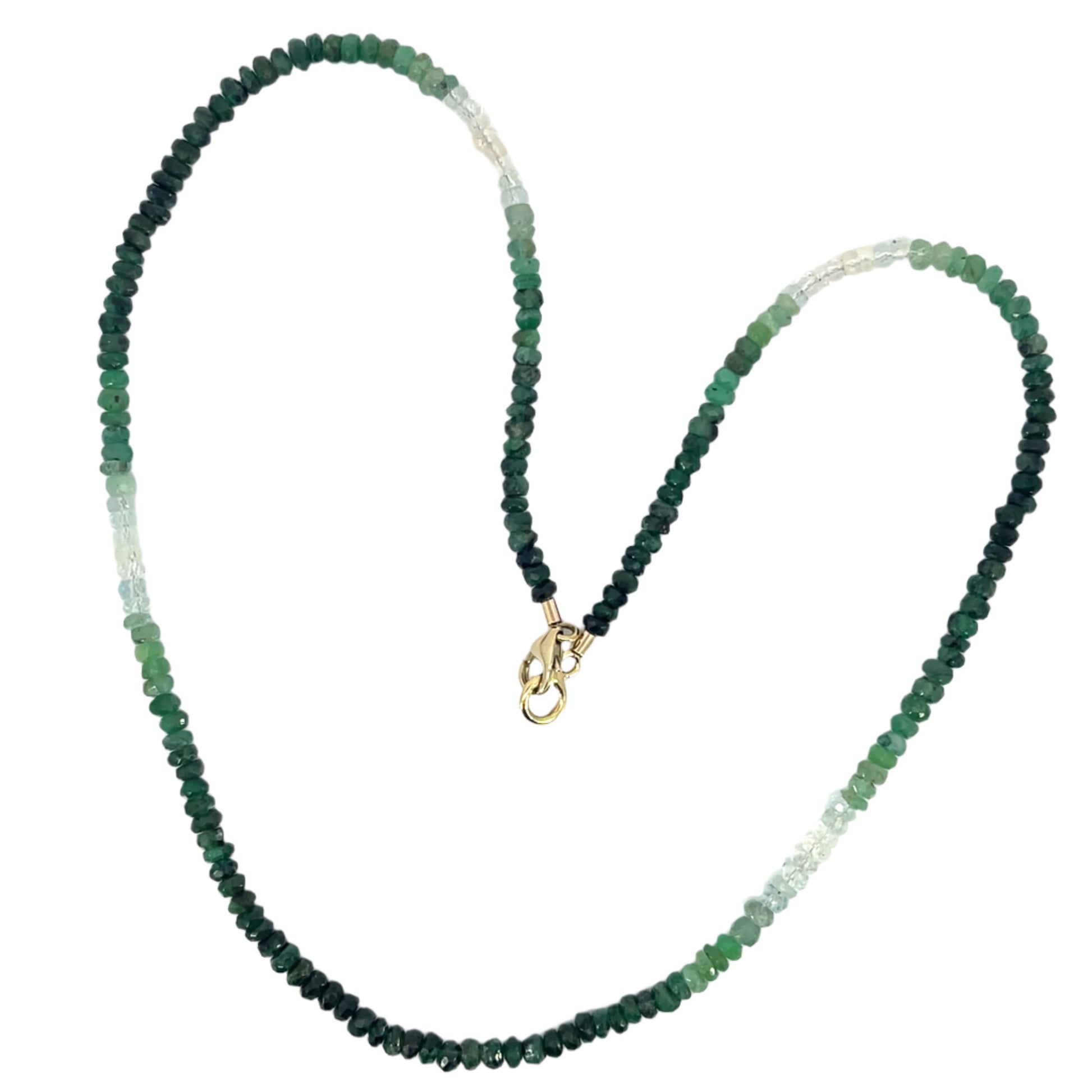 An emerald gradient strand with a yellow gold clasp. 16" long. This necklace was made and designed by llyn strong.
