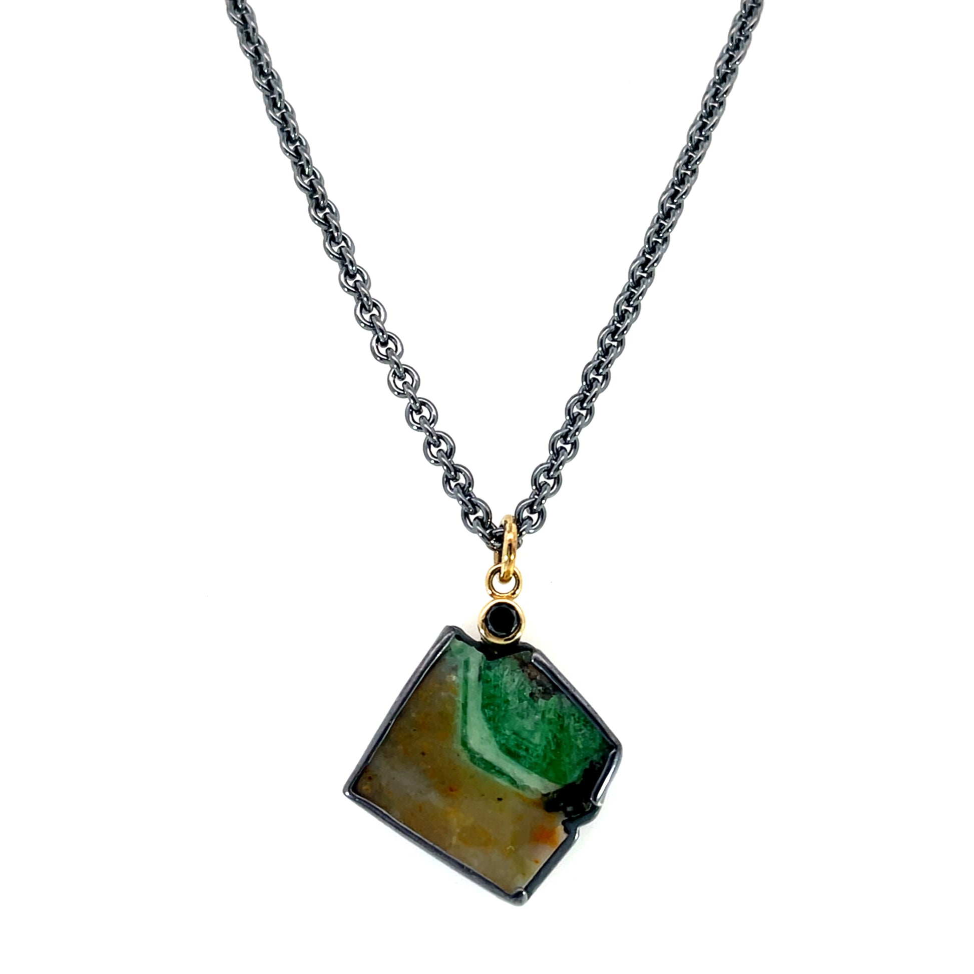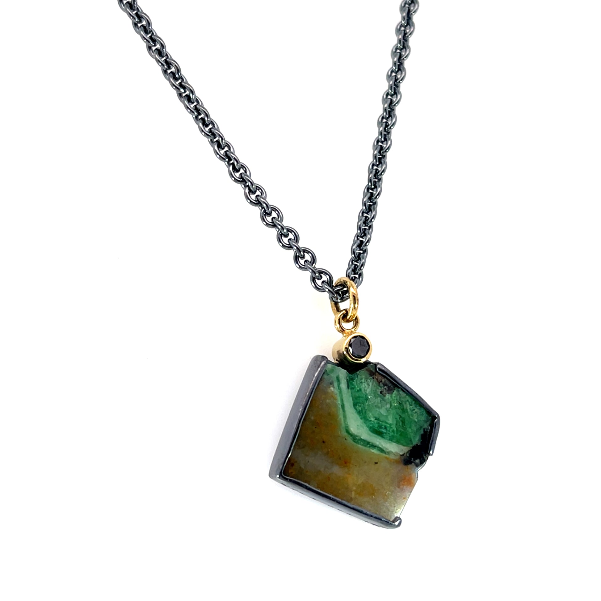 A 12.08ct emerald in matrix and 0.16ct black diamond set in oxidized sterling silver and accents of 18k yellow gold. Pendant only. This pendant was made and designed by llyn strong.