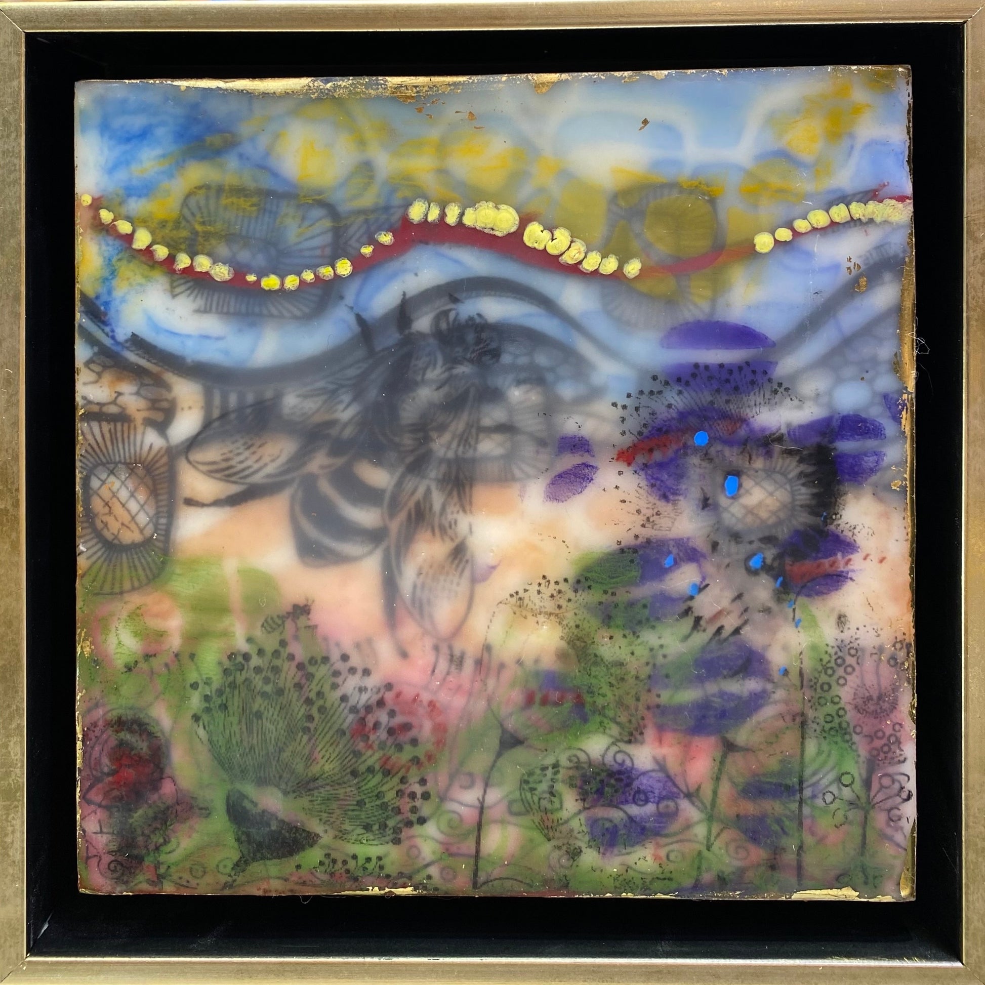 7.25"x7.25"x2.25". "Enchanted Bees 1" is an encaustic and oil pastels painting with gold leaf and ink transfer. This painting was made by llyn strong.
