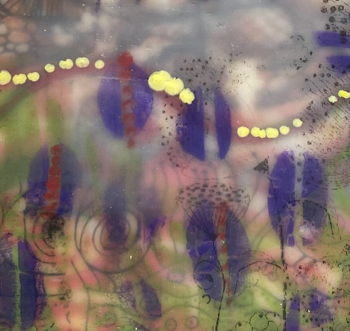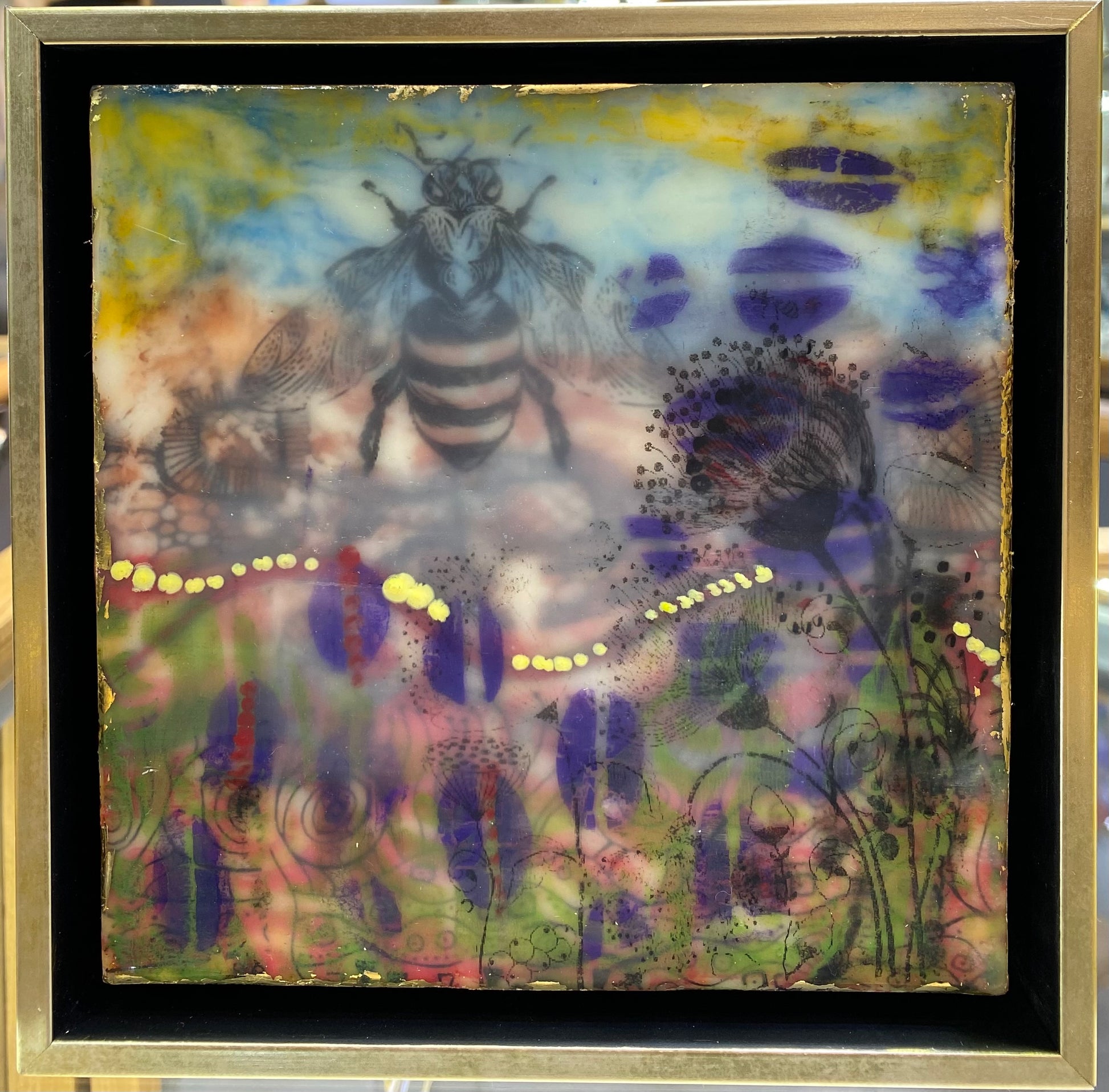 7.25"x7.25"x2.25". Encaustic, gold leaf, oil pastels & ink transfer painting on panel by llyn strong.