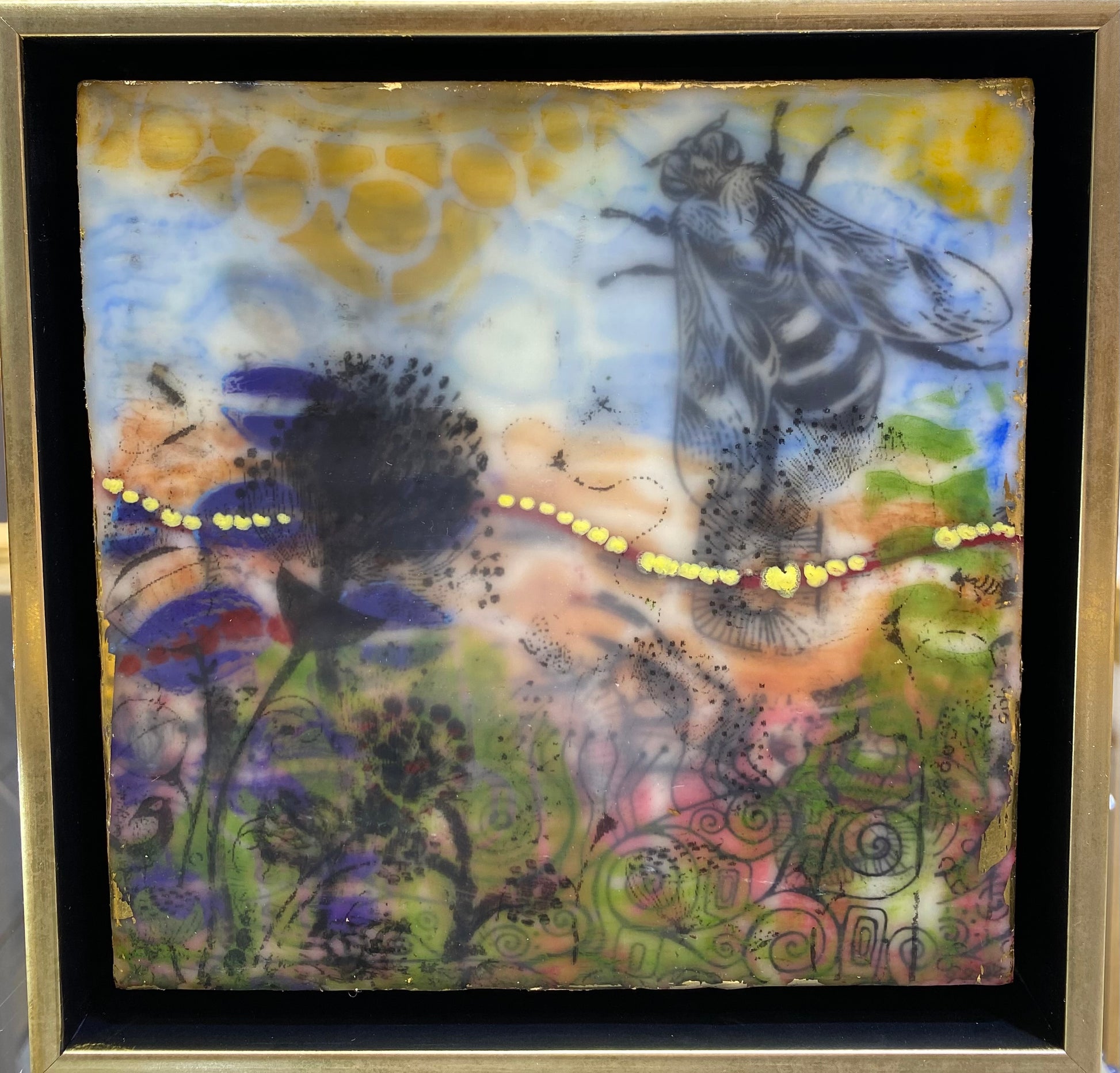 7.25"x7.25"x2.25". Encaustic, gold leaf, oil pastels & ink transfer painting on panel by llyn strong.