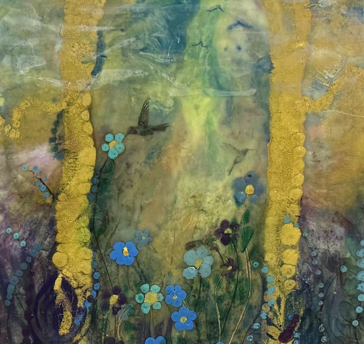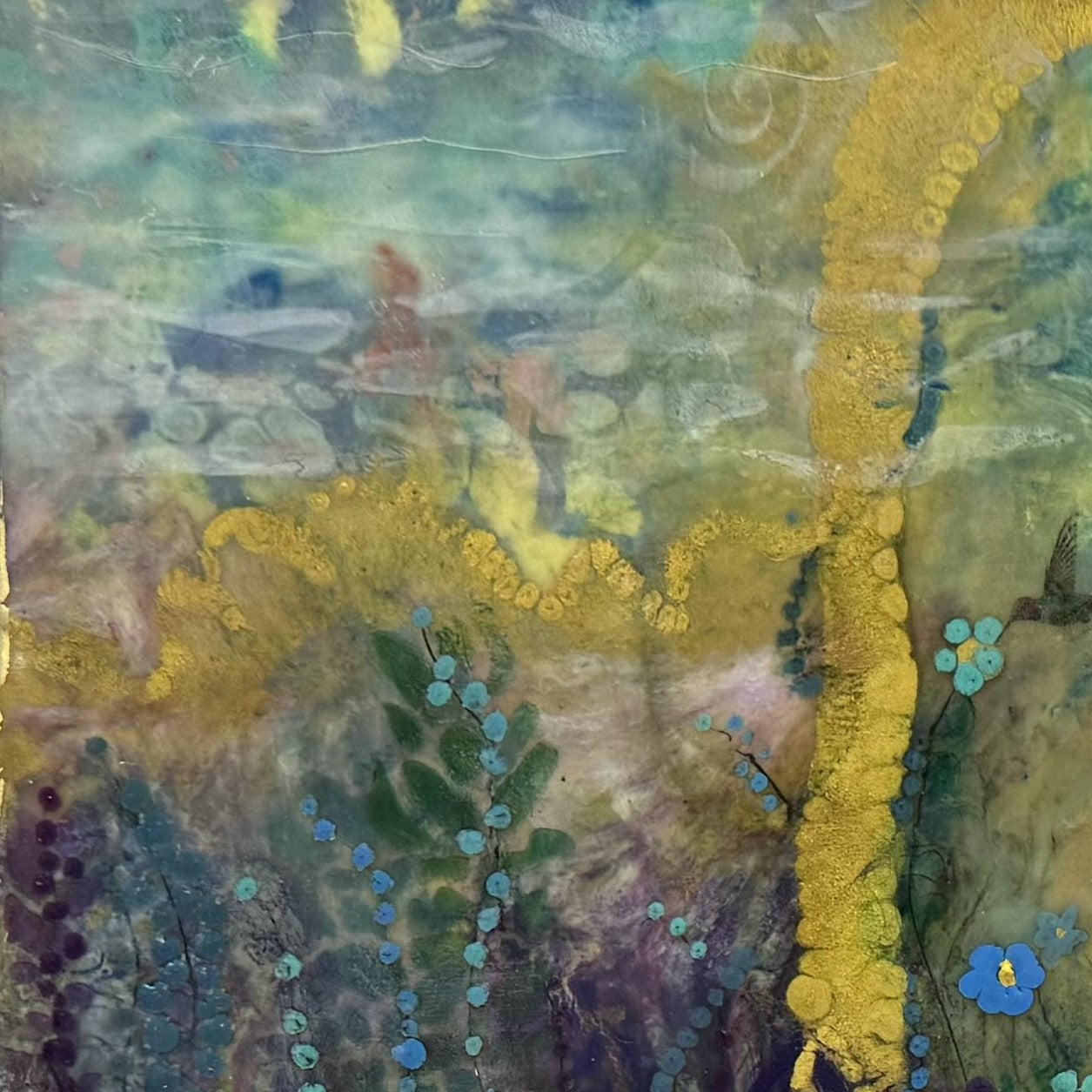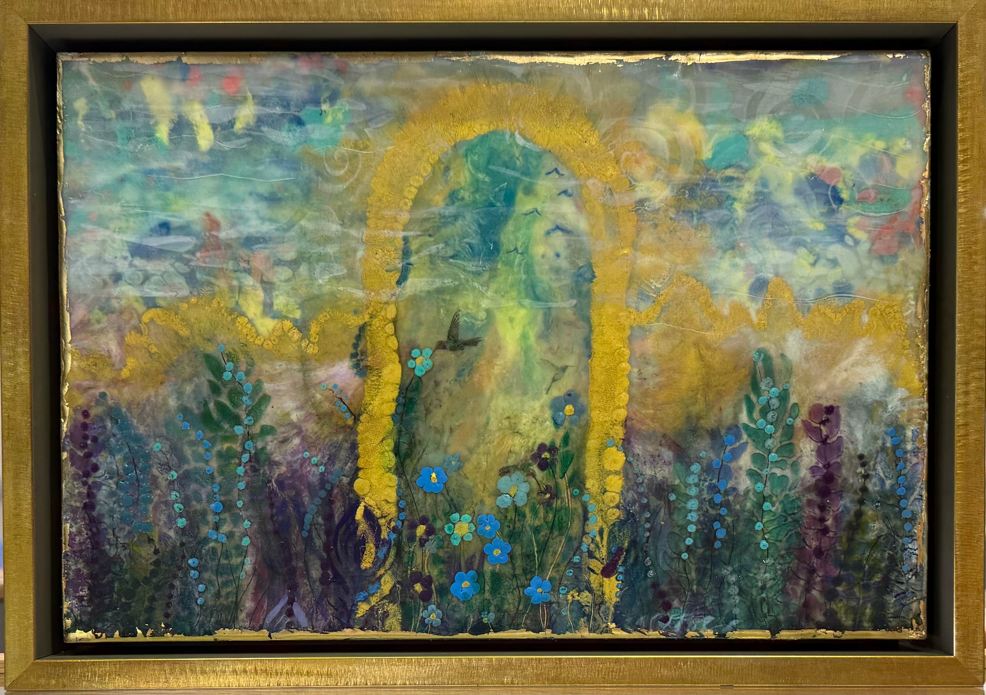 10"x14"x2.25". "Enchanted Portal"" Encaustic, gold leaf, and oils, inks, and pan pastels on panel painting by llyn strong.